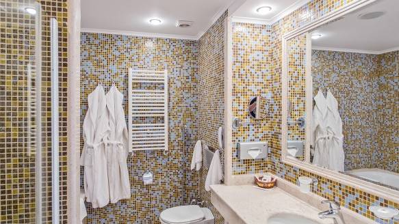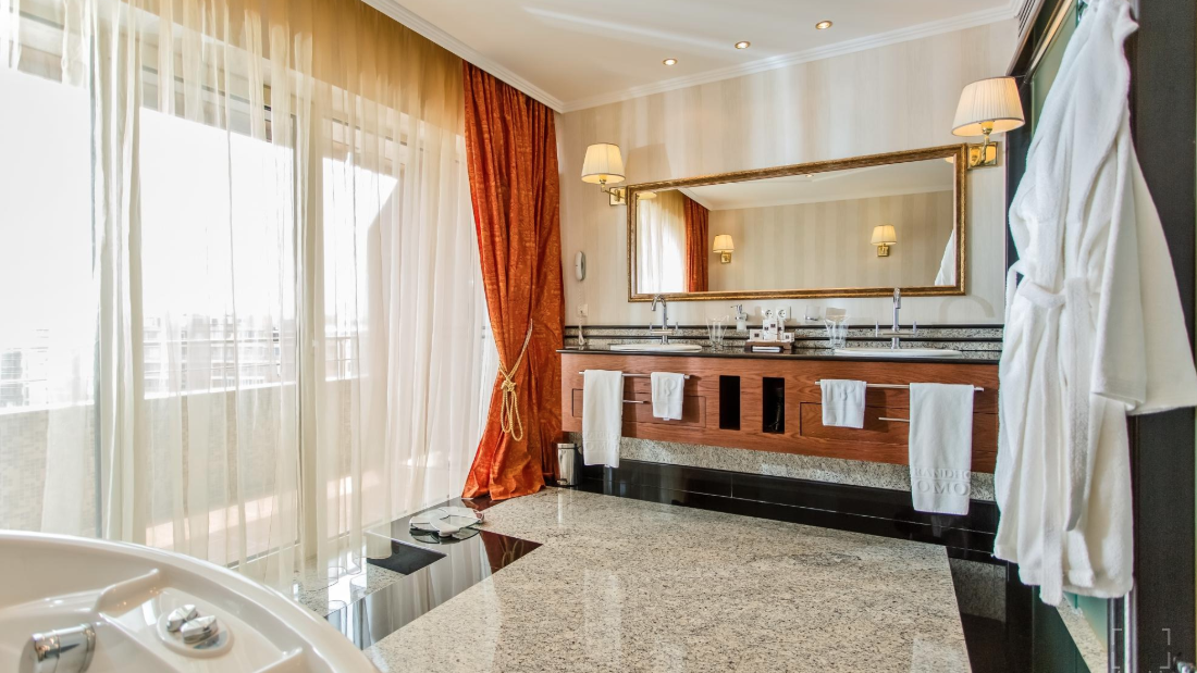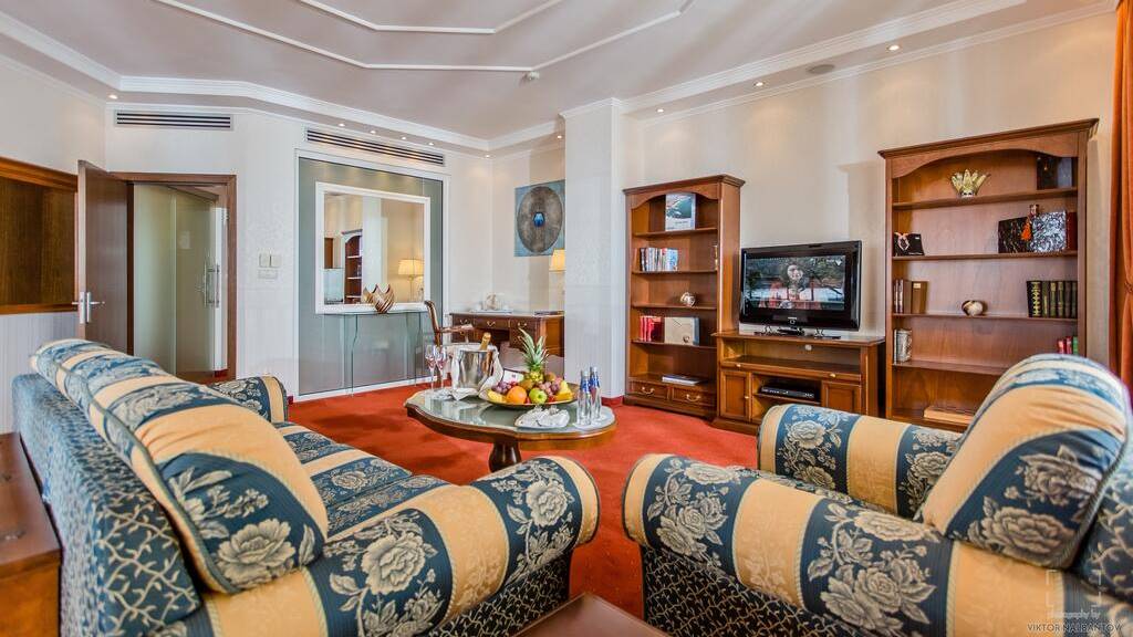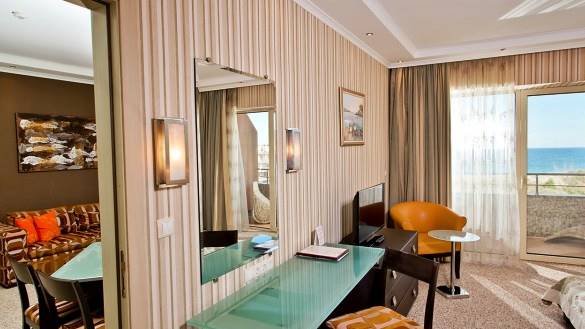 - джуниър суит - Апартаментите джуниър суит тип "студио" са с площ около 30 кв. м. и разполагат с холова част и спалня, които са обединени в едно пространство в стилна атмосфера, баня с хидромасажна вана и душ кабина, сешоар, козметично огледало, тераса с изглед към морето, безплатен интернет достъп, телефон, минибар
