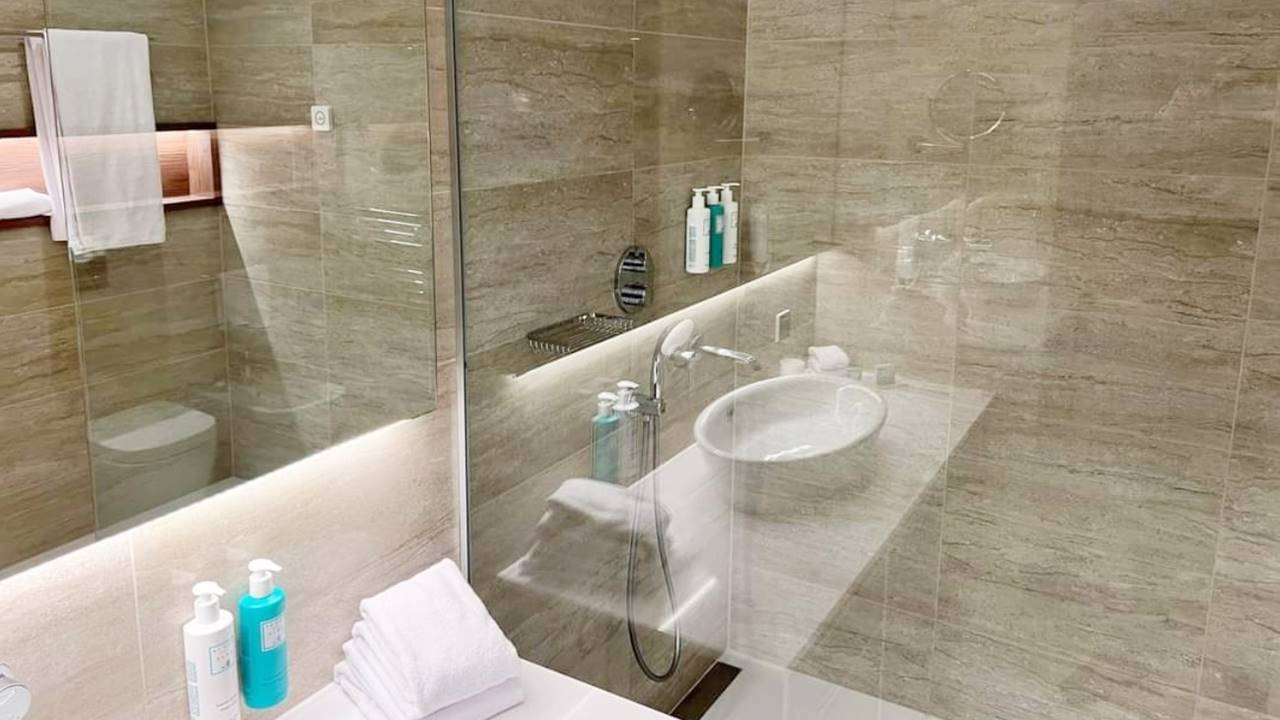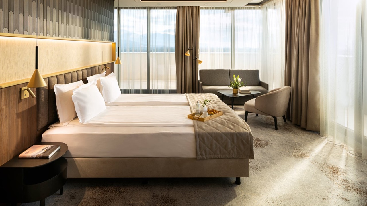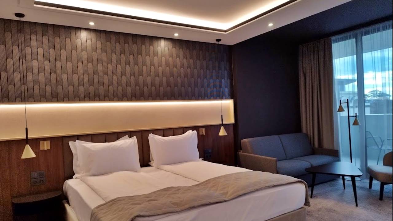 - Едноспален апартамент с балкон - Две отделни помещения спалня с двойно легло и хол с разтегателен диван. Площ около 85 кв.м и разполага с отделна трапезария с хол, просторна баня с голяма душ кабина, биде, голям балкон, специално сезонно зареждане и бутилка вино професионален сешоар, премиум хотелска козметика от водещия италиански бранд “Acqua dell’Elba”, минибар, кафе машина Nespresso, термокана, сейф, 55” телевизор с интерактивна хотелска телевизионна система, климатизация с индивидуално контролиране на температурата, сушилник за балкон
