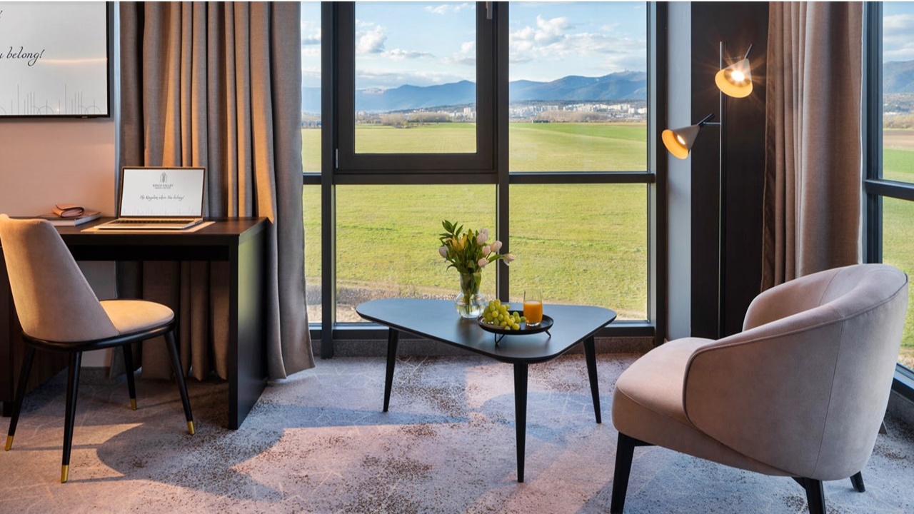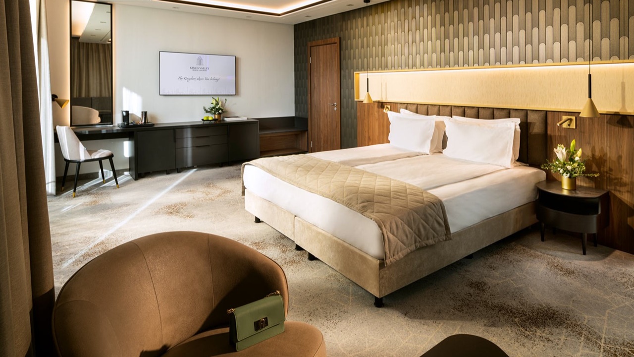 Интериорът на Kings’ Valley Medical & Spa Hotel 5* е създаден, за да провокира усещането за пълна релаксация и да предизвика ума да се разтовари от натрупания стрес и да си позволи лукса от цялостно разтоварване. Вътрешната част на хотела следва актуалните интериорни тенденции и съчетава непреходна елегантност, стилен дизайн и максимален комфорт с удобство и функционалност. Общите помещения завладяват ума с интригуващи форми, цветове и мотиви, а светлите и просторни стаи носят усещането за свобода, дискретност и интимност. Хотелът разполага с 244 елегантни стаи и 22 широки апартамента. Помещенията са оборудвани с всичко необходимо за пълноценен релакс извън града, а меките, пастелни цветове на интериора допринасят за цялостното отпускане на сетивата. В комбинация със спиращите дъха гледки към Стара планина и Средна гора всяка стая е релаксиращо убежище от ежедневния градски стрес.