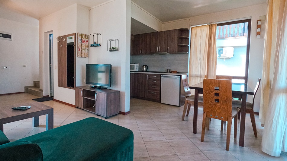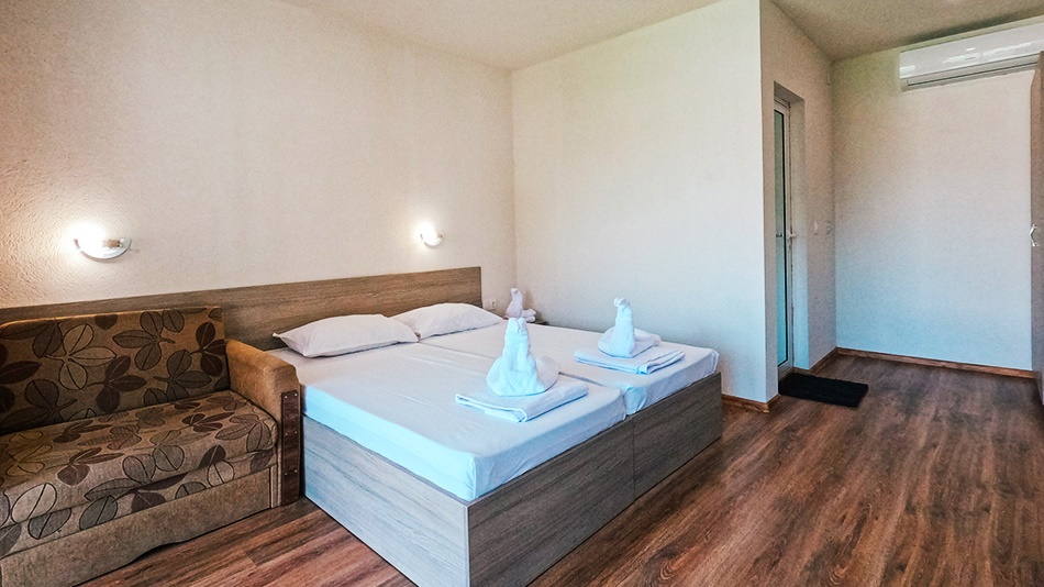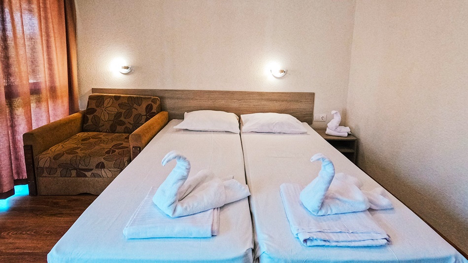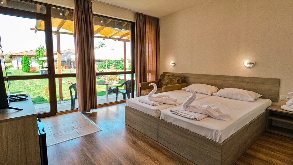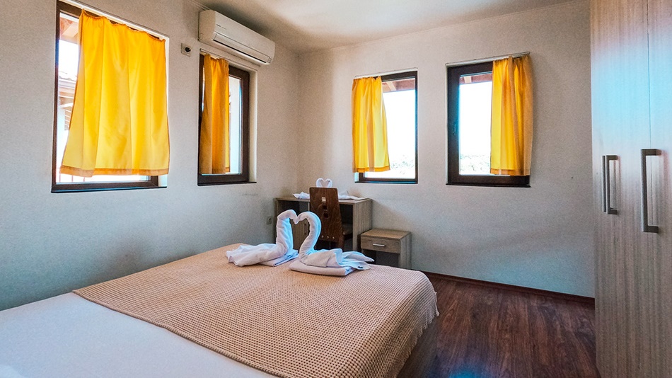 - Комплексът разполага с 6 самостоятелни стаи в Хотелска част, всяка от тях разполага с баня и тоалетна, две легла, които могат да се събират, телевизор, кабелна телевизия, гардероб, нощни шкафчета, маса, столове, климатик, кана за топла вода. Двойните стаи не разполагат с място и опции за готвене. - временно не се предлагат