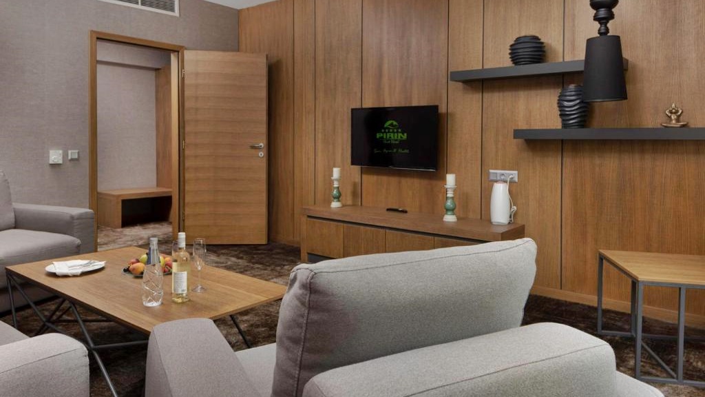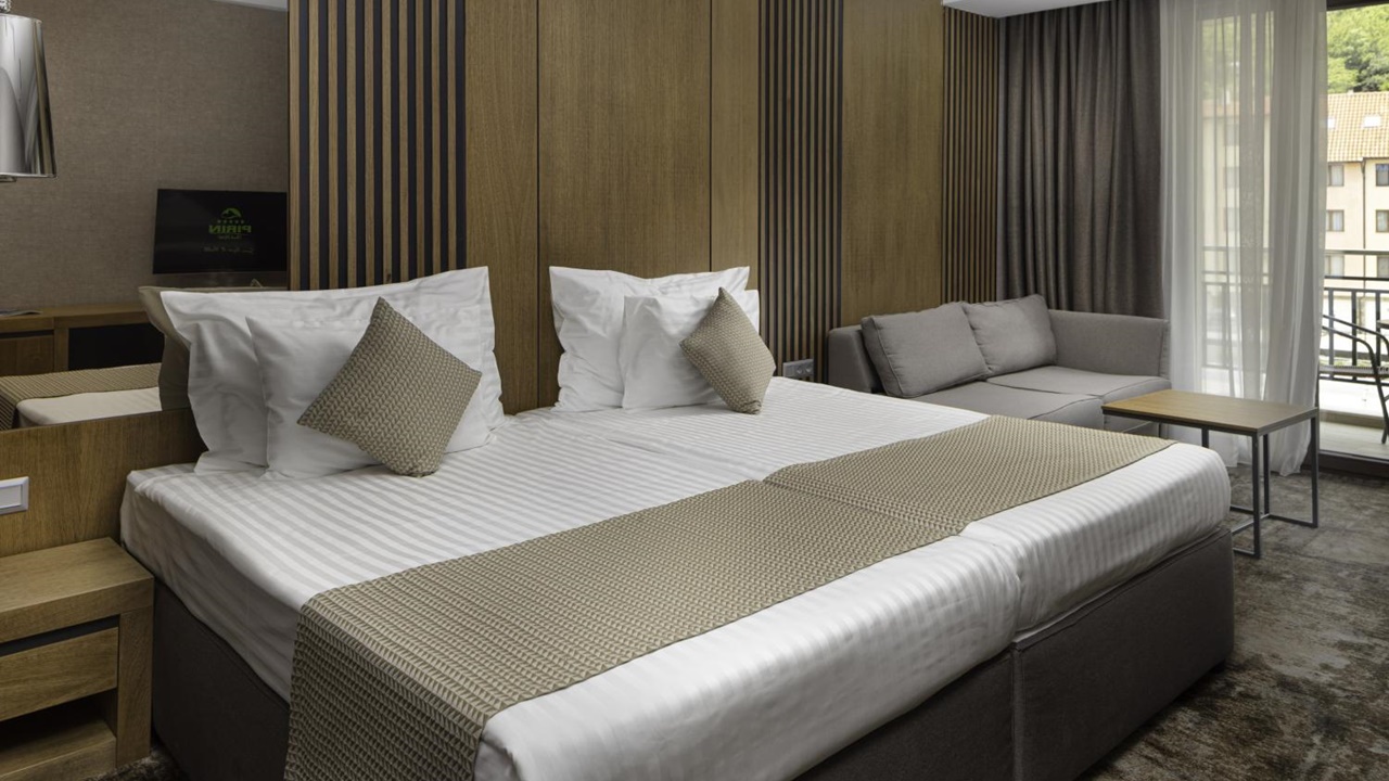 - Апартамент ВИП - Хотелът предлага настаняване в 4 ВИП апартамента с изискано и уютно обзавеждане. От терасата на ВИП апартамента може да се насладите на прекрасната гледка към величествената Пирин планина или успокояващия ромон на река Санданска Бистрица. Размерът на този тип апартаменти е 61 кв.м. Всеки ВИП апартамент разполага със спалня и просторна дневна, в които могат да бъдат настанени двама души на редовни легла и трети човек на допълнителен диван.