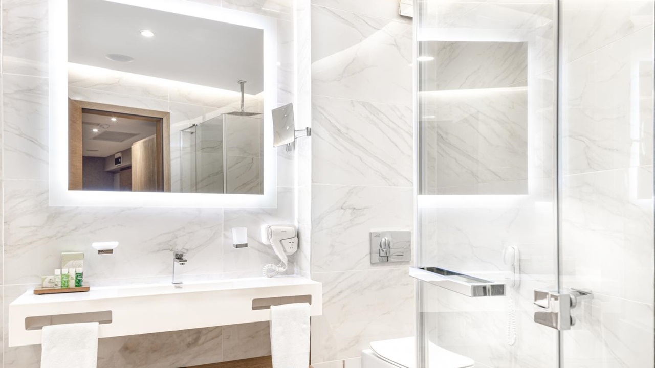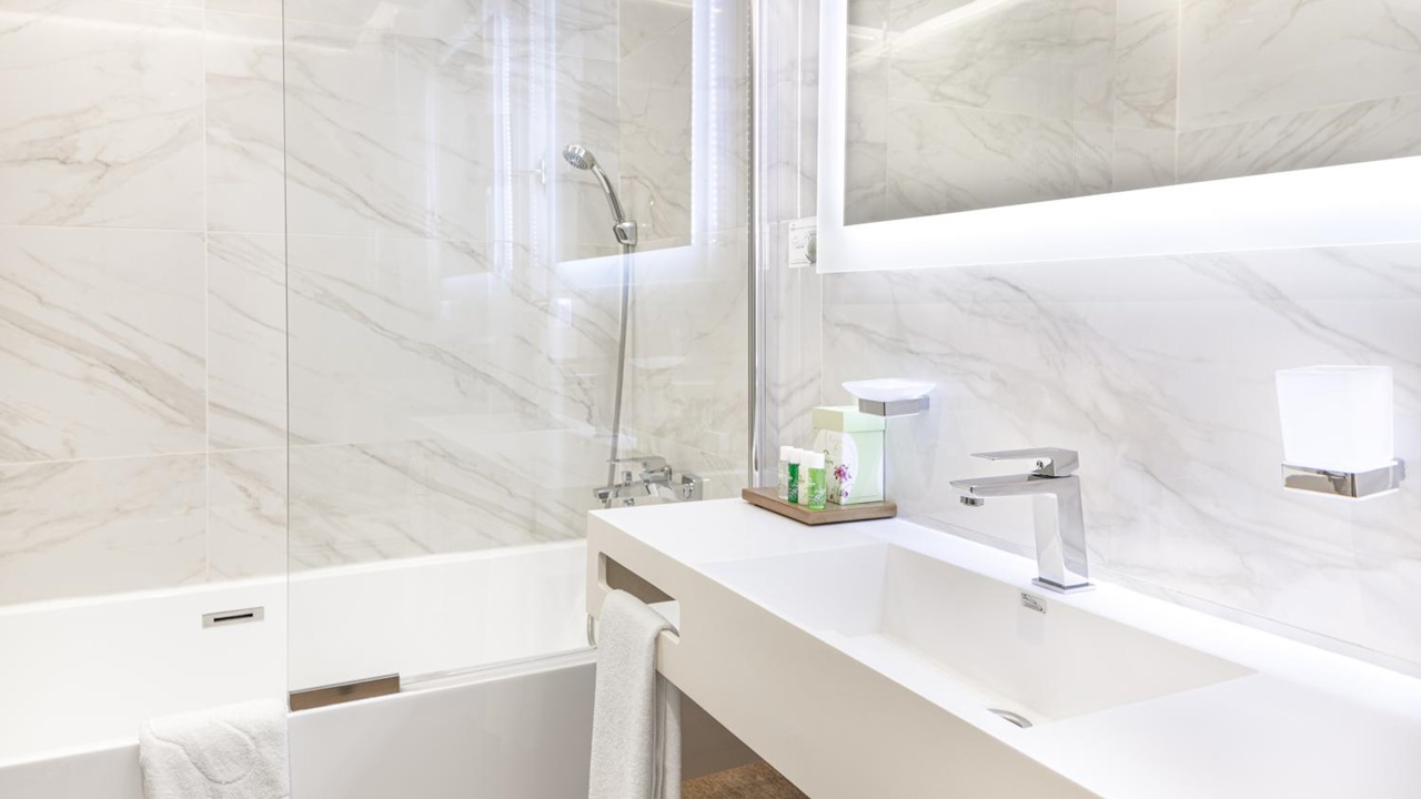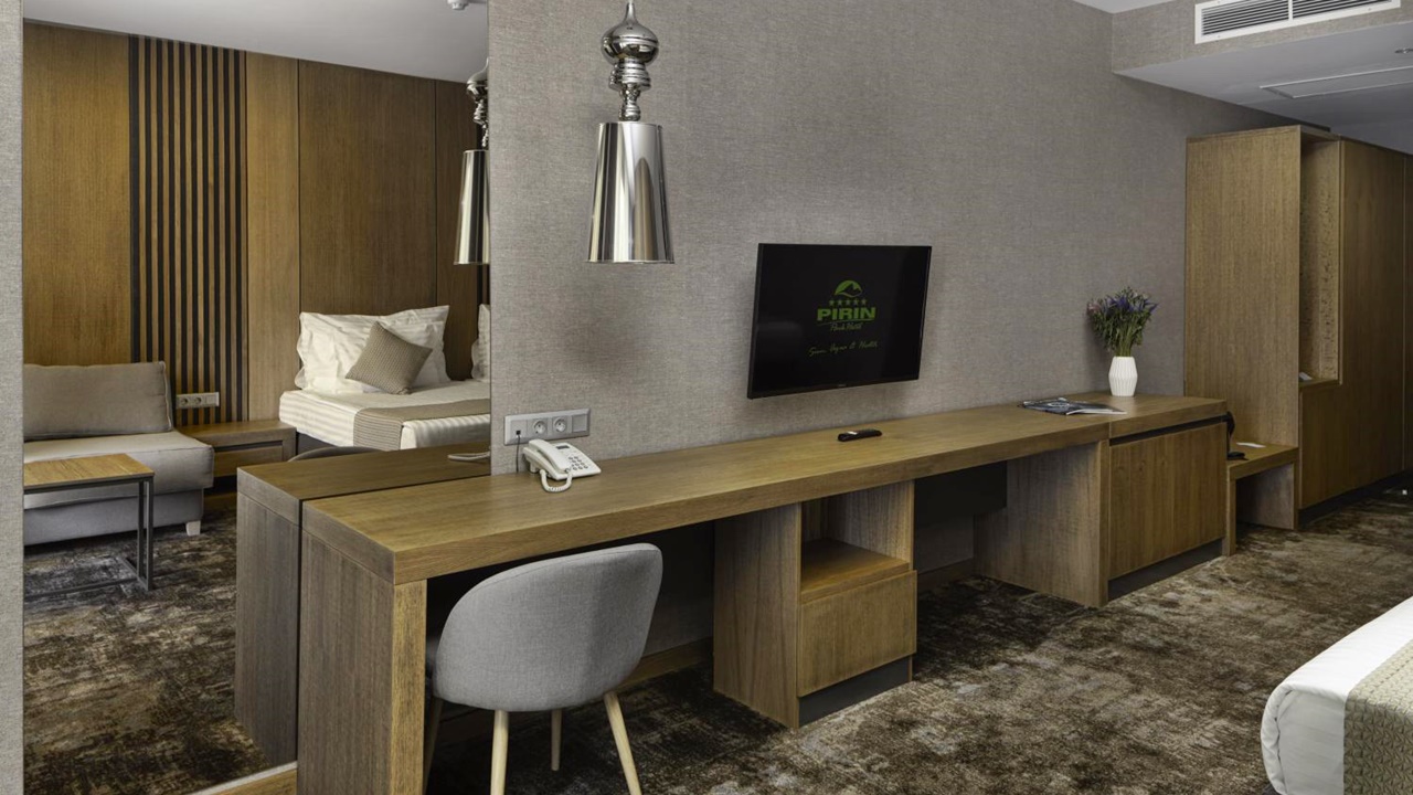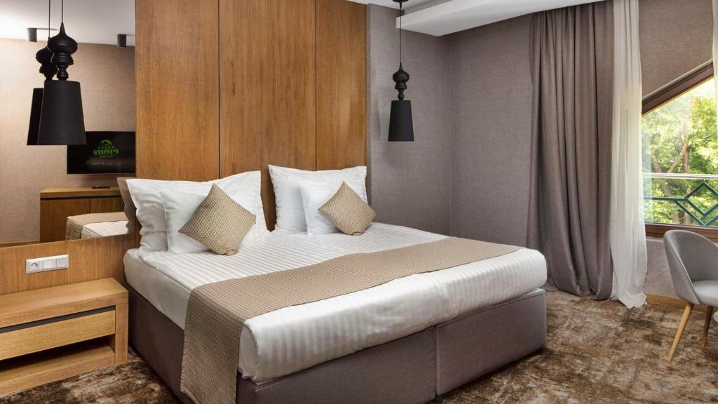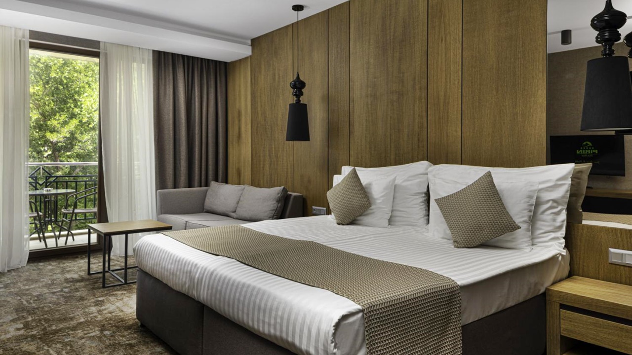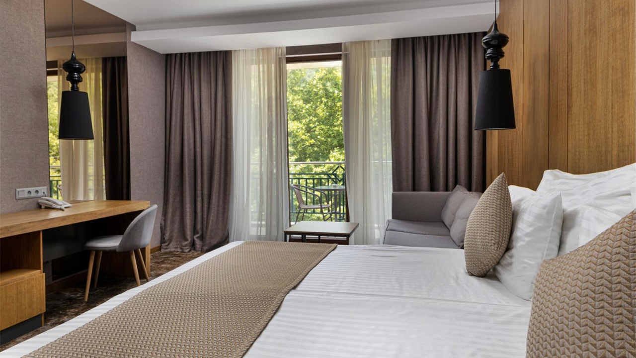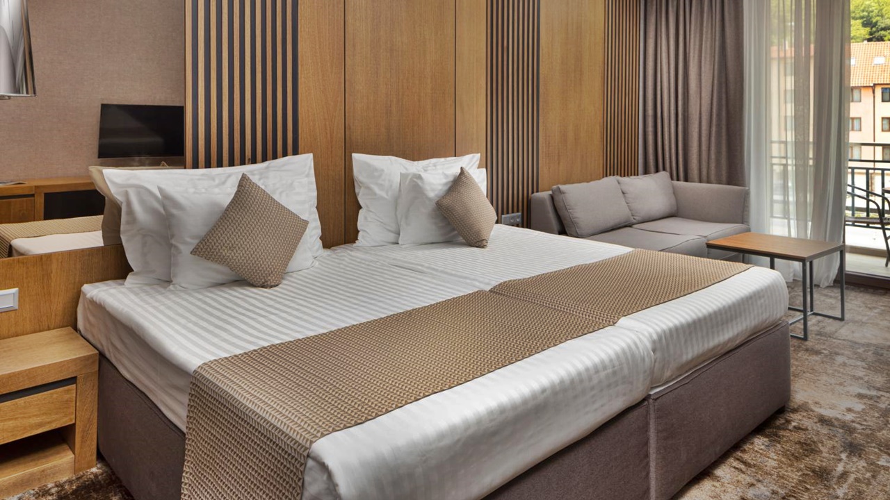 - Двойна стая Супериор - Хотелът разполага с 26 двойни стаи "супериор" с две отделни легла (TWIN) и 28 просторни двойни стаи "супериор" със спалня (DBL). Стаите са просторни и елегантни, размерът им е 35 кв.м. Гледката може да бъде към паркинга или към живописната река Санданска Бистрица. Всички стаи супериор разполагат с вана и душ кабина. Съвременният и модерен дизайн ще ви потопят в комфортна и уютна атмосфера, където ще усетите топлината на Вашия Дом далеч от дома. В супериорните стаи има възможност за настаняване на трети човек или 2 деца на разтегателен диван или бебешка кошарка.