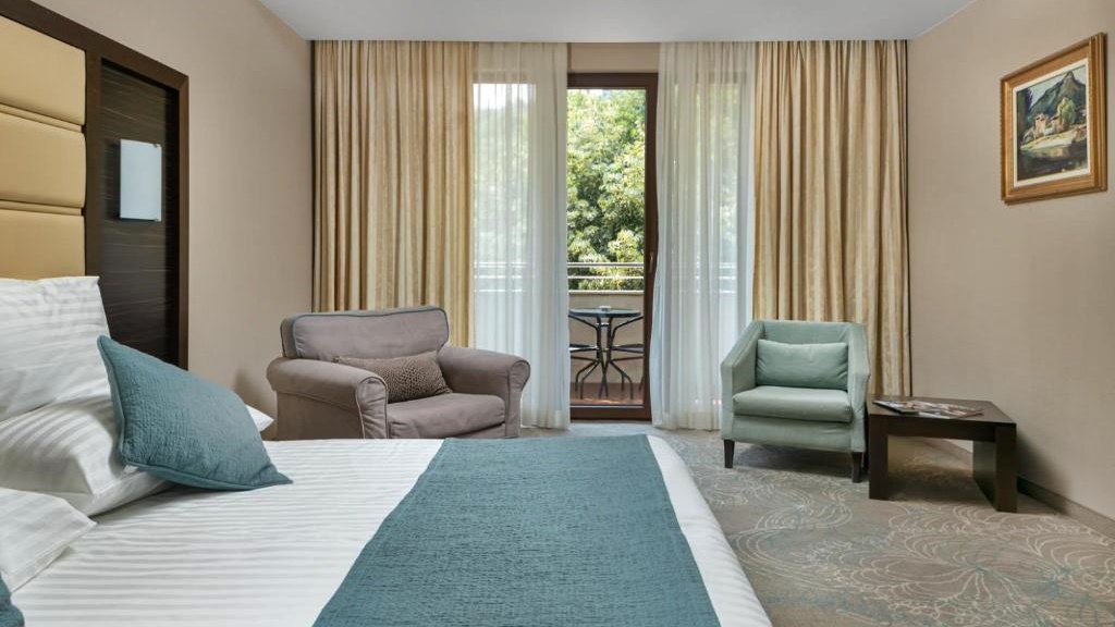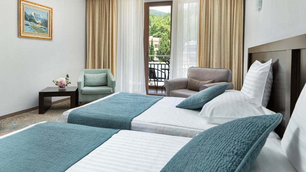 - Двойна стая Лукс - Хотелът разполага с 69 просторни двойни стаи "лукс" с две отделни легла (TWIN) и с 51 просторни двойни стаи "лукс" със спалня (DBL). Разполагат и с допълнително разтегаемо легло. Размерът на луксозните ни стаи е 34 кв.м. Гледката от двата типа стаи може да бъде към живописната река Санданска Бистрица, а към вътрешния двор на хотела или към басейна могат да гледат само стаите с отделни легла. Всички стаи лукс имат балкон, вана и душ кабина.