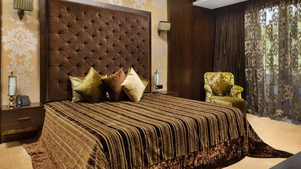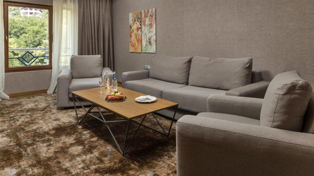- Апартамент Президентски - Хотелът разполага с 2 елегантни президентски апартамента. От терасата на президентските апартаменти може да се насладите на величествената Пирин планина или да се отпуснете под приятните звуци на ромона на река Санданска Бистрица. Всеки президентски апартамент разполага с две спални, дневна и три санитарни възела. Размерът на Президентските ни апартаменти е 91 кв.м. Предлага се настаняване на четирима души на редовно легло и на пети човек на разтегателен диван в дневната.