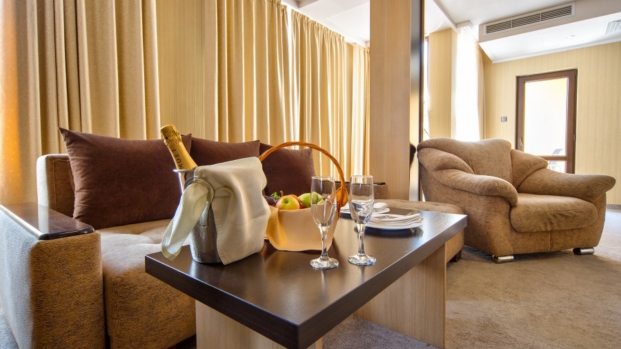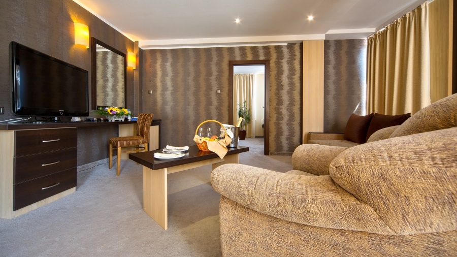 - Всички стаи имат балкон, оборудван с масичка и столчета. Помещенията са уютно обзаведени и разполагат с централна климатизация, LCD телевизор с интерактивна телевизия, мини бар и собствен санитарен възел с душ кабина или вана и сешоар.