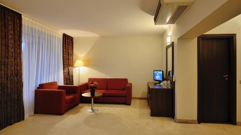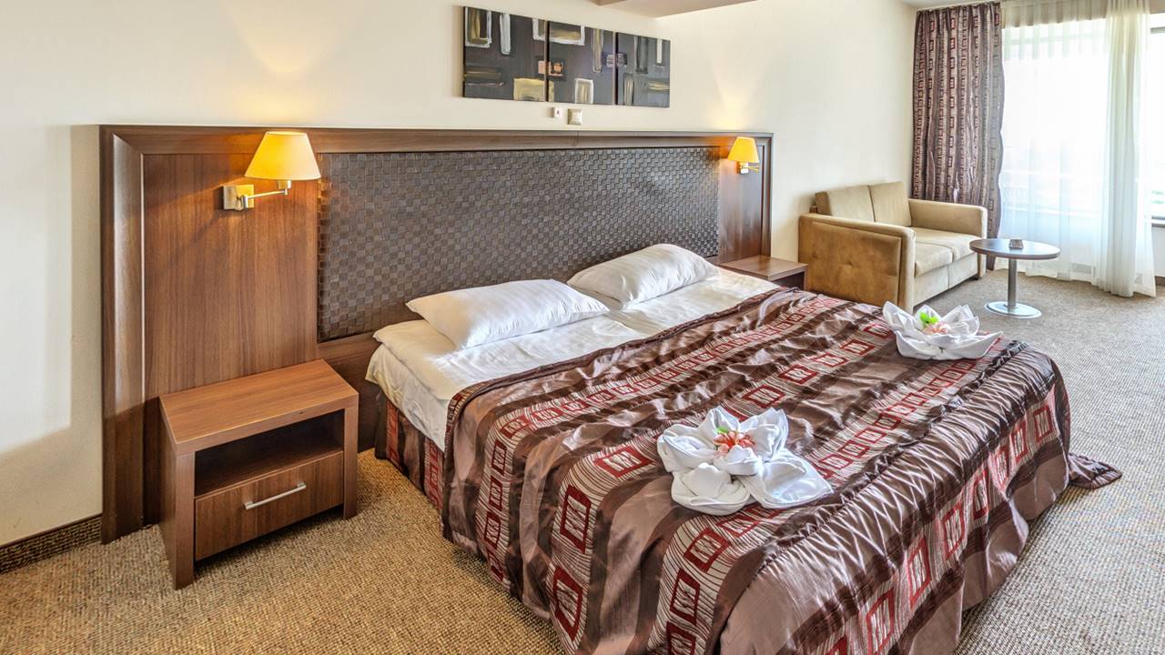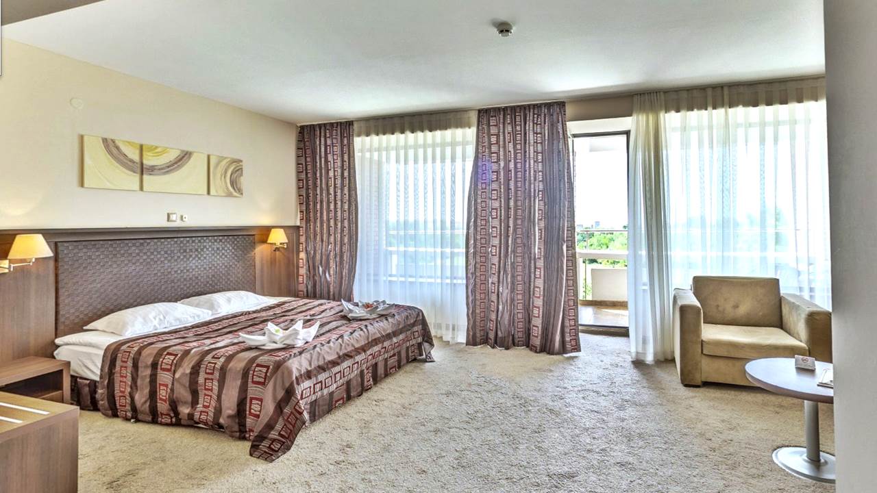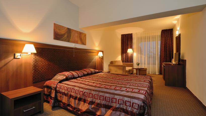 - двойна стая Делукс с балкон - Стаята е с площ 33.5 кв.м. и разполага с двойно легло (спалня), разтегателен диван, санитарен възел с вана, халат за баня с чехли, сешоар и козметика, телефон, LCD телевизор със сателитна телевизия, WiFi, централна климатизация с индивидуален контрол, сейф, брава с магнитна ключ-карта, балкон