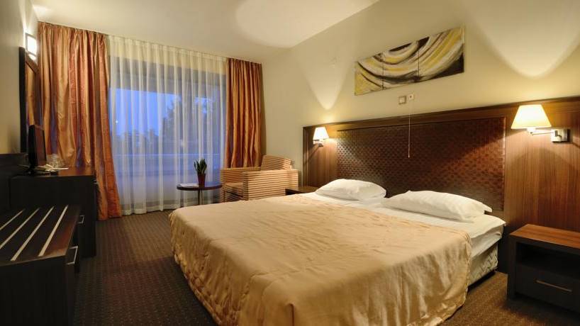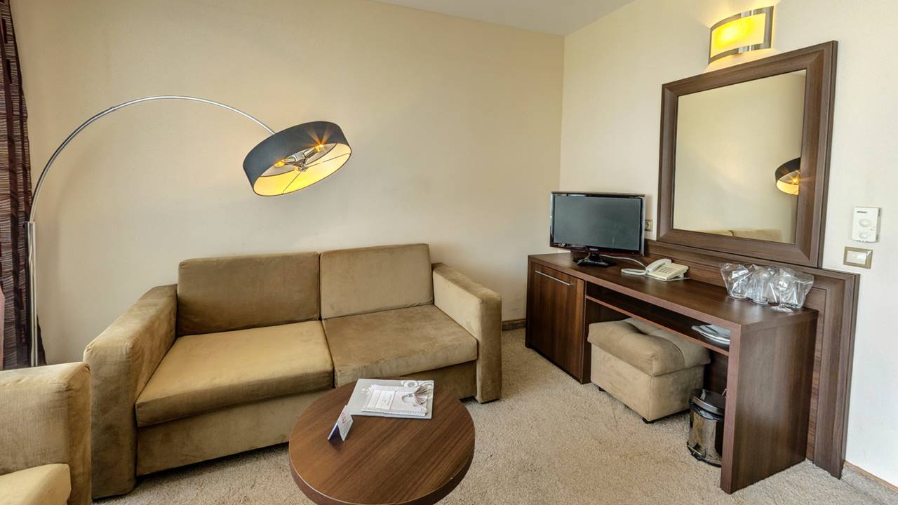 - Промо стая Делукс без балконСтаята е с площ 33.5 кв.м. и разполага с двойно легло (спалня), разтегателен диван, санитарен възел с вана, халат за баня с чехли, сешоар и козметика, телефон, LCD телевизор със сателитна телевизия, WiFi, централна климатизация с индивидуален контрол, сейф, брава с магнитна ключ-карта