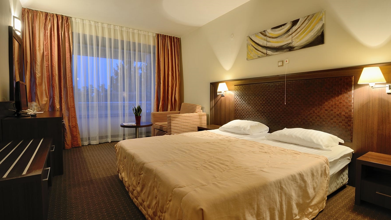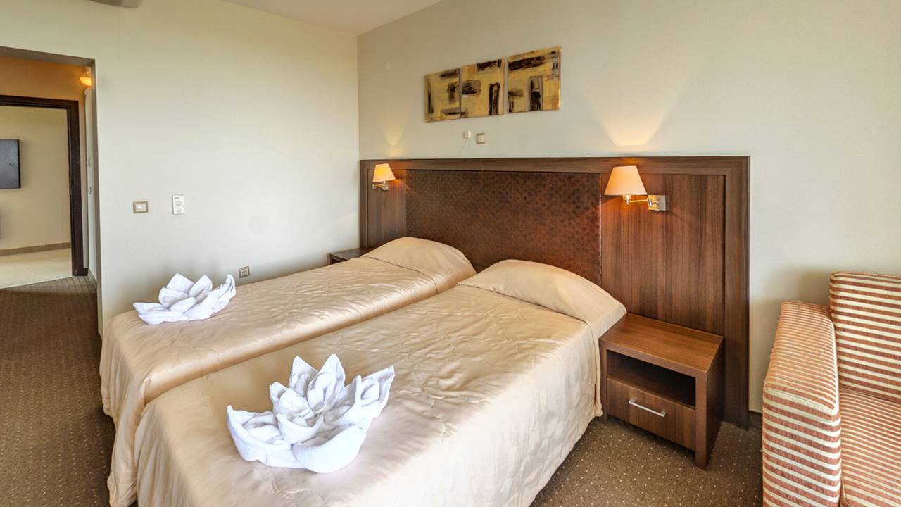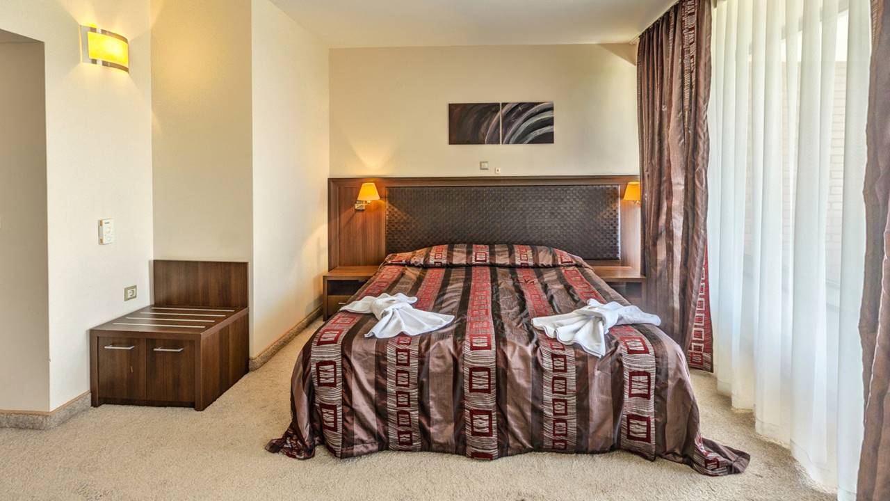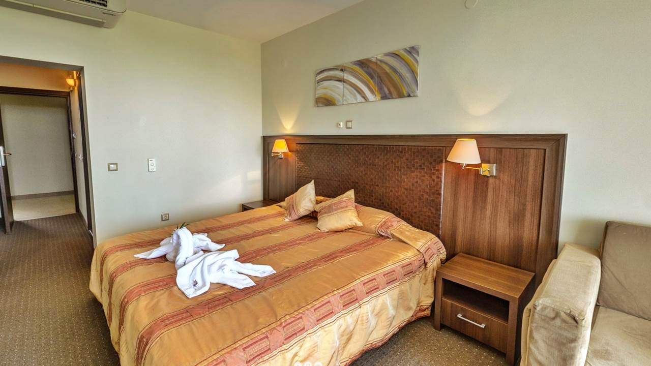 - двойна стая - Стаята е с площ около 22 кв.м. и разполага с двойно легло или две единични, разтегателен фотьойл, санитарен възел с вана, халат за баня с чехли, сешоар и козметика, телефон, LCD телевизор със сателитна телевизия, WiFi, централна климатизация с индивидуален контрол, сейф, брава с магнитна ключ-карта, просторен балкон с южно изложение