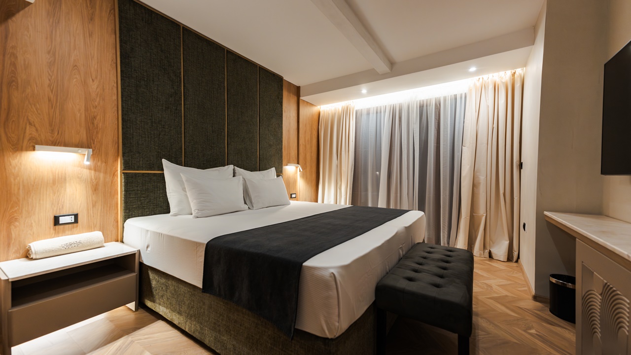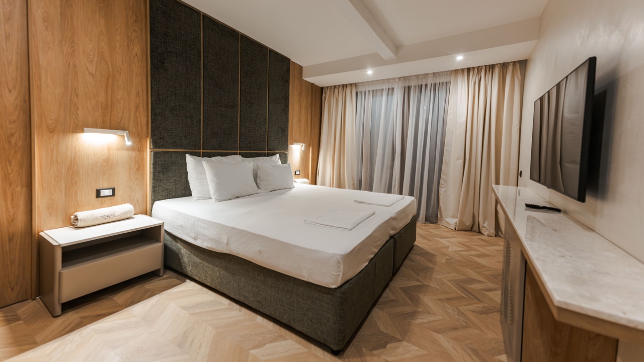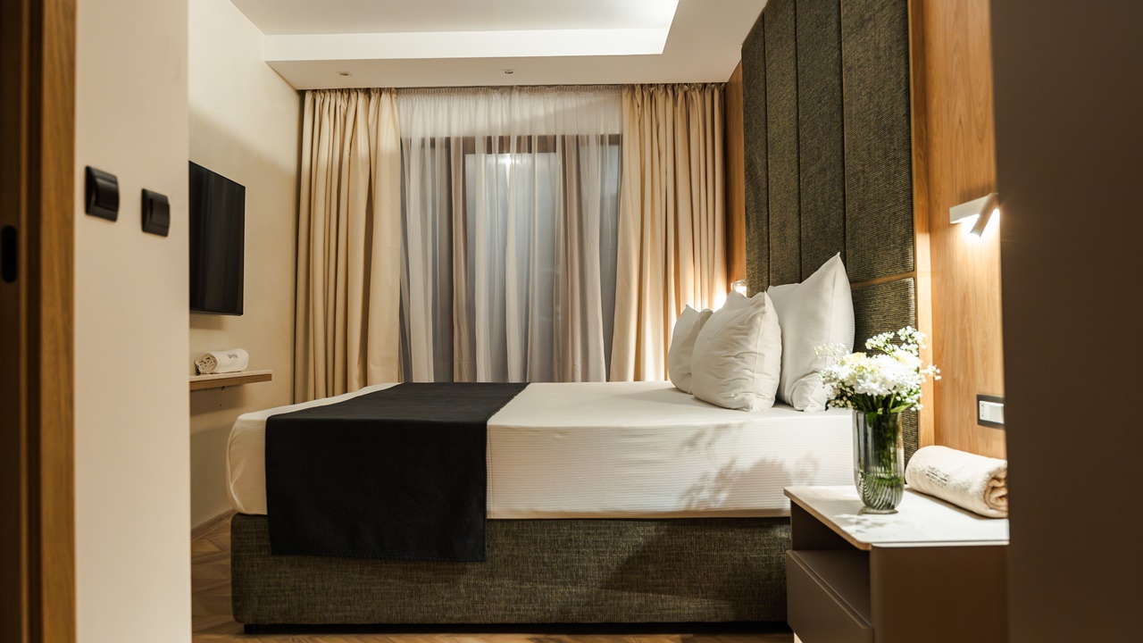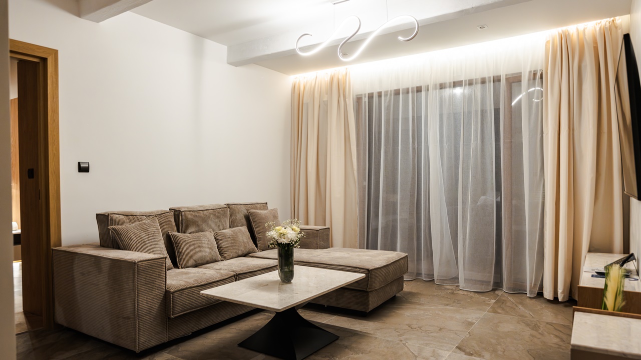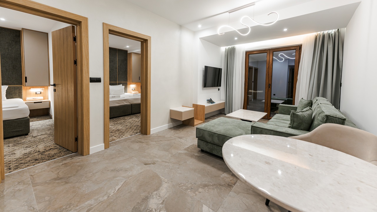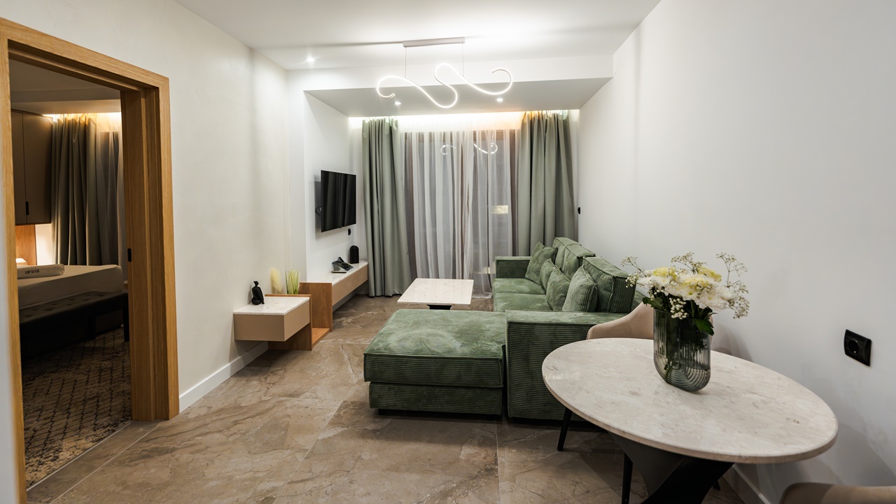 • Всеки апартамент е с площ 95 кв. м. и разполага с 2 двойни легла, разтегателен двоен диван, климатик, отварящи се прозорци, кът за отдих, LED телевизор, мини бар, термокана, кафе и чай комплимент, сейф, телефон, безжичен интернет, сешоар, баня с душ и/или вана, халати, хотелска козметика. Някои апартаменти имат и тераси.