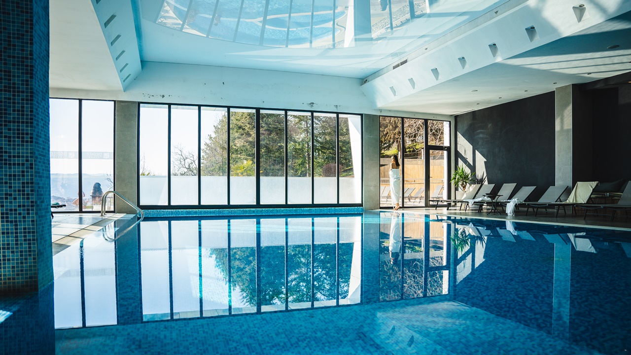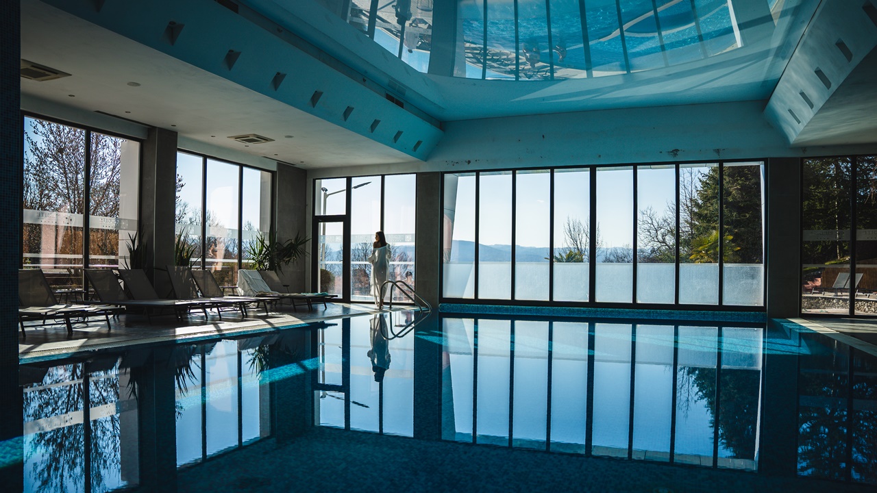 • вътрешен минерален басейн 13 х 9 м., 33°С, дълбочина 1,20м-1,80м.