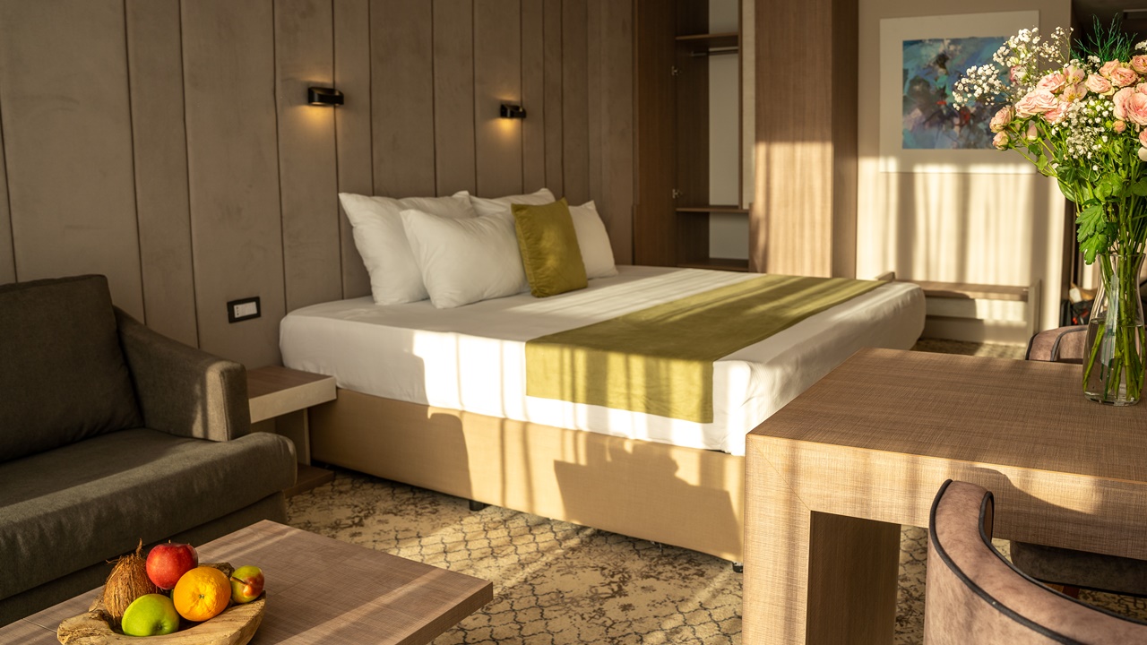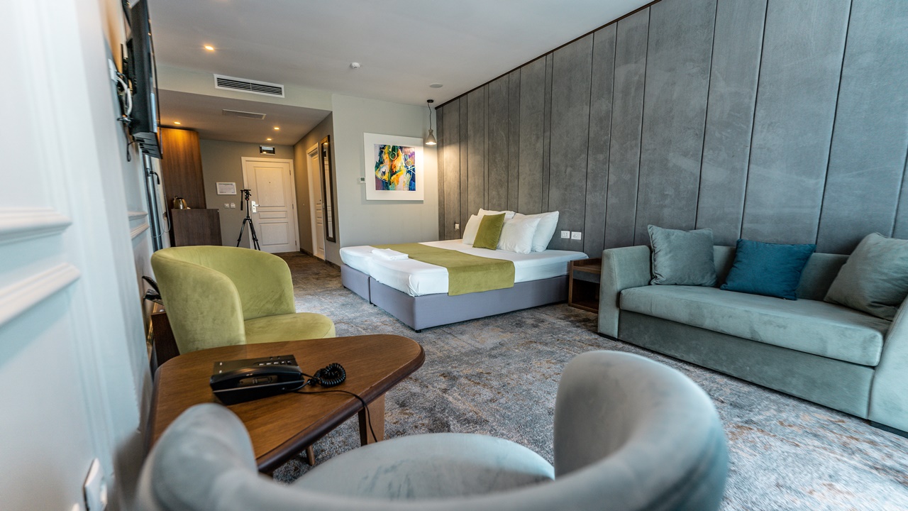 • Джуниър суит е със спецификациите на студио, 40 кв. м. площ и разполага с двойно легло, разтегателен двоен диван, климатик, отварящи се прозорци, кът за отдих, LED телевизор, мини бар, термокана, кафе и чай комплимент, сейф, телефон, безжичен интернет, сешоар, баня с душ и/или вана, халати, хотелска козметика. Помещенията нямат тераси.