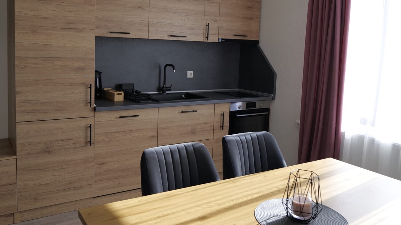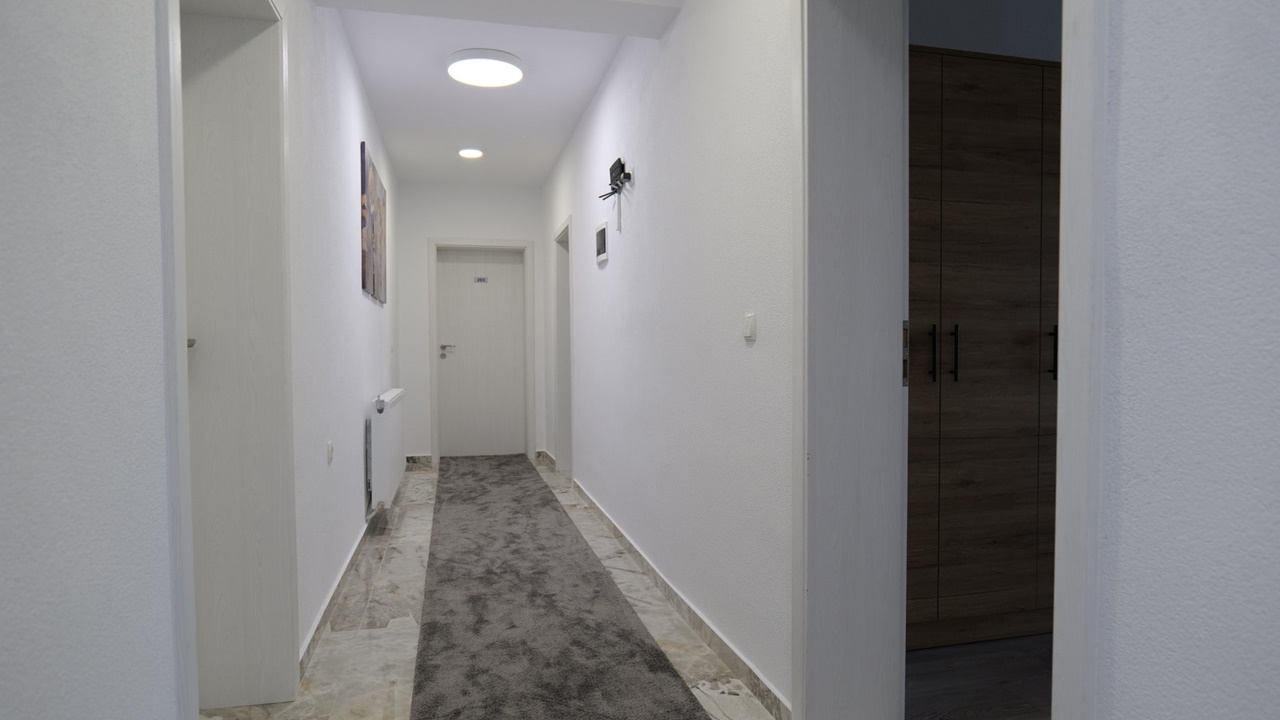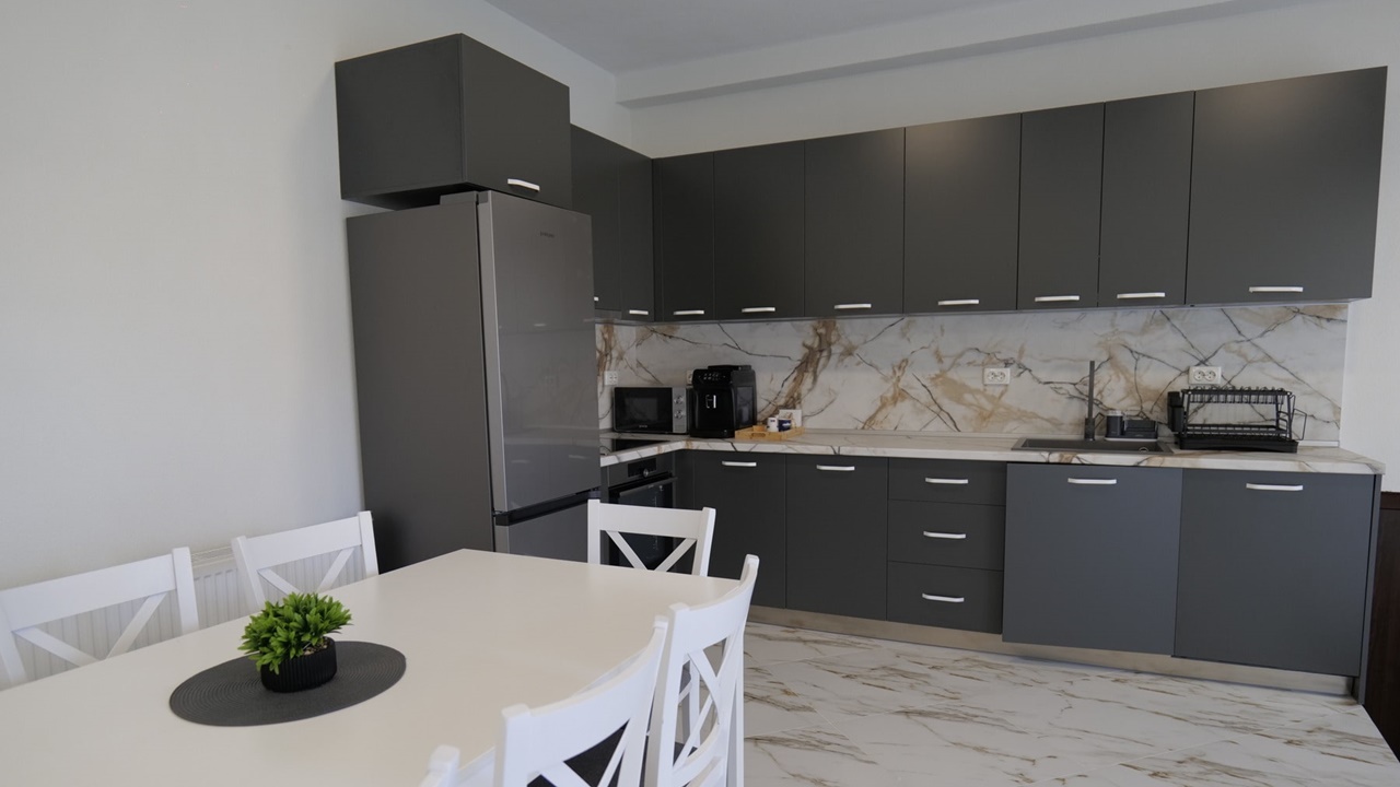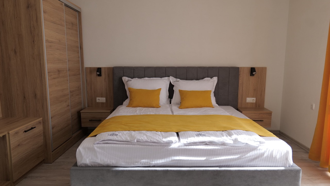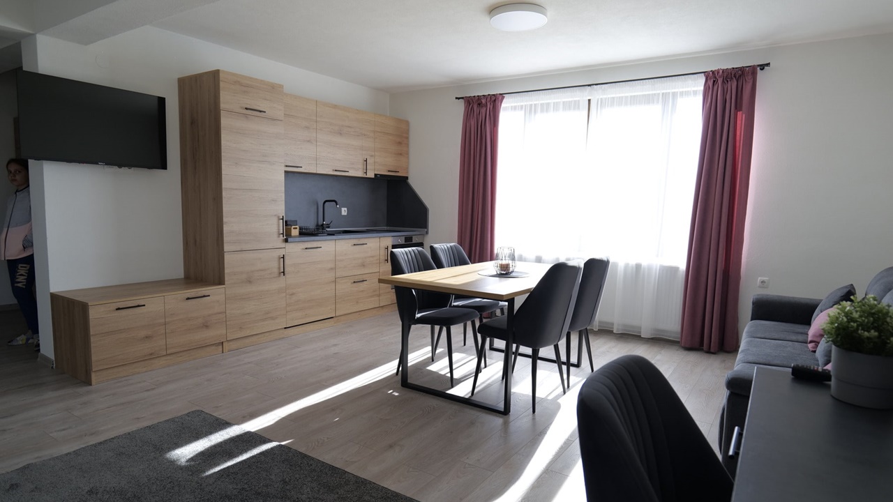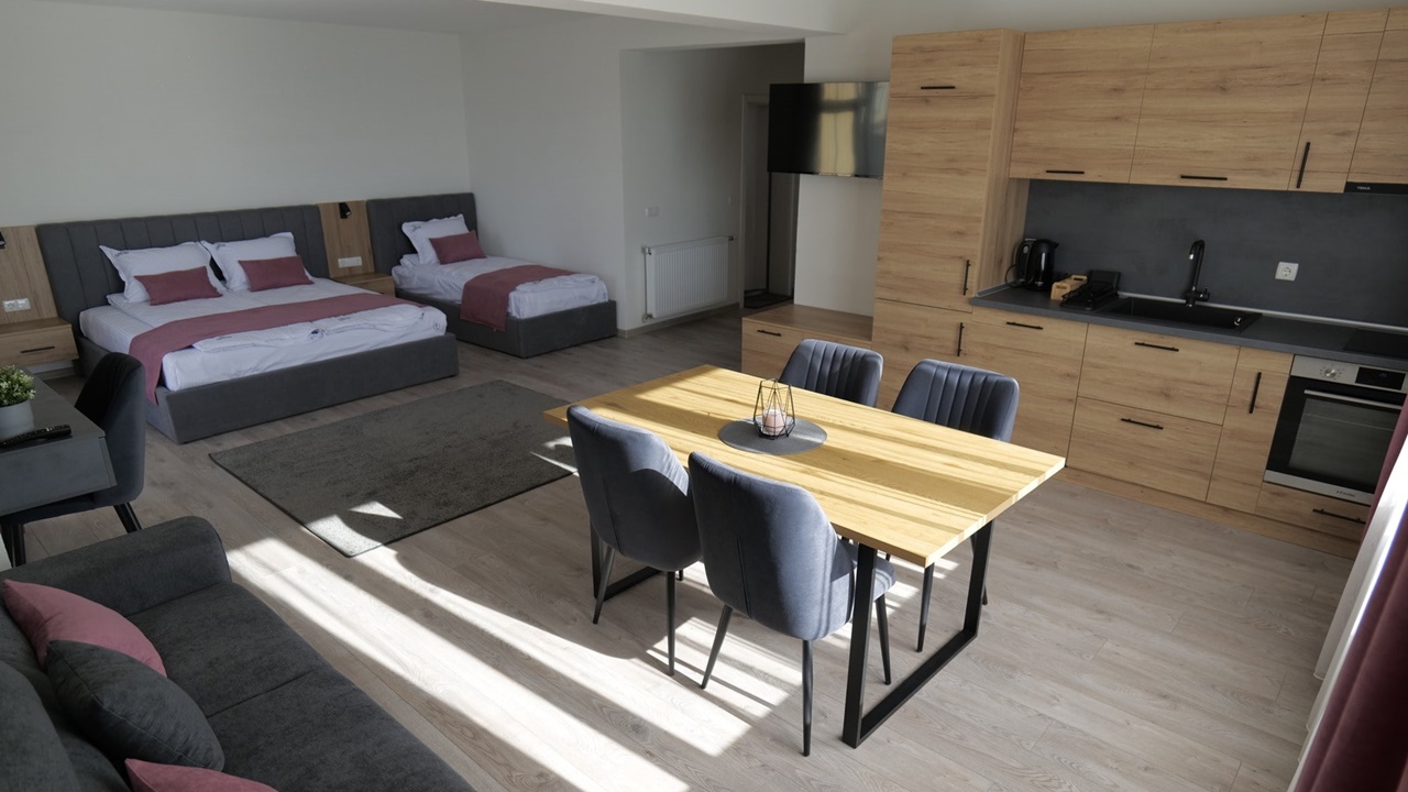 - фамилна стая - 75 кв. м. спалня и едно единично редовно легло, разтегателен диван (за 2-ма), маса за хранене, кухненски бокс, оборудван с печка, котлони, миялна машина, хладилник, електрическа кана за вода, прибори за хранене, тераса, гардероб, баня - душ кабина, сешоар, хавлиени кърпи и халат, чехли и тоалетни принадлежности LED HD телевизор, wi-fi и климатик.