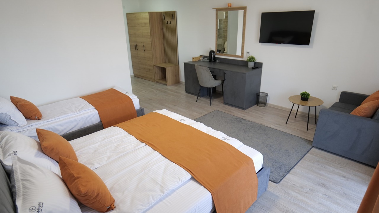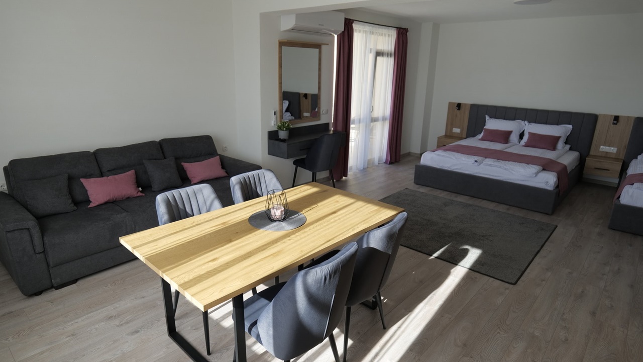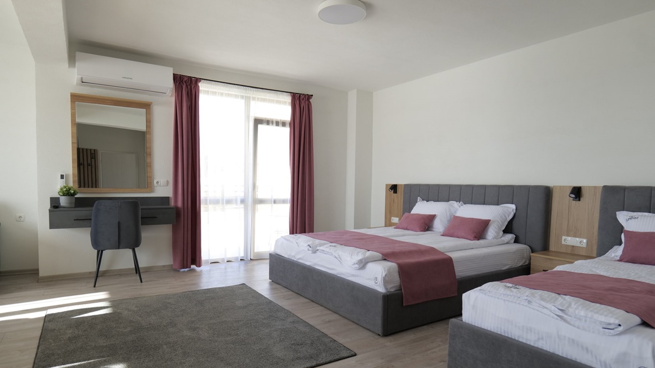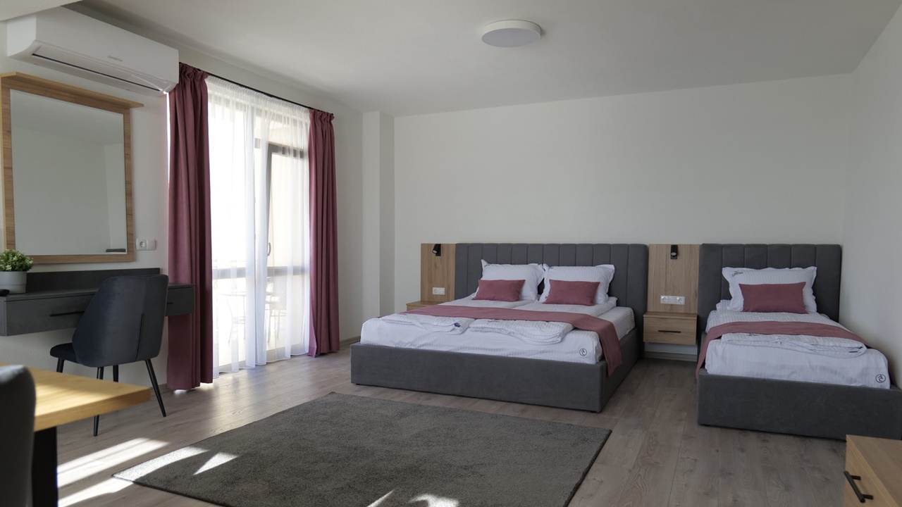 - тройна стая с балкон - 50 кв. м. - спалня и едно единично редовно легло, разтегателен фотьойл, работно пространство, хладилник, електрическа кана за вода, тераса, гардероб, баня с душ кабина, сешоар, хавлиени кърпи и халати, чехли и тоалетни принадлежности, климатик, LED HD телевизор, wi-fi и климатик