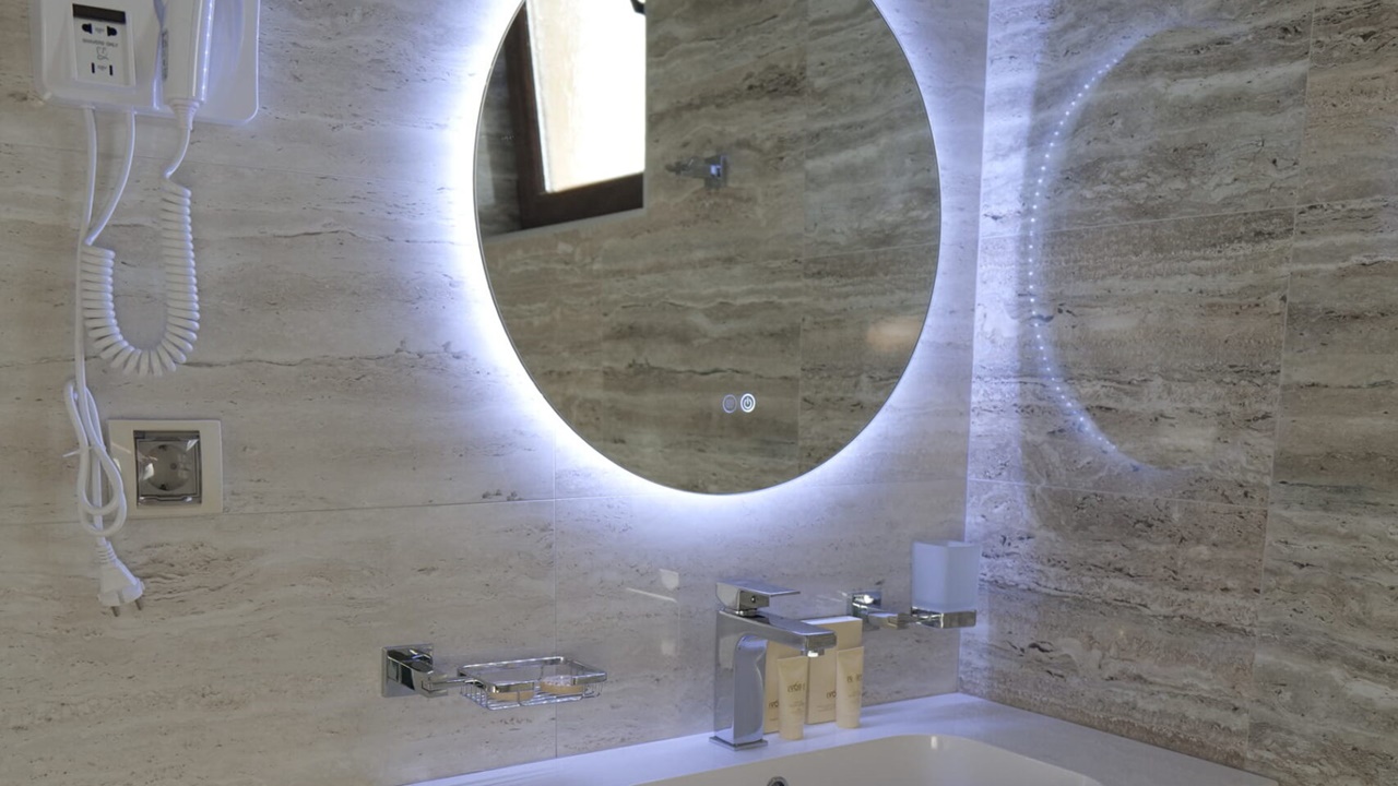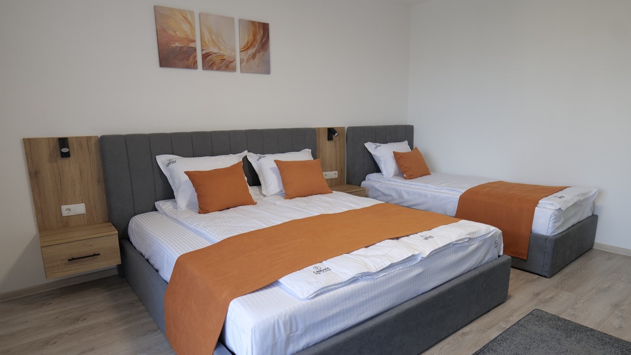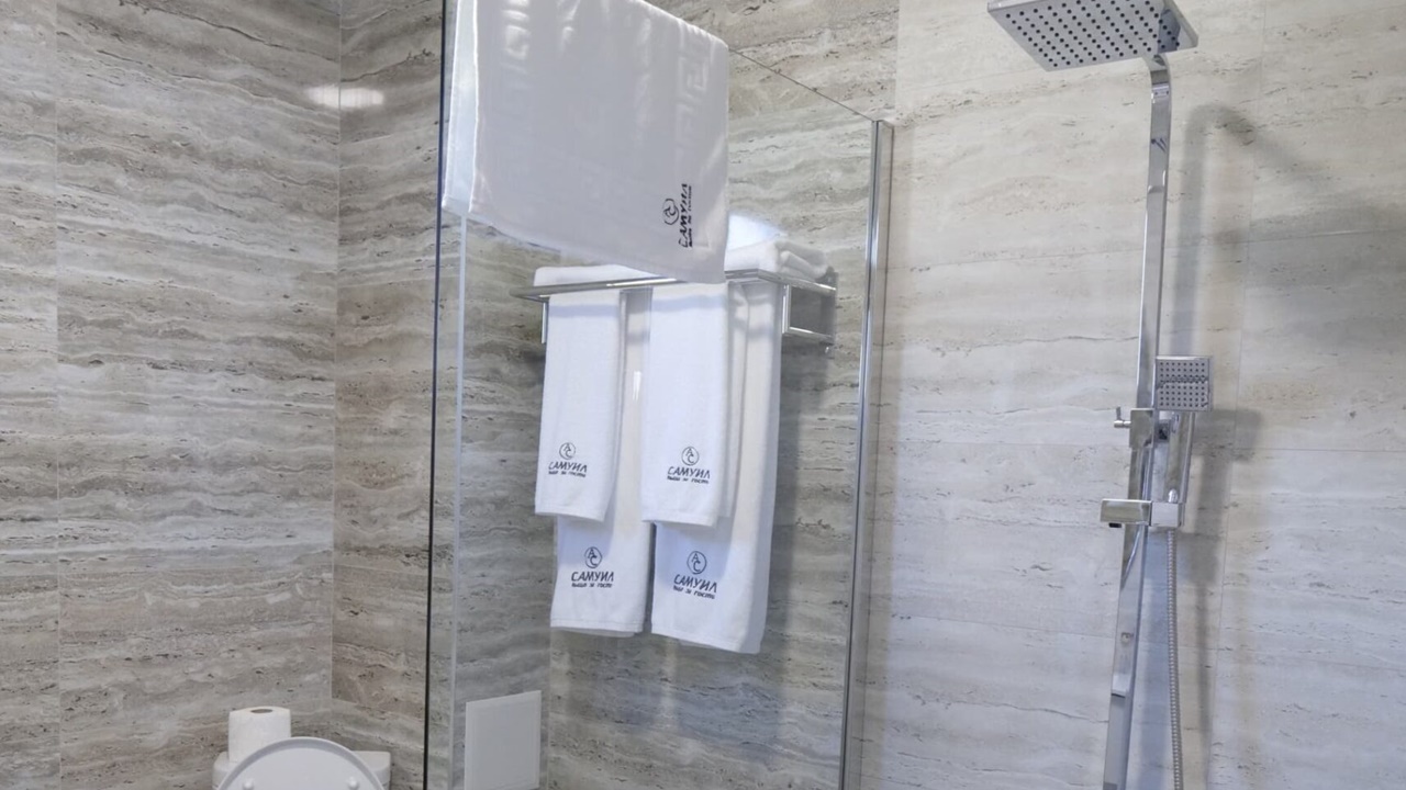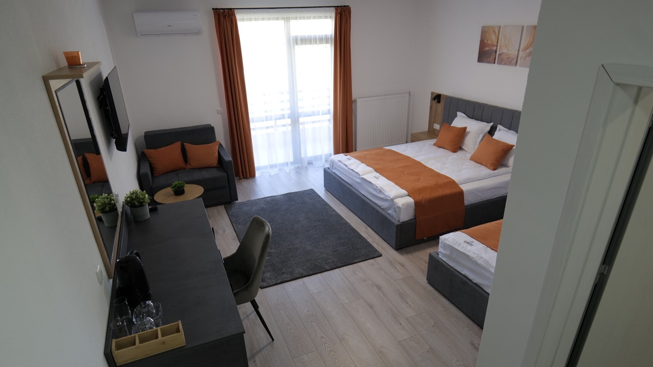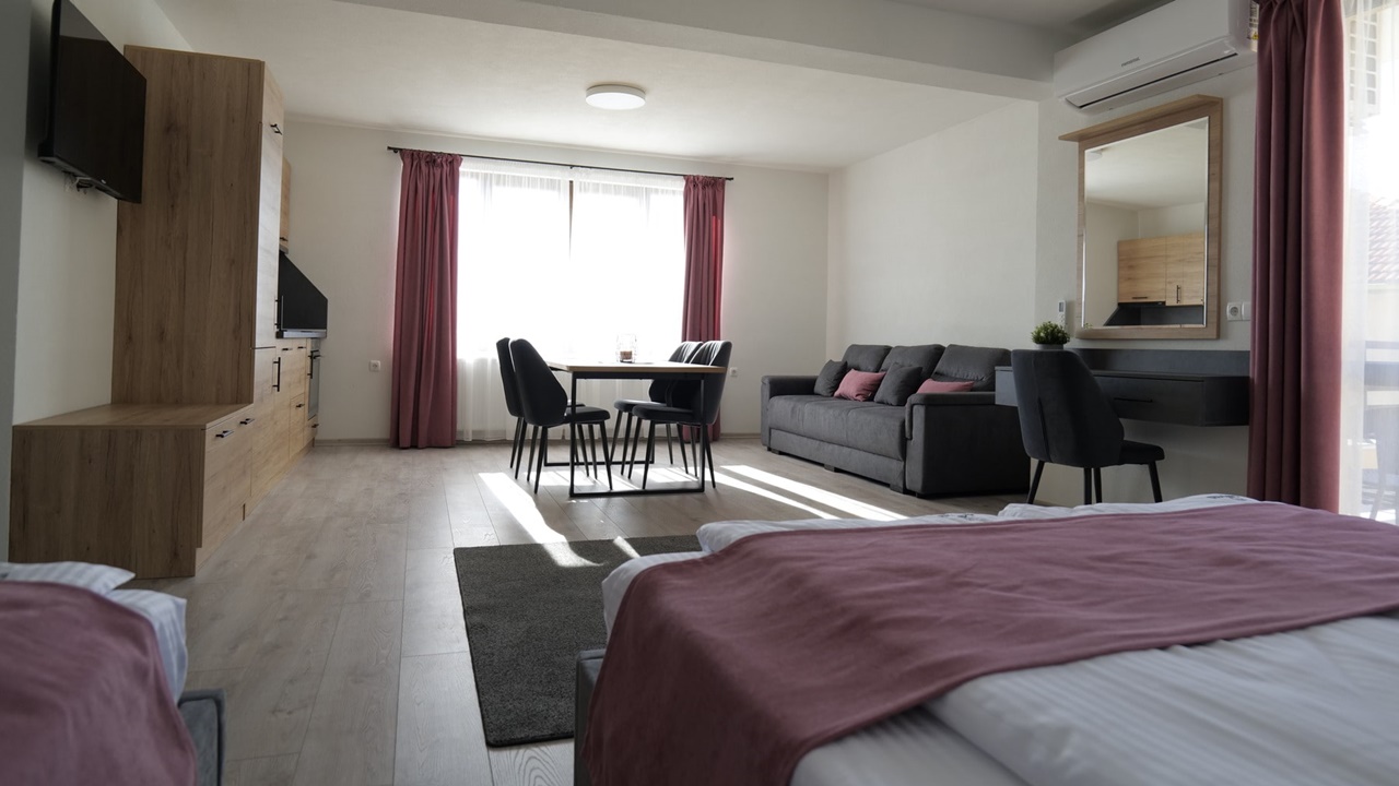 - тройна стая с балкон - 50 кв. м. - спалня и едно единично редовно легло, разтегателен фотьойл, работно пространство, хладилник, електрическа кана за вода, тераса, гардероб, баня с душ кабина, сешоар, хавлиени кърпи и халати, чехли и тоалетни принадлежности, климатик, LED HD телевизор, wi-fi и климатик