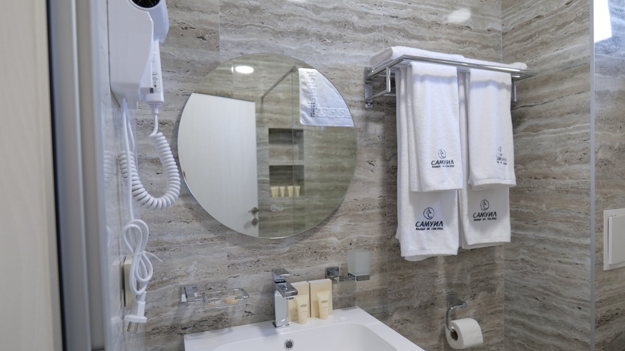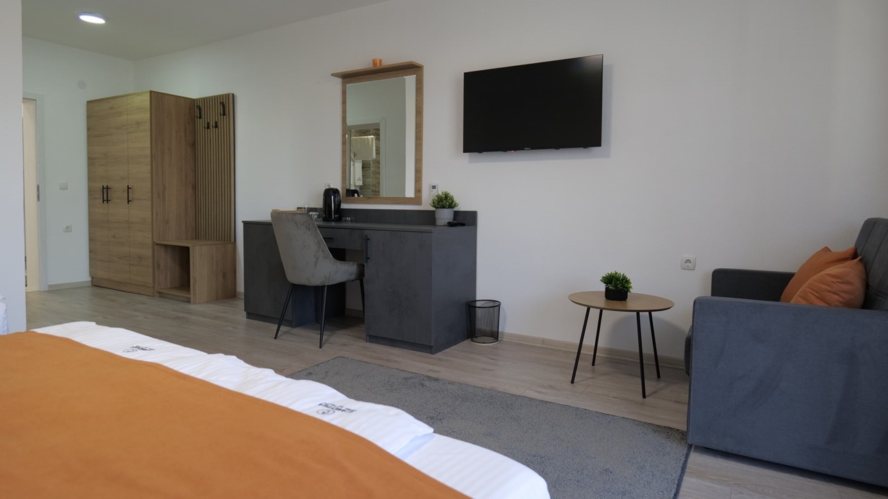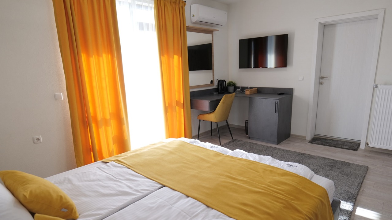 - двойна стая с балкон - 24 кв. м. - спалня, работно пространство, хладилник, електрическа кана за вода, тераса, гардероб, баня с душ кабина, сешоар, хавлиени кърпи и халати, чехли и тоалетни принадлежности, LED HD телевизор, wi-fi и климатик