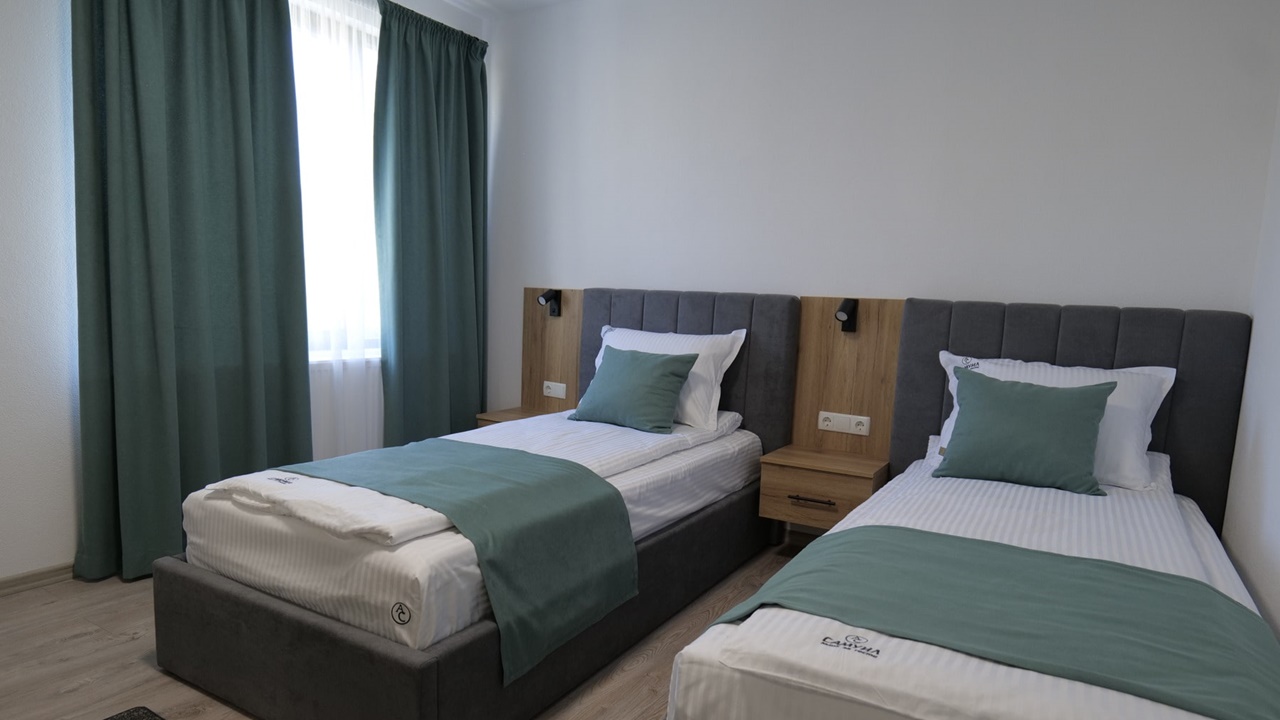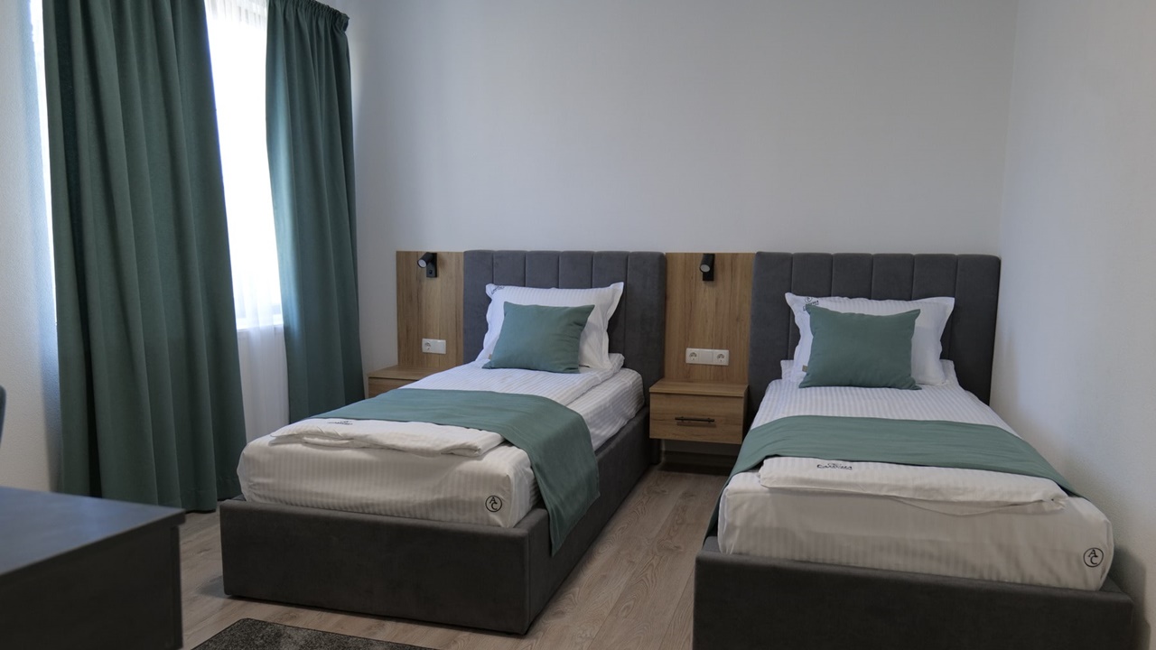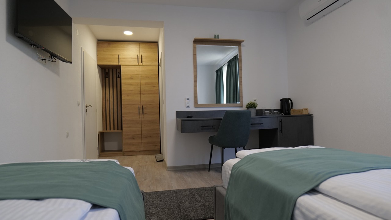 - двойна стая без балкон - 20 кв. м. две отделни легла, работно пространство, хладилник, електрическа кана за вода, баня с душ кабина, сешоар, хавлиени кърпи и халати, чехли и тоалетни принадлежности, LED HD телевизор, wi-fi и климатик