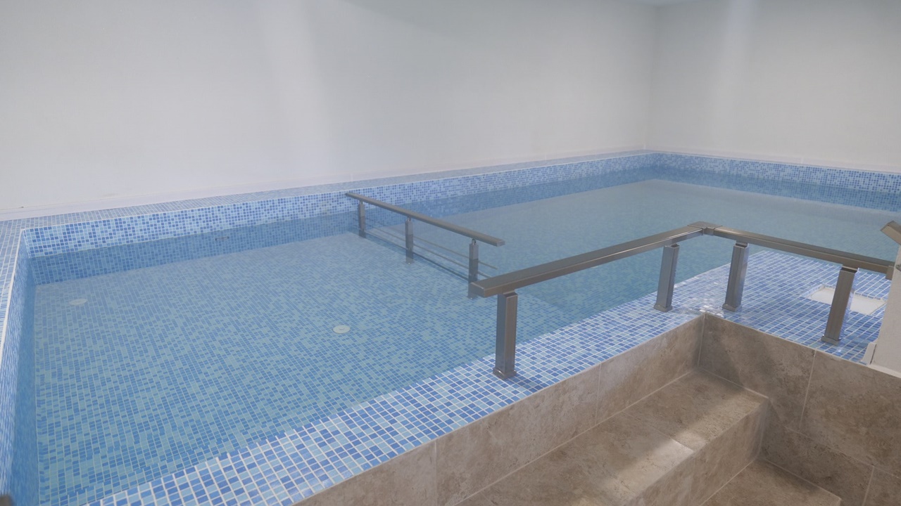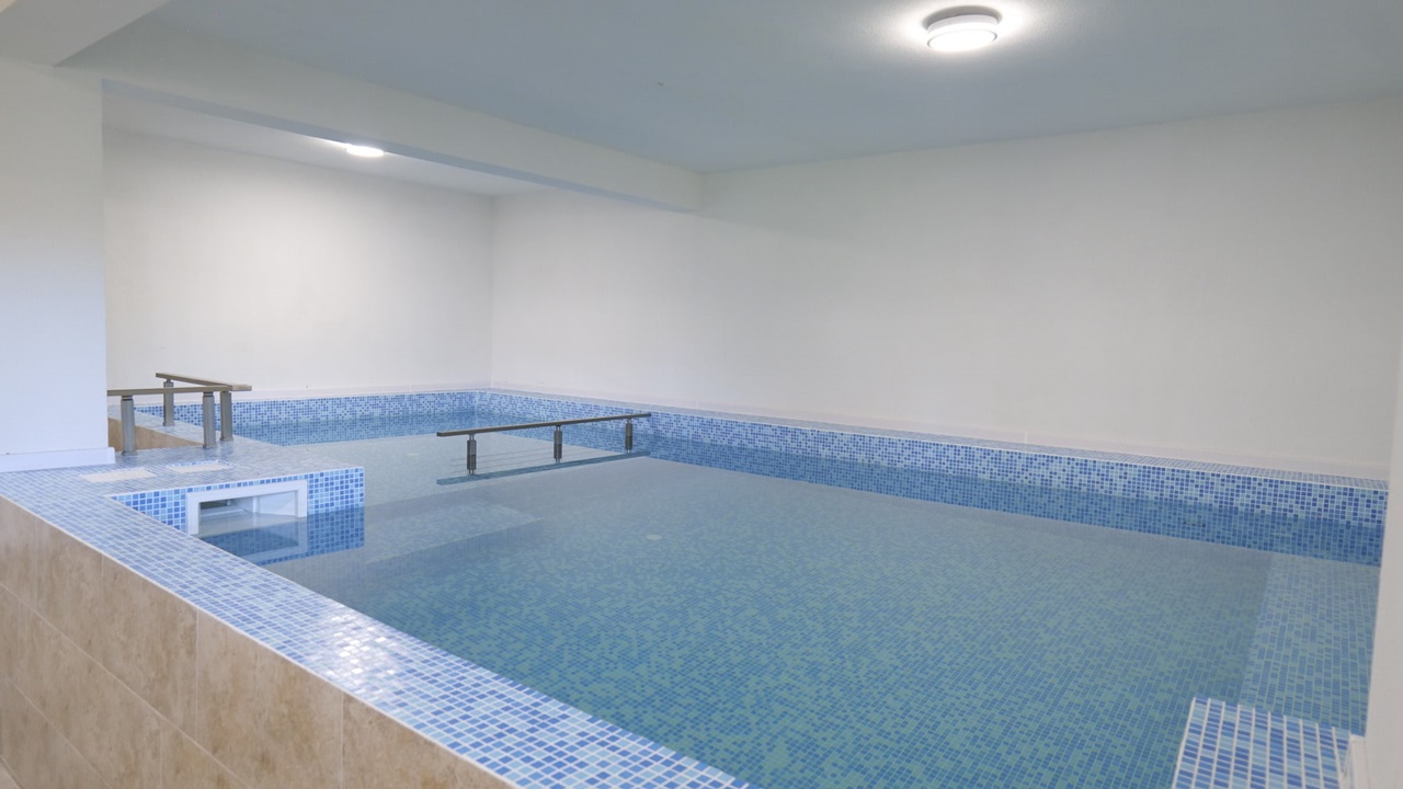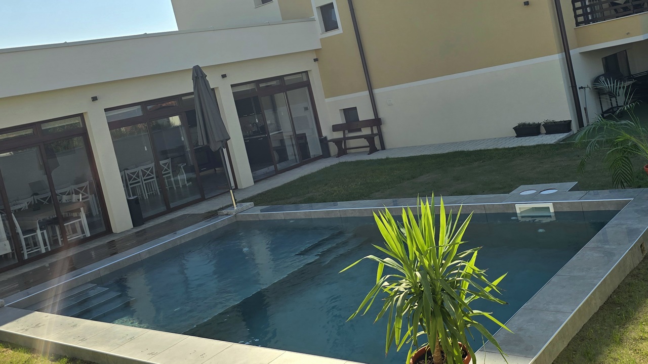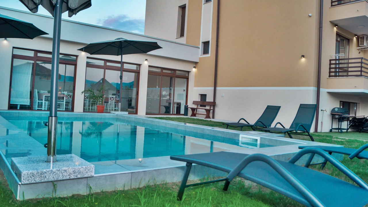 - Вътрешен двор с външен басейн, шезлонги и кърпи