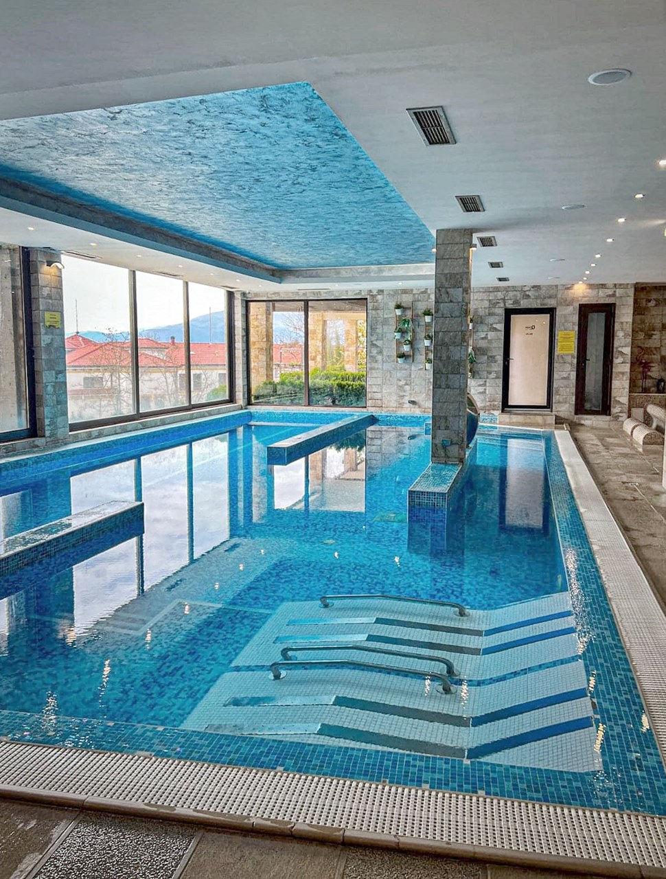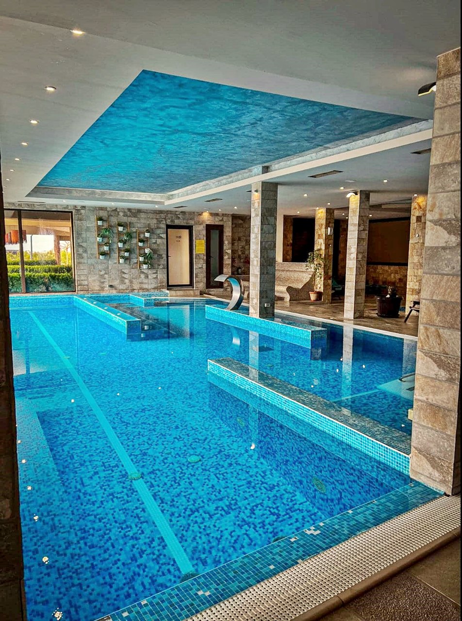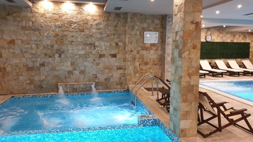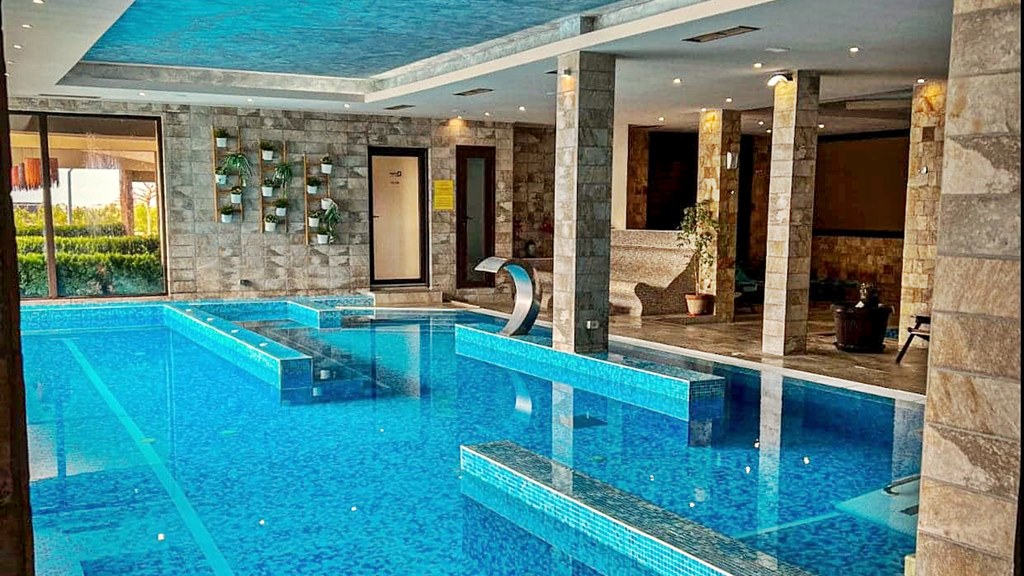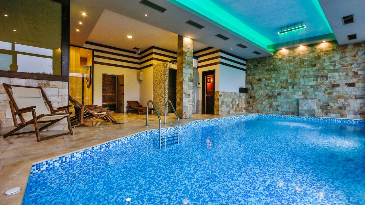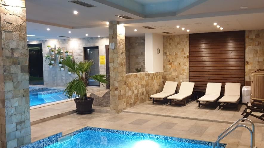 - Вътрешен нов акватоничен минерален басейн с гейзери, каскади, акватонична пътека, лежанка, хидро-дюзи с перлен масаж - 34 градуса