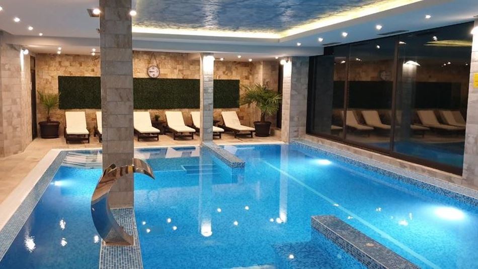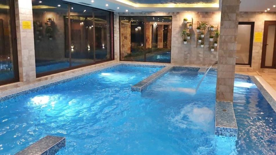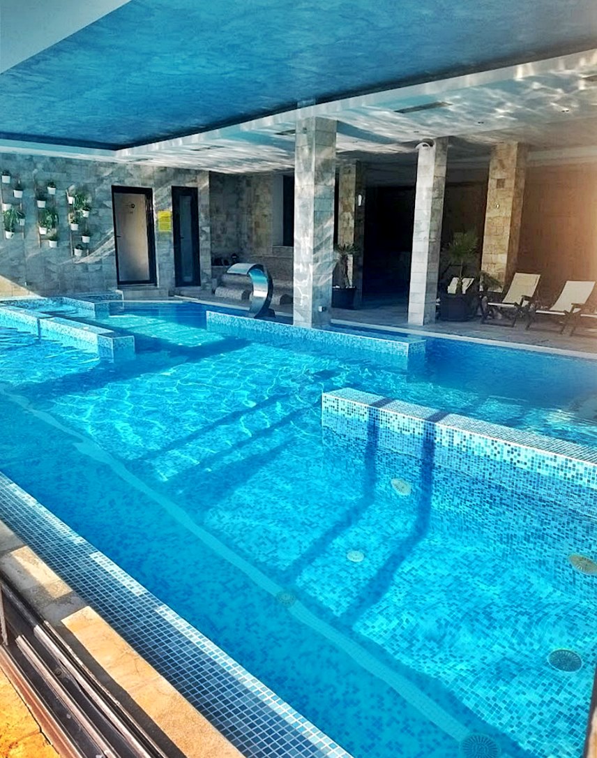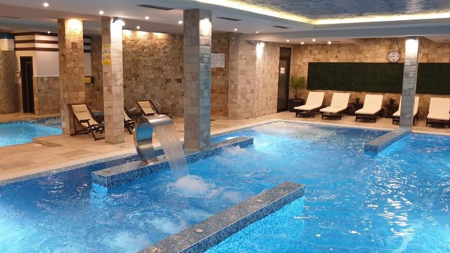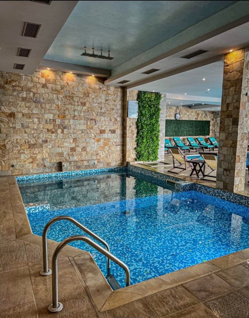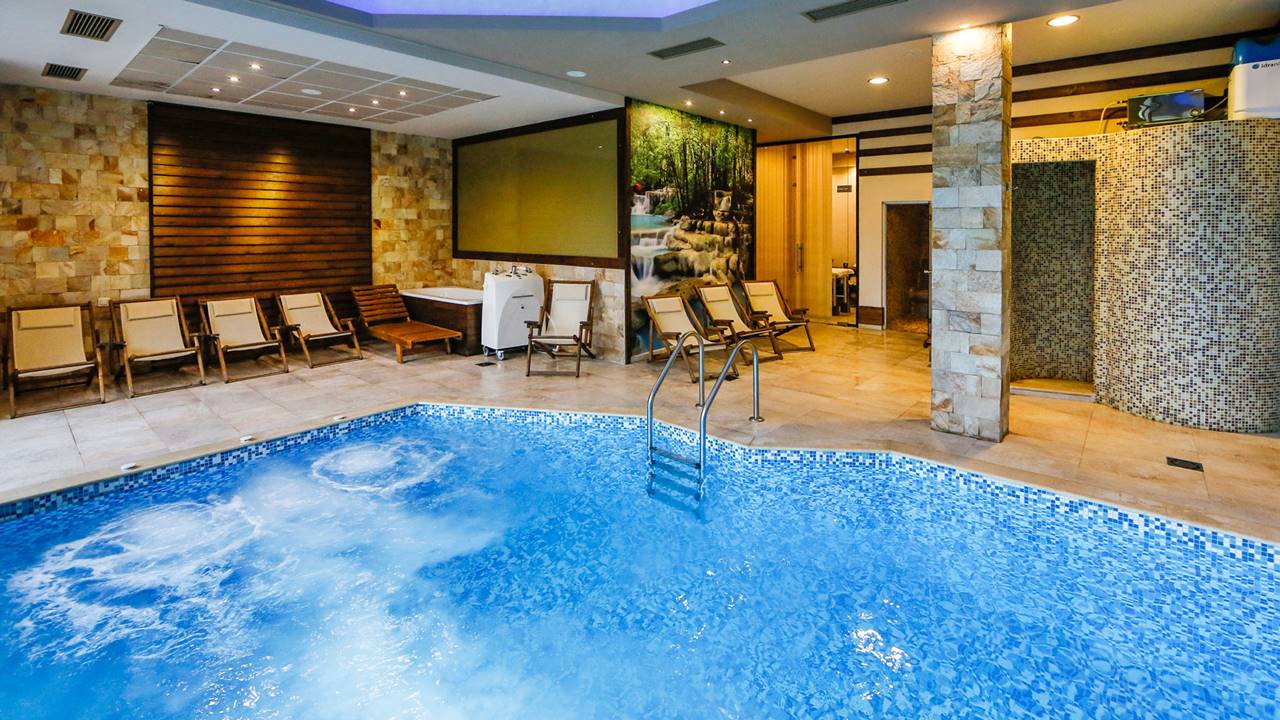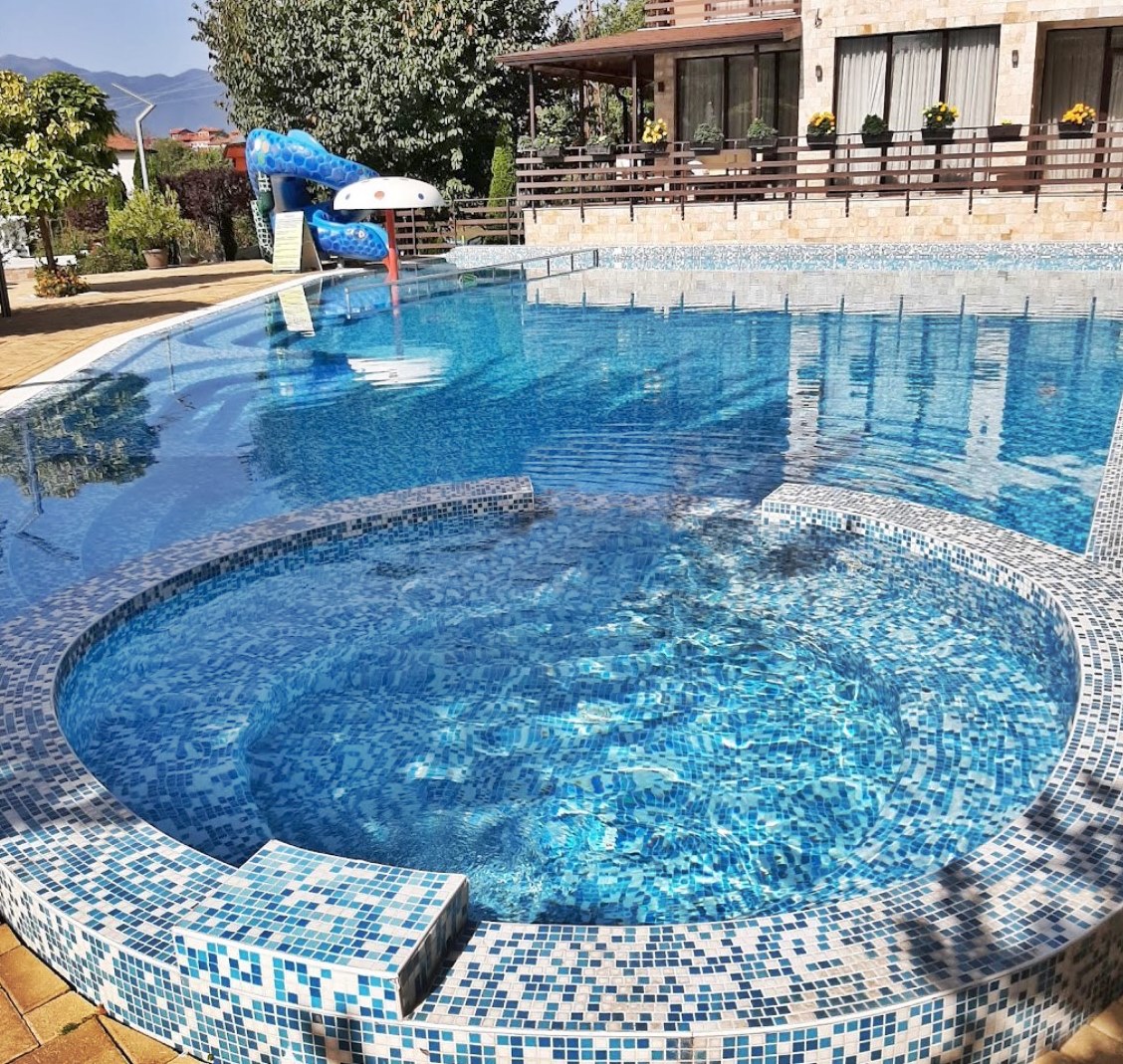 - Вътрешен нов акватоничен минерален басейн с гейзери, каскади, акватонична пътека, лежанка, хидро-дюзи с перлен масаж - 34 градуса