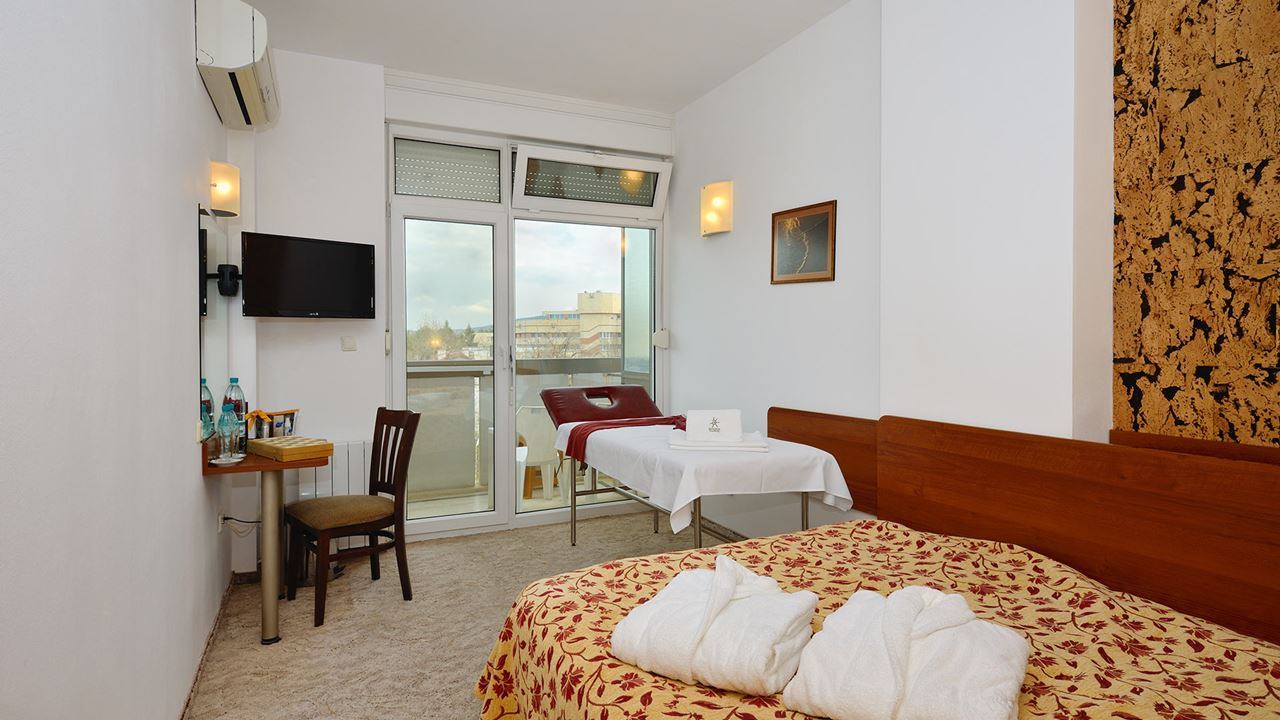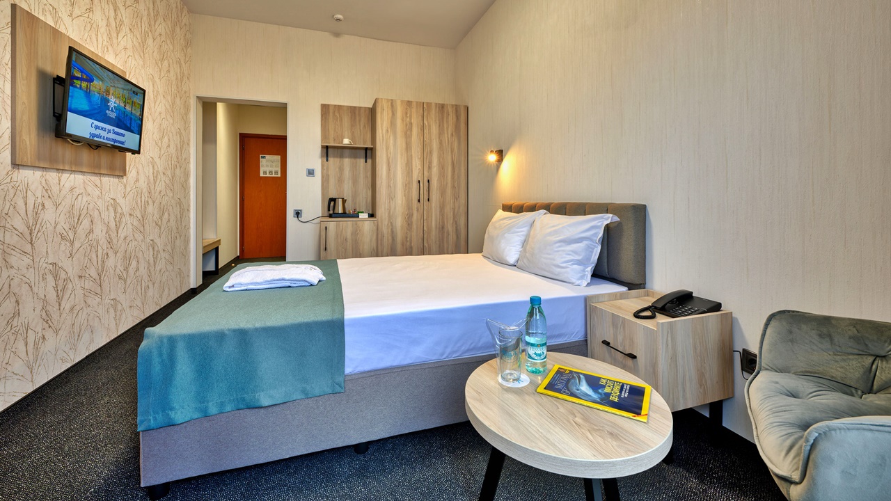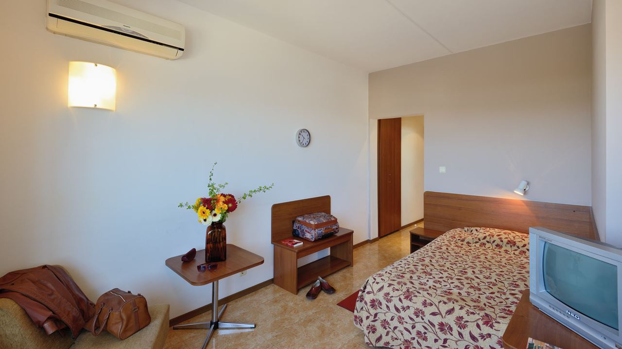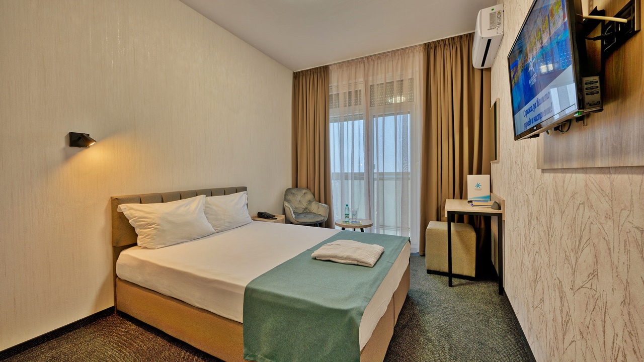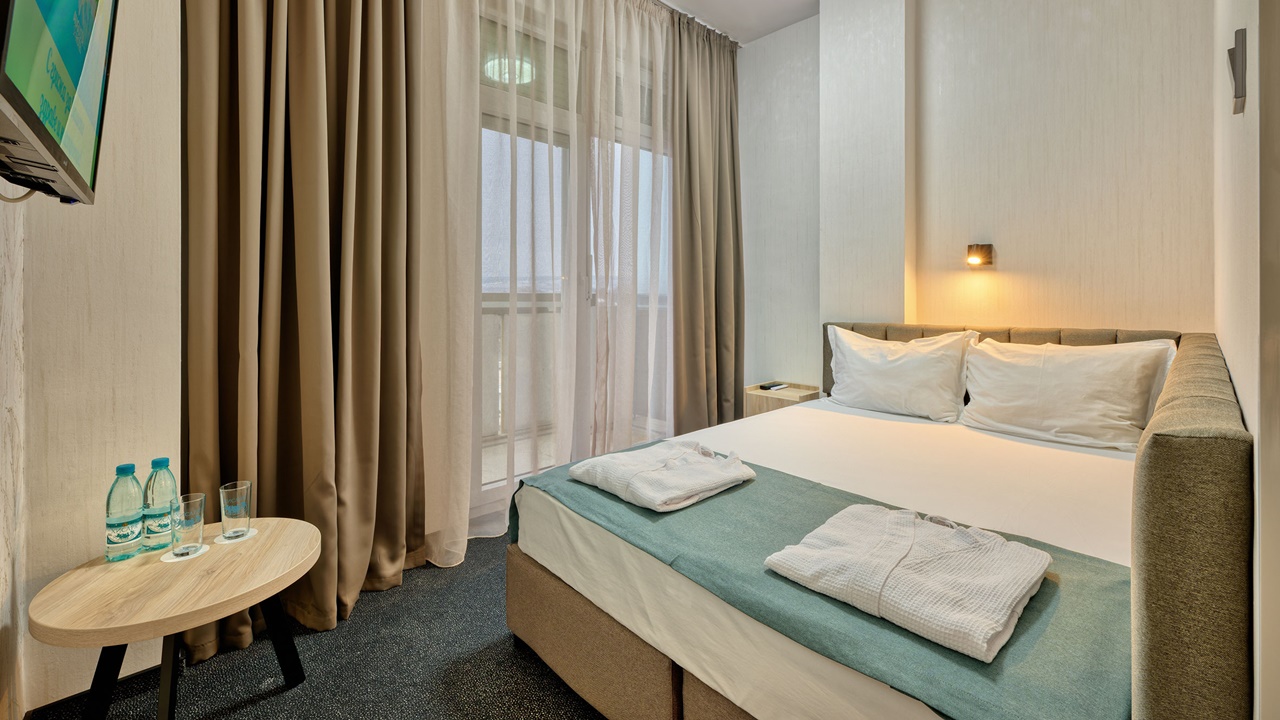 - единична стая делукс - Единичните делукс стаи са със спалня с размери 150×200 см. Тези стаи са реновирани с ново съвременно обзавеждане и оборудване, тихи и спокойни и предлагат чудесни условия за качествена отмора. Безплатен Wi-Fi интернет, 32“ LCD TV, телефон с директно международно избиране, климатик, хладилник, сейф, електрическа кана и зареждане с кафе / чай и минерална вода, баня с вана, телефон и сешоар, индивидуално отопление, PVC-дограма с външни ролетни щори, тераса с красива гледка