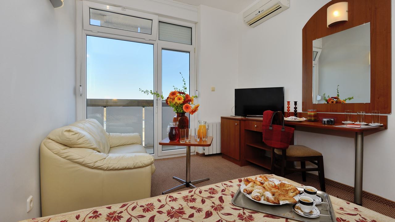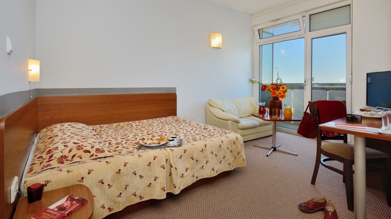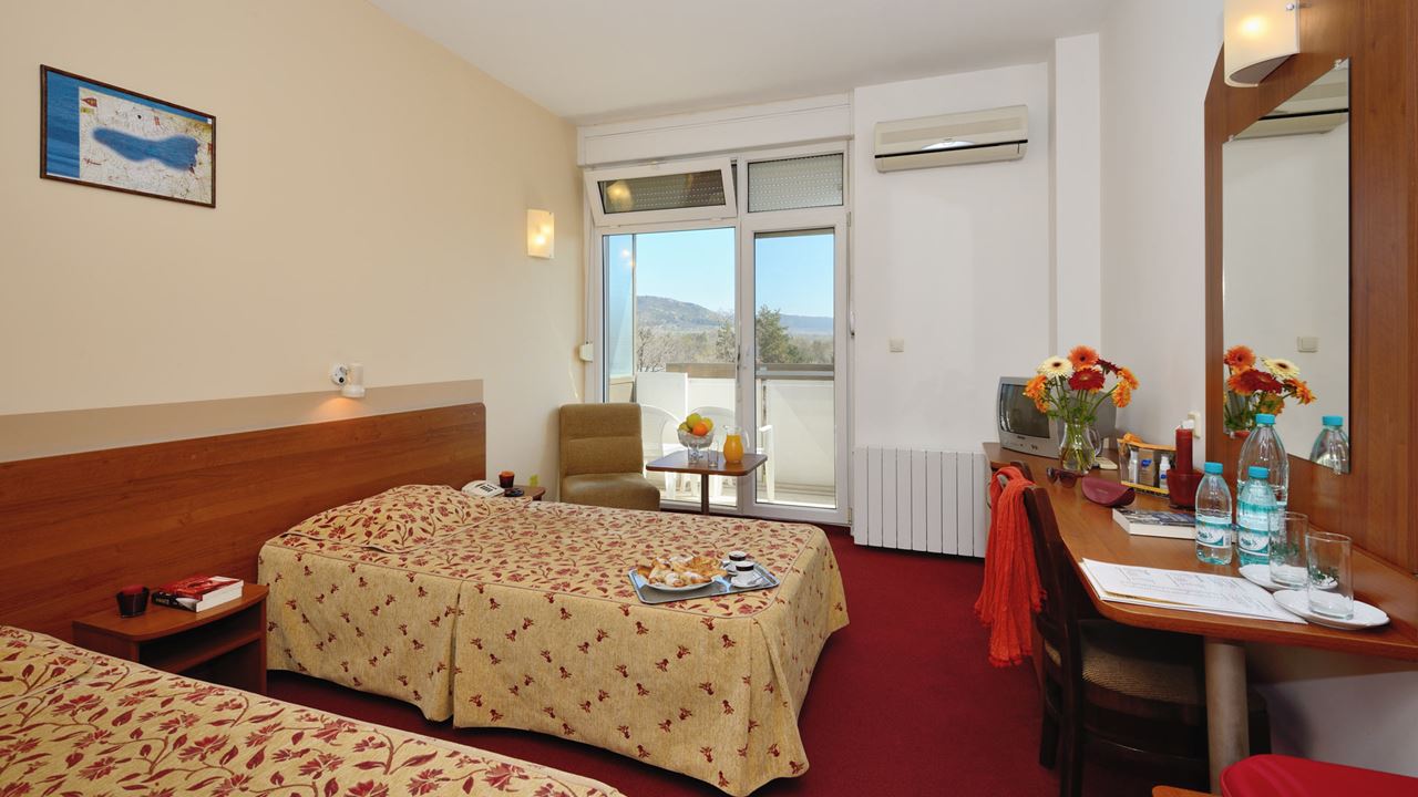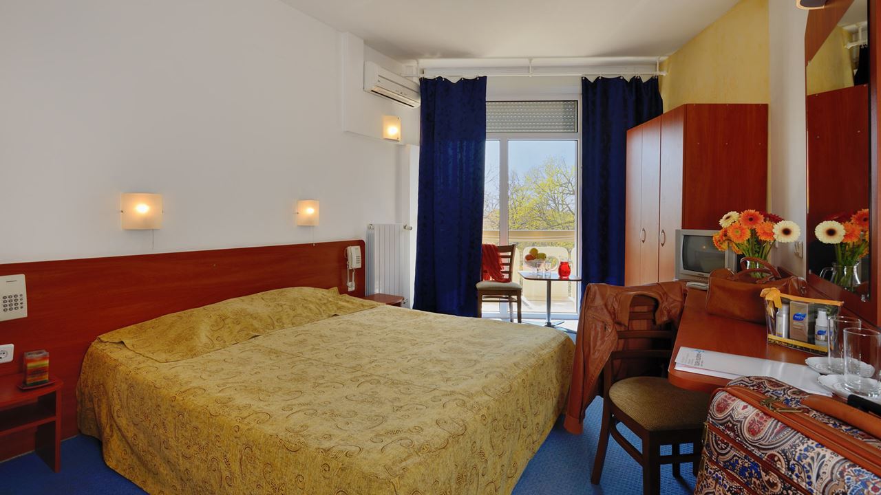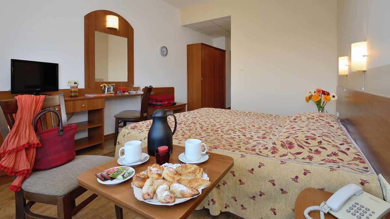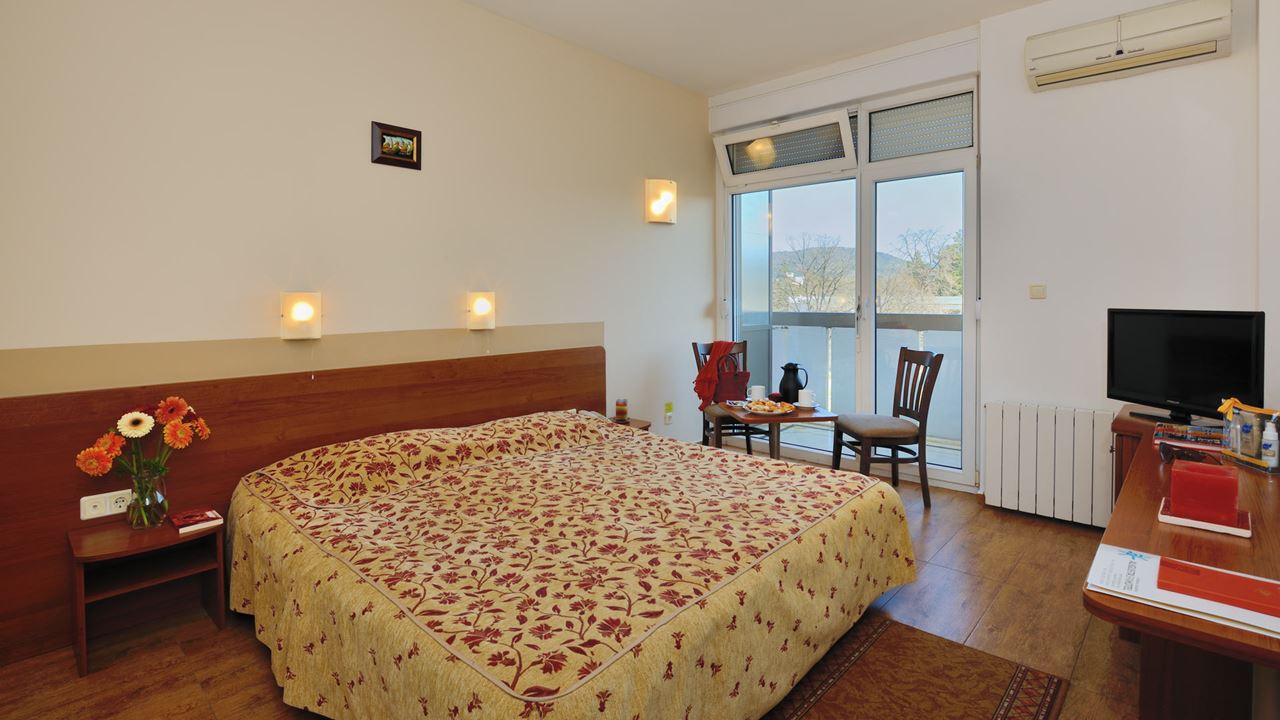 - единична стая делукс - Единичните делукс стаи са със спалня с размери 150×200 см. Тези стаи са реновирани с ново съвременно обзавеждане и оборудване, тихи и спокойни и предлагат чудесни условия за качествена отмора. Безплатен Wi-Fi интернет, 32“ LCD TV, телефон с директно международно избиране, климатик, хладилник, сейф, електрическа кана и зареждане с кафе / чай и минерална вода, баня с вана, телефон и сешоар, индивидуално отопление, PVC-дограма с външни ролетни щори, тераса с красива гледка