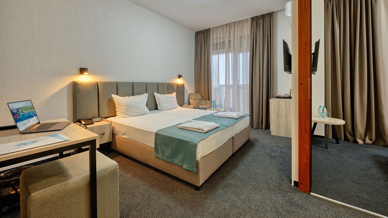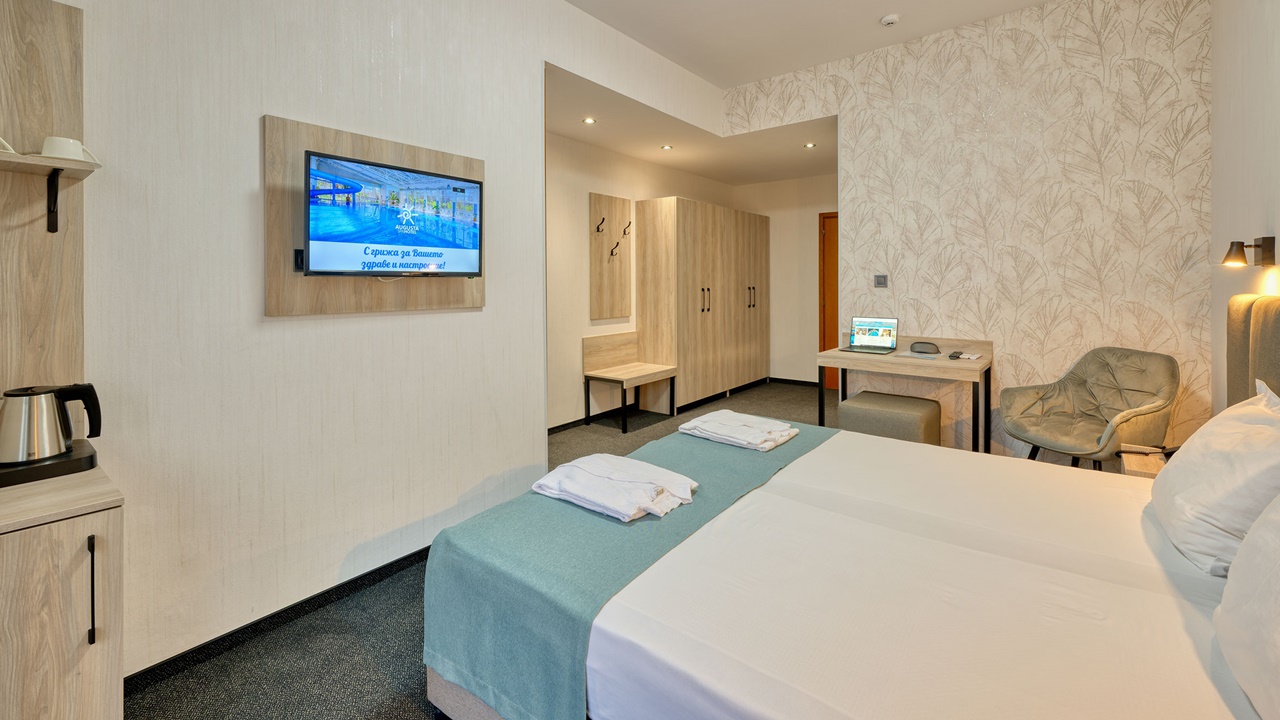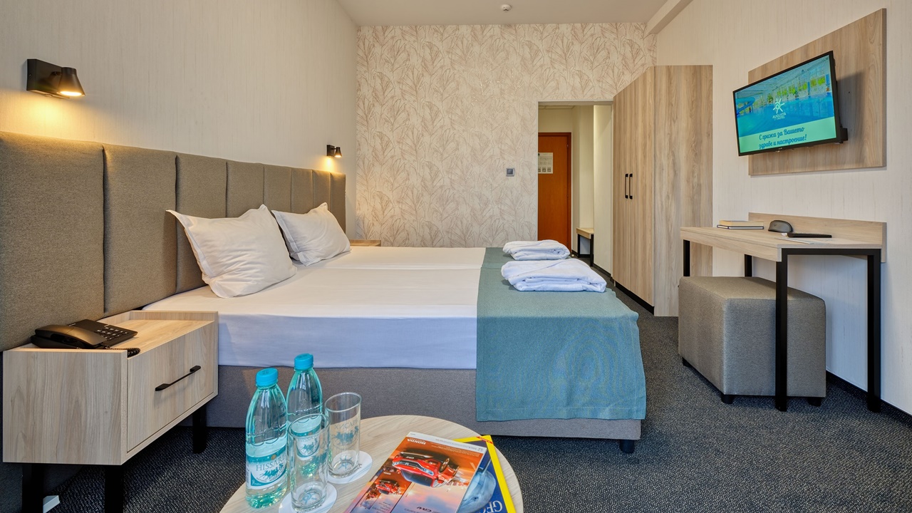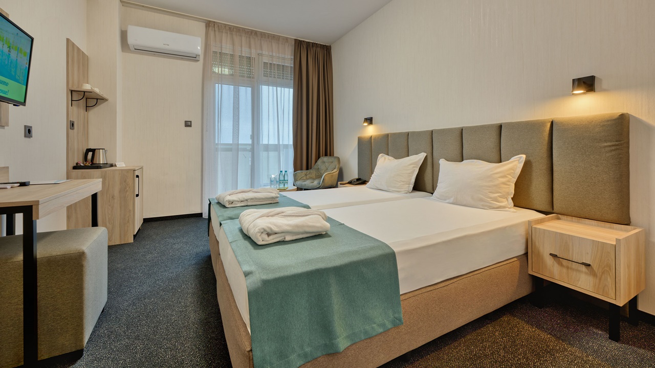 - двойна стандартна стая със спалня или 2 отделни легла - Уютните двойни стаи предлагат спалня с размер 170х200 см или две отделни легла с размер 100х200 см и опция за допълнително легло. Разполагат с тераса, TV, телефон, климатик, хладилник, функционално обзавеждане, PVC-дограма с външни ролетни щори, баня с вана или душ, телефон, сешоар, локално отопление