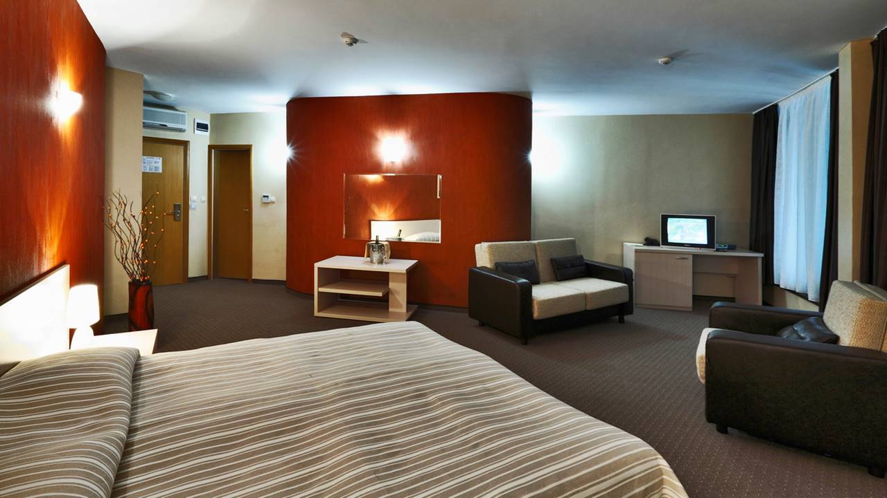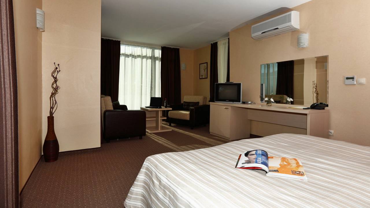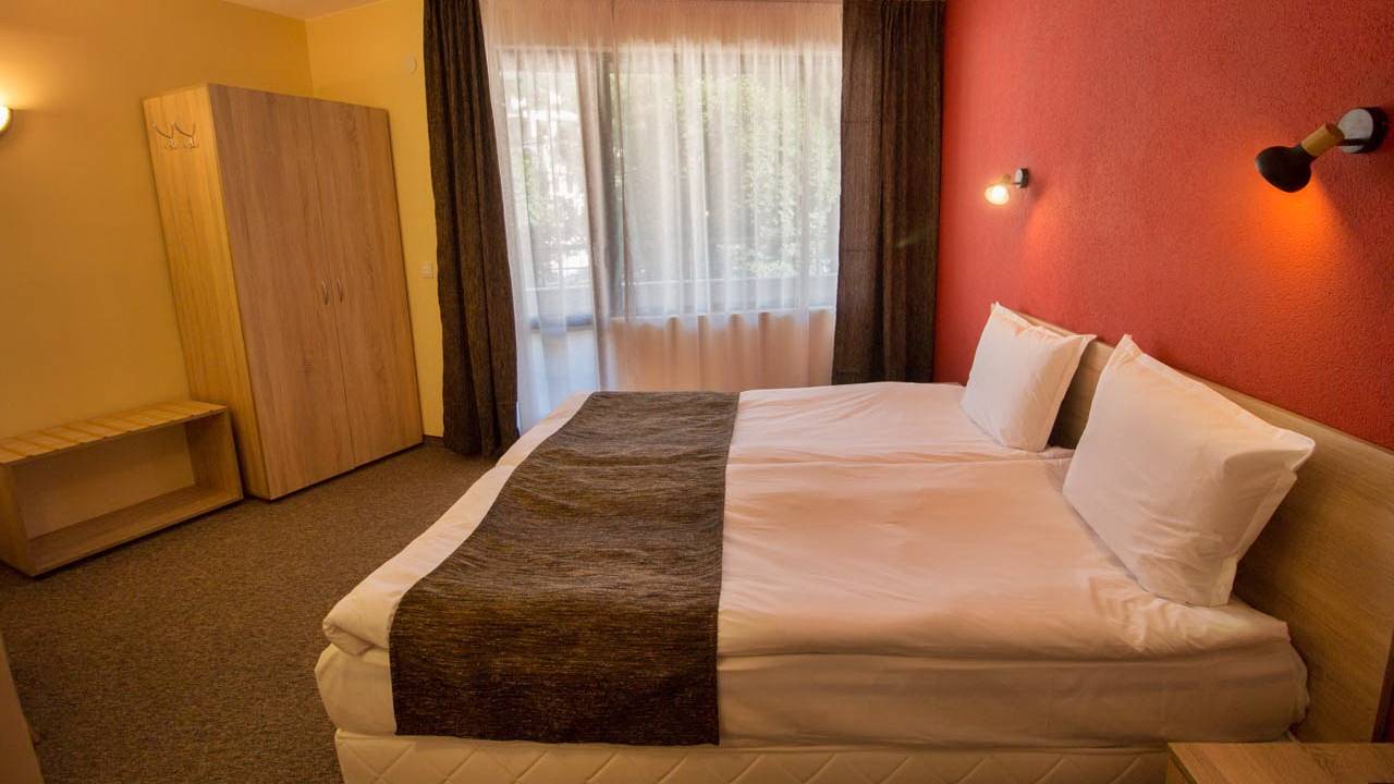 - Двойна стая - Двойните стаи разполагат с едно голямо легло тип спалня или с 2 единични легла, разтегателен фотьойл, тоалетка, телевизор, антре и баня с душ кабина. Част от двойните стаи разполагат с тераси с гледка към планината или парка на града.