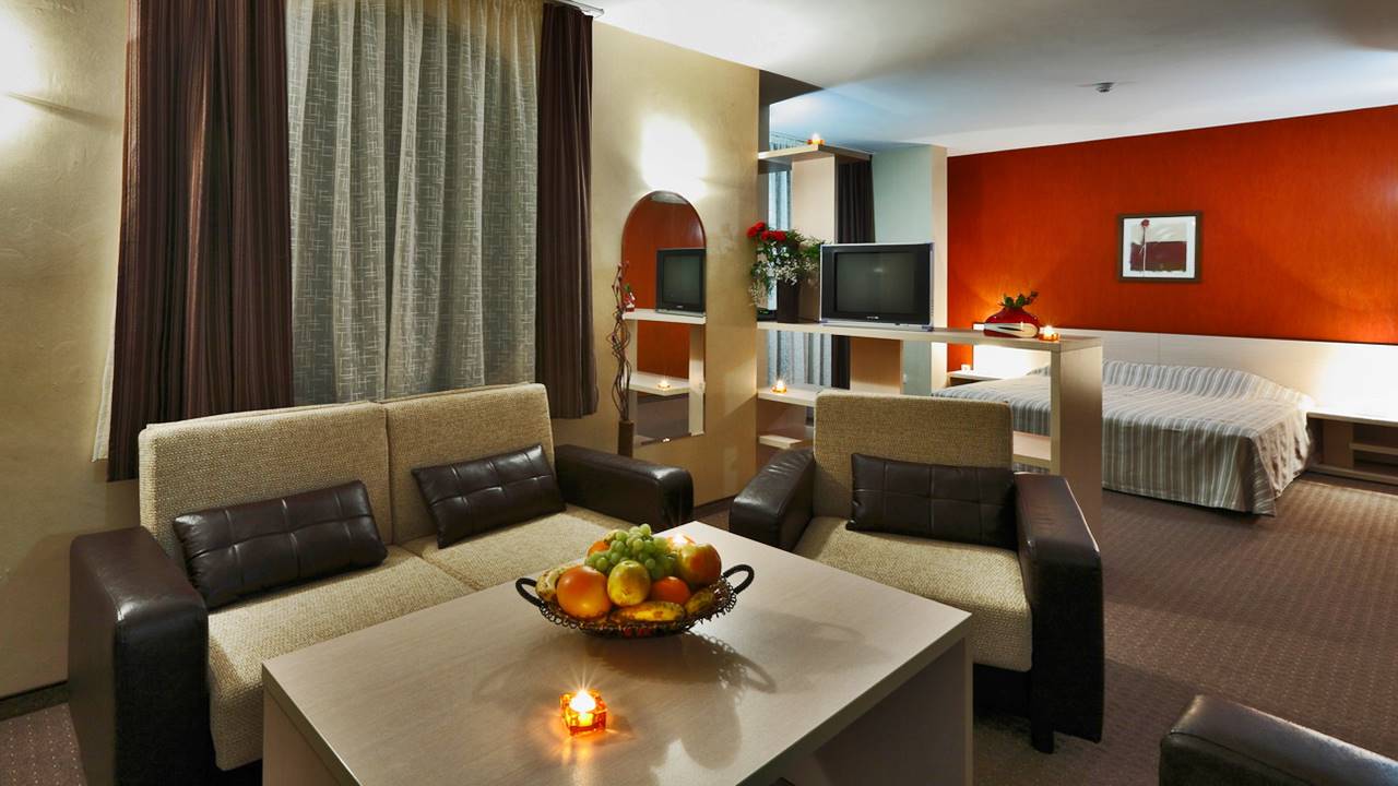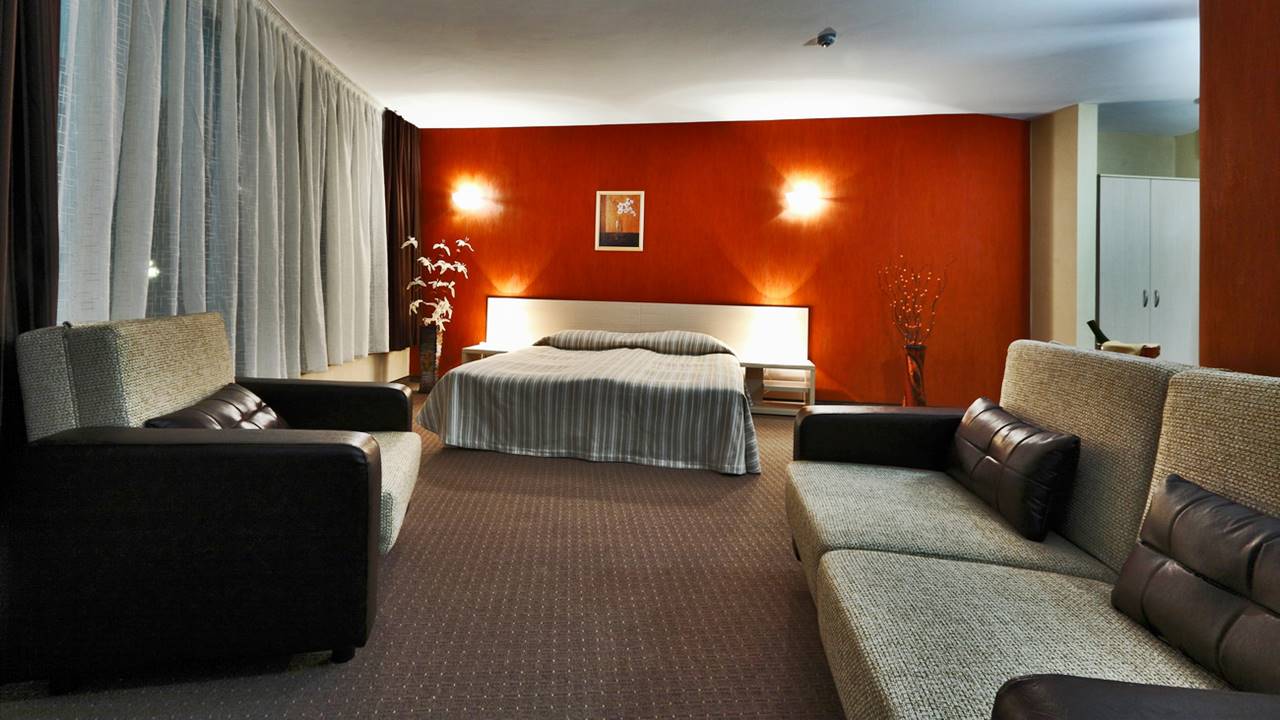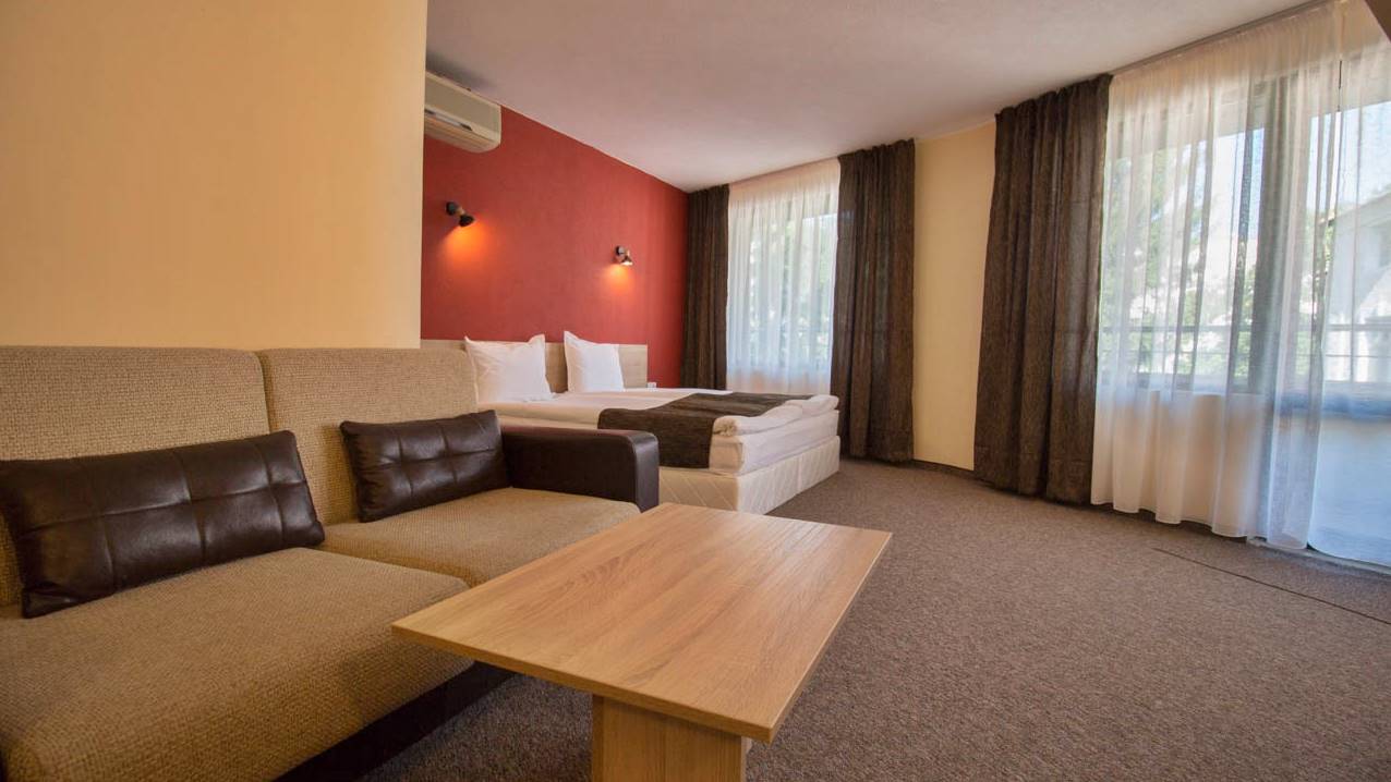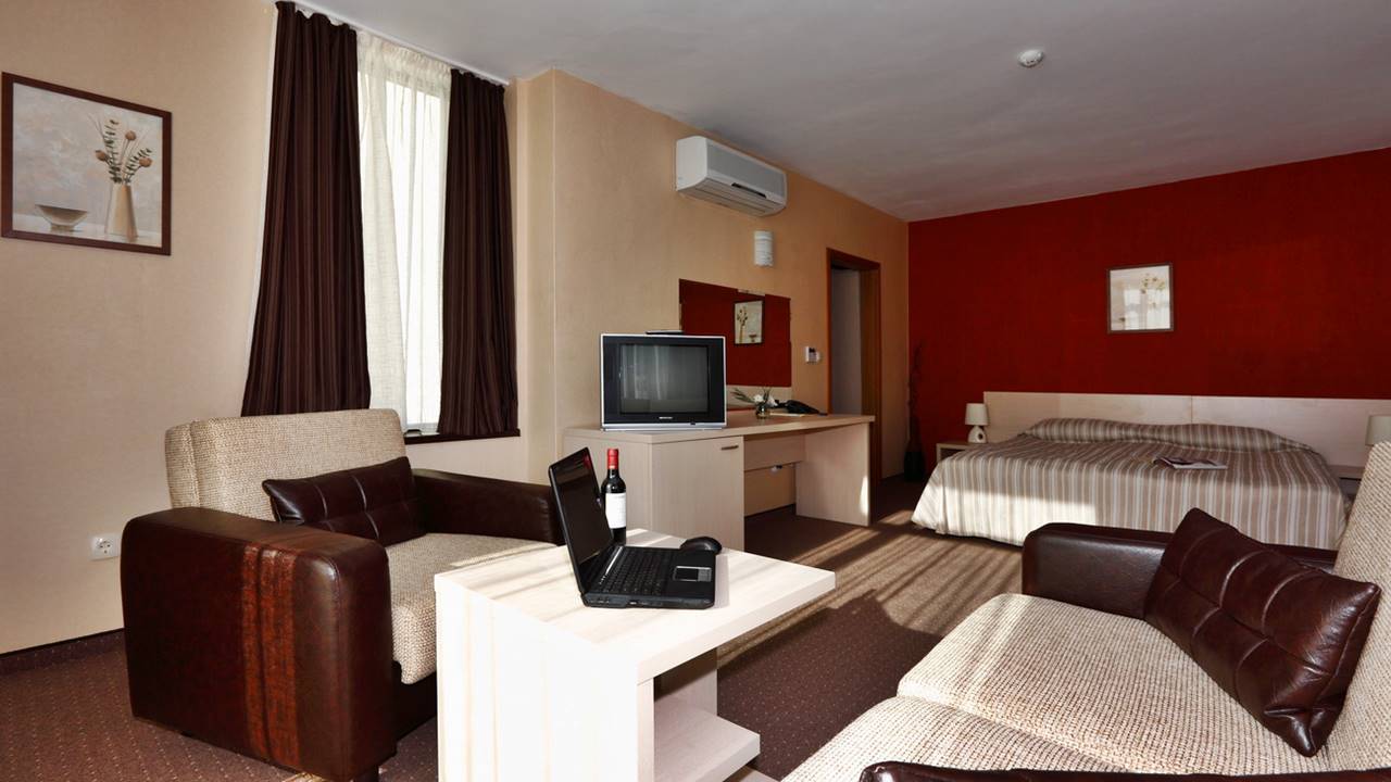 - Двойна стая - Двойните стаи разполагат с едно голямо легло тип спалня или с 2 единични легла, разтегателен фотьойл, тоалетка, телевизор, антре и баня с душ кабина. Част от двойните стаи разполагат с тераси с гледка към планината или парка на града.