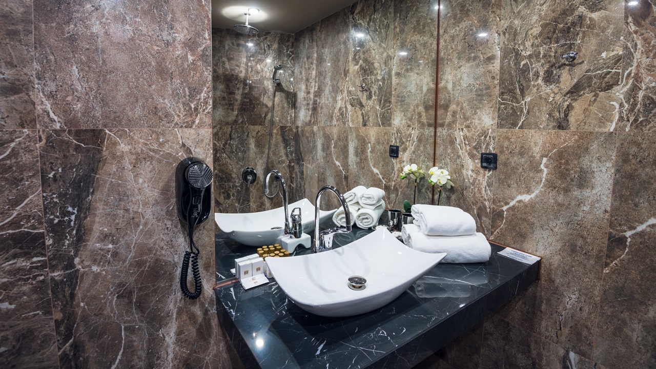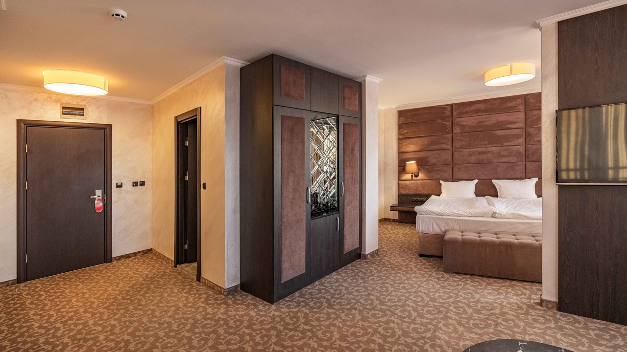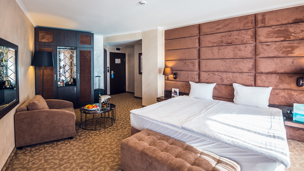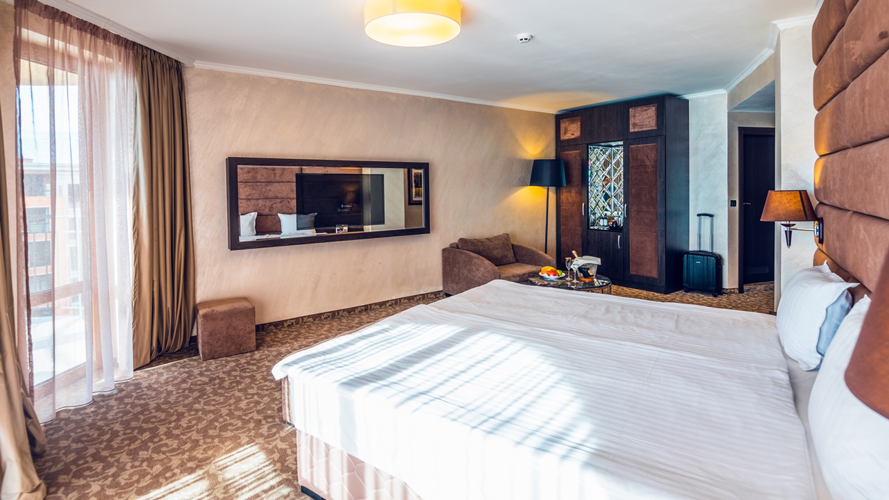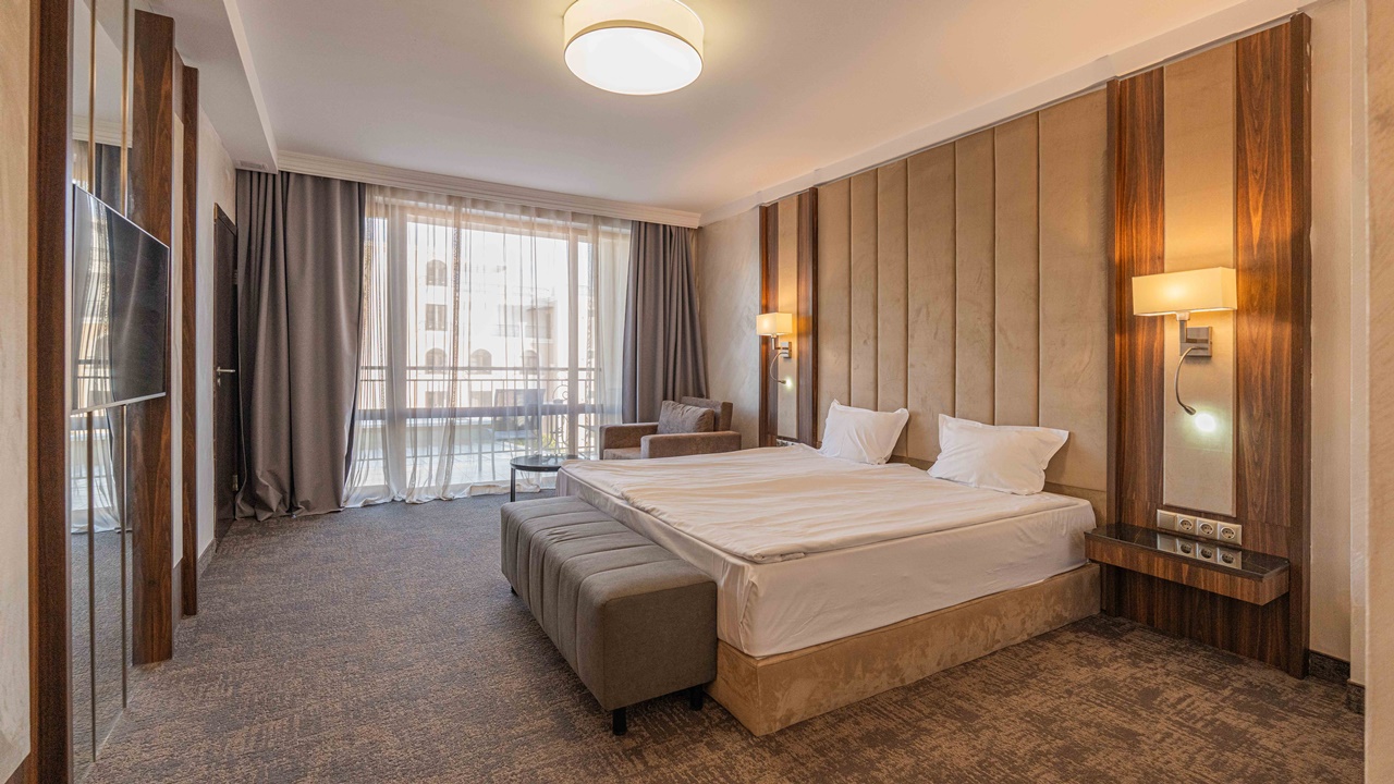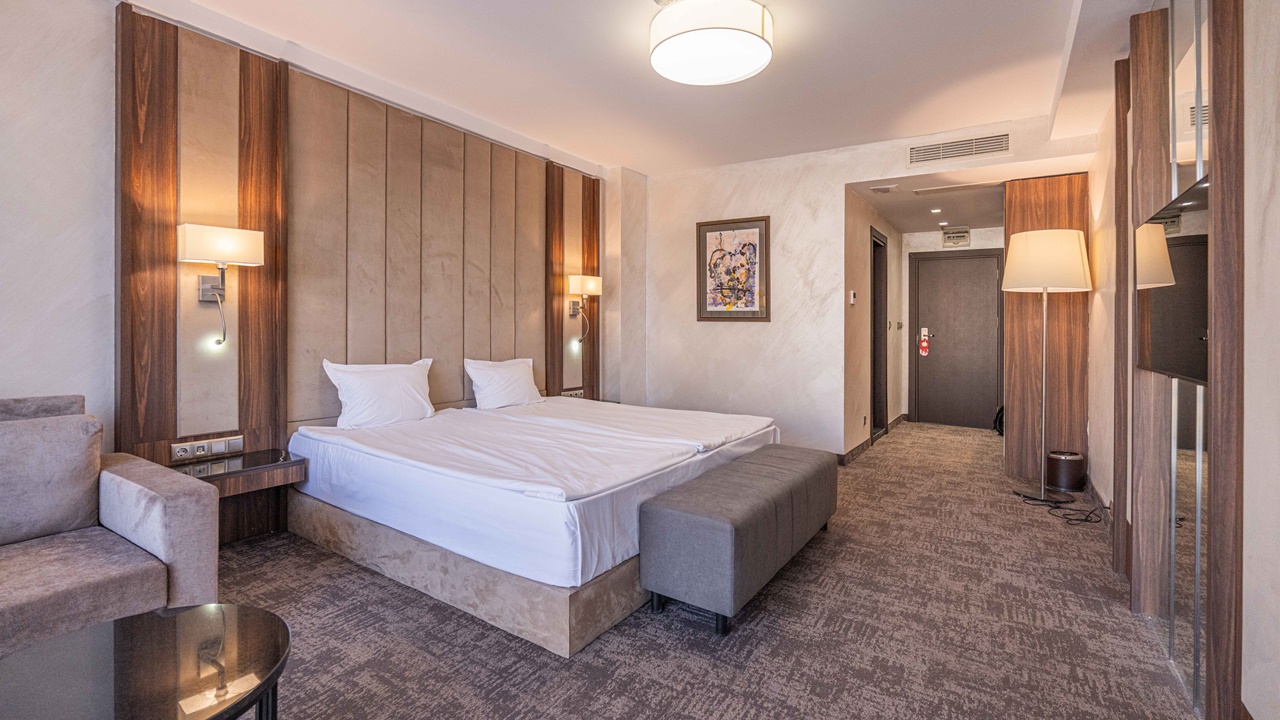 - двойна стая Делукс с гледка Град - Двойните стаи делукс са с площ около 40 кв.м. и разполагат с комфортна king size спалня, богат асортимент на артикули в Мини Бара, интерактивна Телевизия и WiFi достъп, гардероб, климатична система с контрол, сешоар и тоалетни принадлежности, blackout завеси и др. Стаите с гледка Град не разполагат с балкон