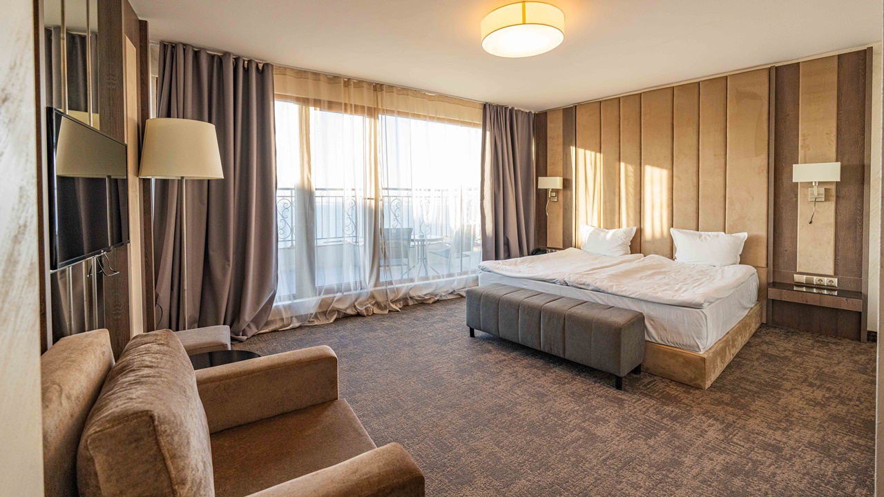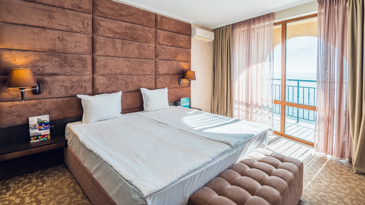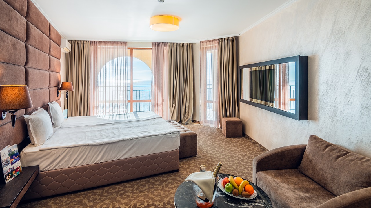 - двойна стая Делукс с частичен или фронтален изглед Море - Двойните стаи делукс с гледка море са с площ около 45 кв.м. и разполагат с комфортна king size спалня, разтегателен фотьойл, богат асортимент на артикули в Мини Бара, интерактивна Телевизия и WiFi достъп, гардероб, климатична система с контрол, сешоар и тоалетни принадлежности, blackout завеси и тераса с прекрасна гледка към морето и басейна