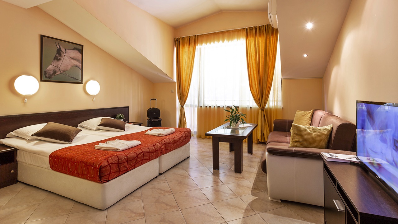 - двойна стая с балкон - хотелът разполага с 19 стаи с балкон, с квадратура от 35 кв. м. стаята предлага на разположение спалня или две отделни легла, разтегателен двоен диван, бани захранени с минерална вода, мека и удобна мебел, телевизор, кабелна телевизия, хладилник, сешоар, халат, безплатен безжичен интернет, балкон