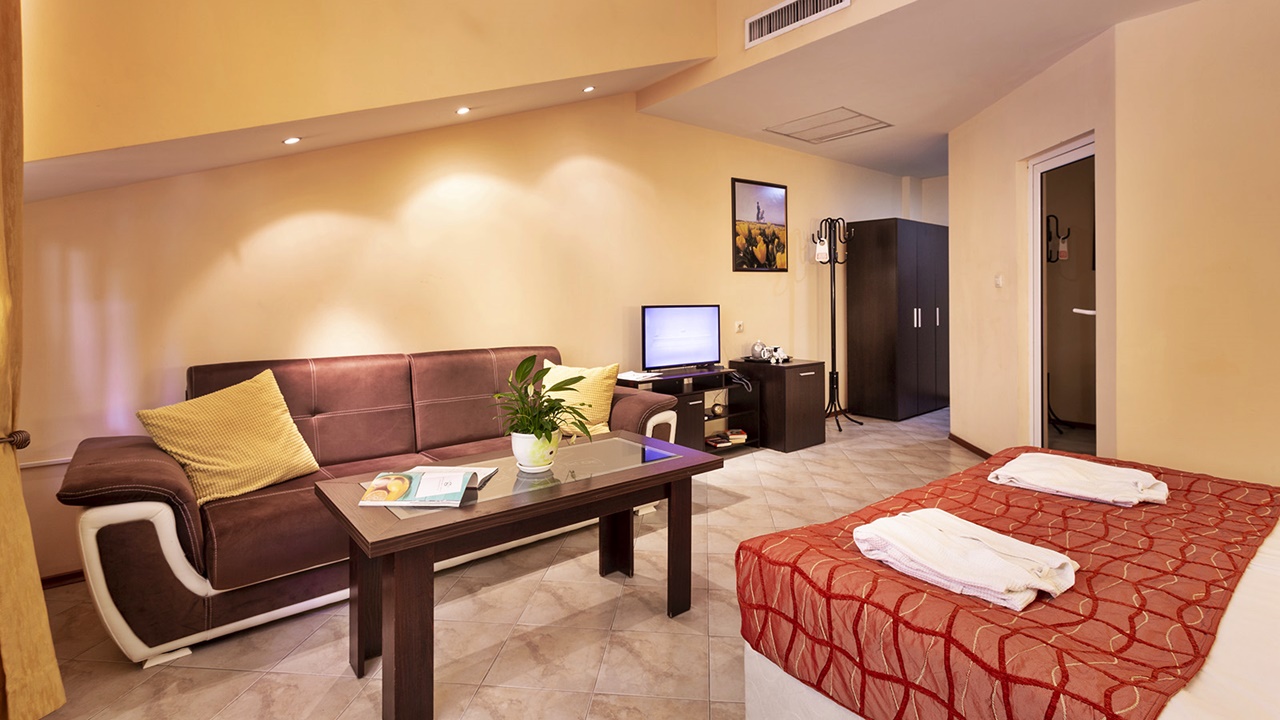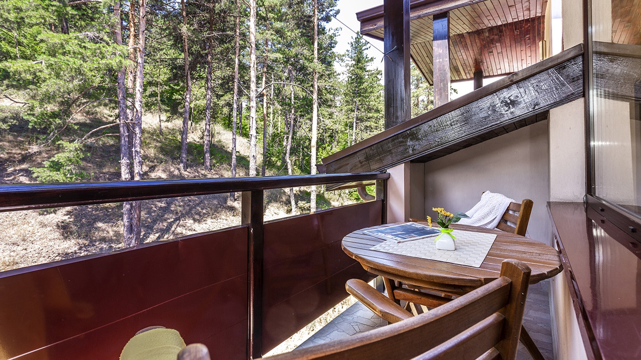 - апартамент с балкон - хотелът разполага с 4 бр. апартаменти, обзаведени в изчистен стил, съчетаващ модерно и в същото време придаващ чувство за домашен уют интериор. С невероятна гледка към необятната планинска шир. Разполагат с две помещения - комфортна спалня и хол с разтегателен двоен диван, баня захранена с минерална вода, вана, мека и удобна мебел, телевизор, кабелна телевизия, хладилник, сешоар, халат, безплатен безжичен интернет, балкон