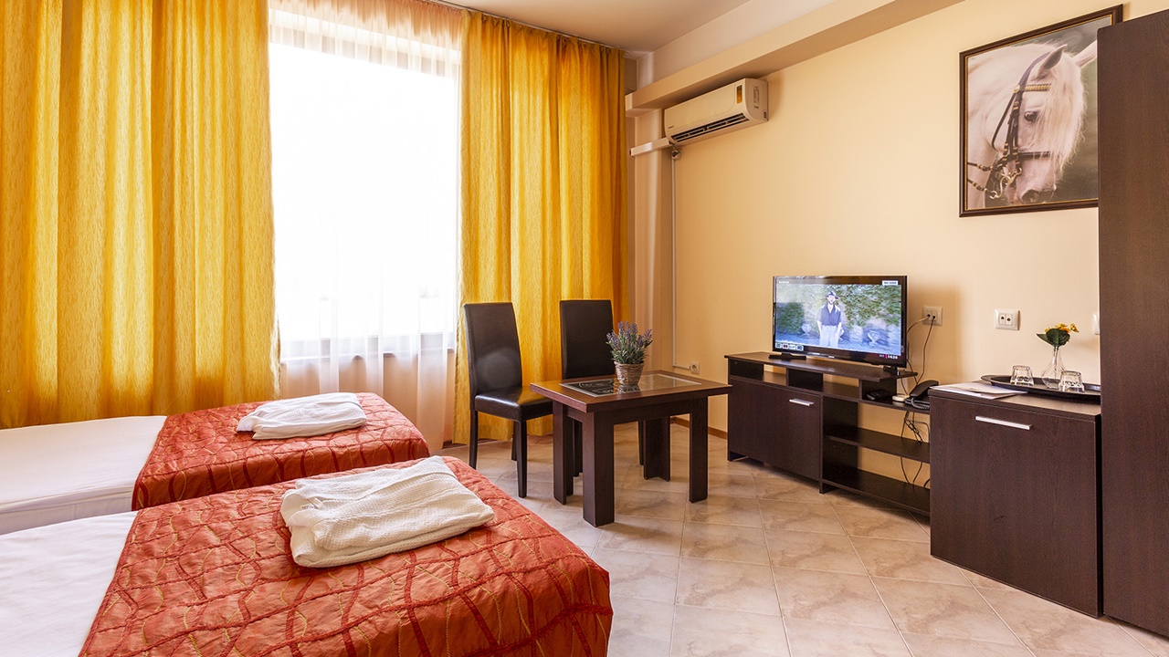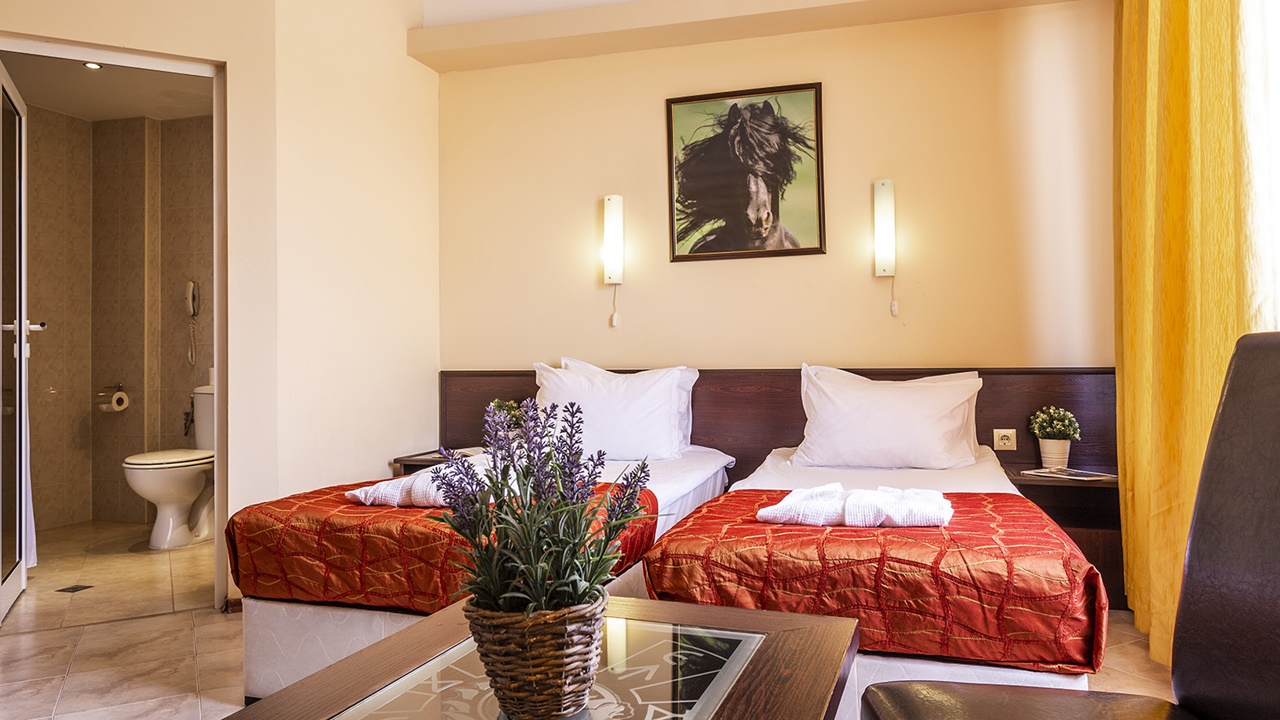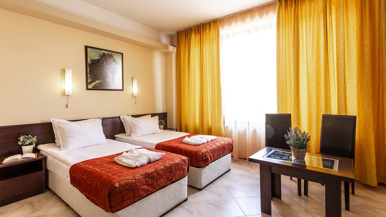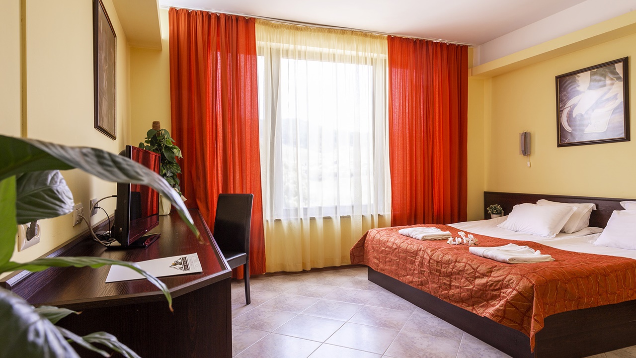 - двойна стая без балкон - хотелът разполага с 18 стаи без балкон, с квадратура от 29 кв. м. стаята предлага на разположение спалня или две отделни легла, разтегателен фотьойл/диванче, бани захранени с минерална вода, мека и удобна мебел, телевизор, кабелна телевизия, хладилник, сешоар, халат, безплатен безжичен интернет.