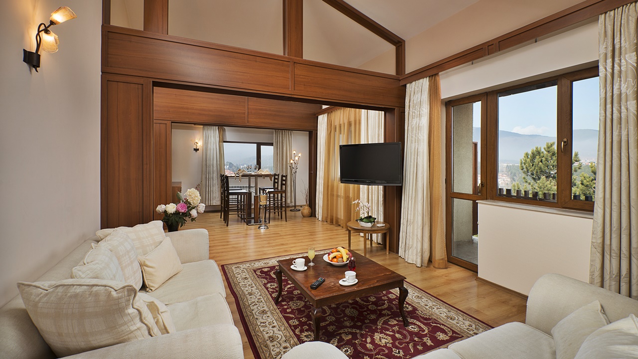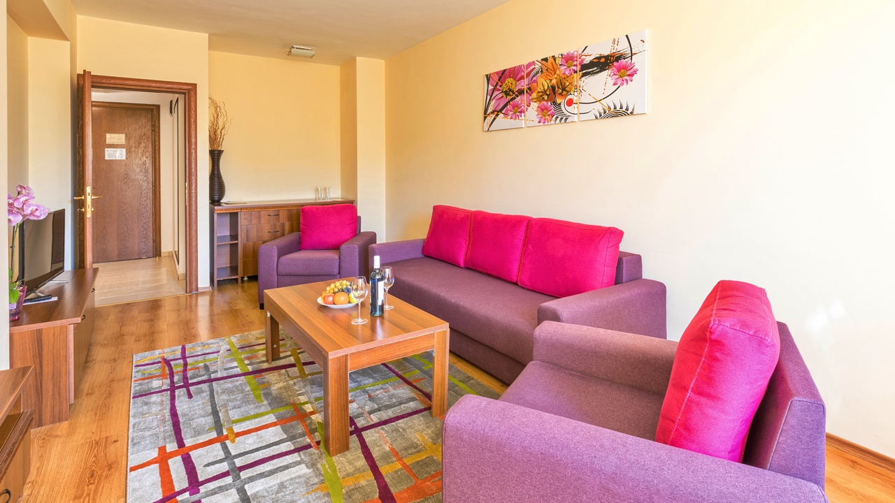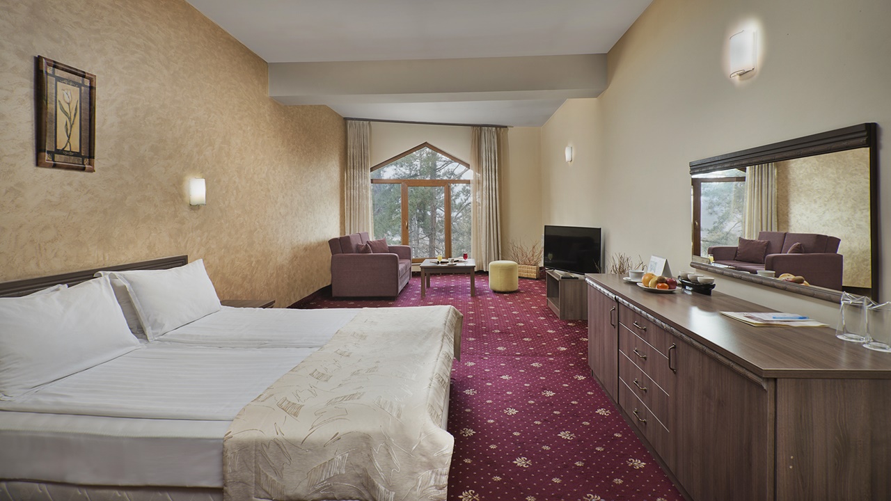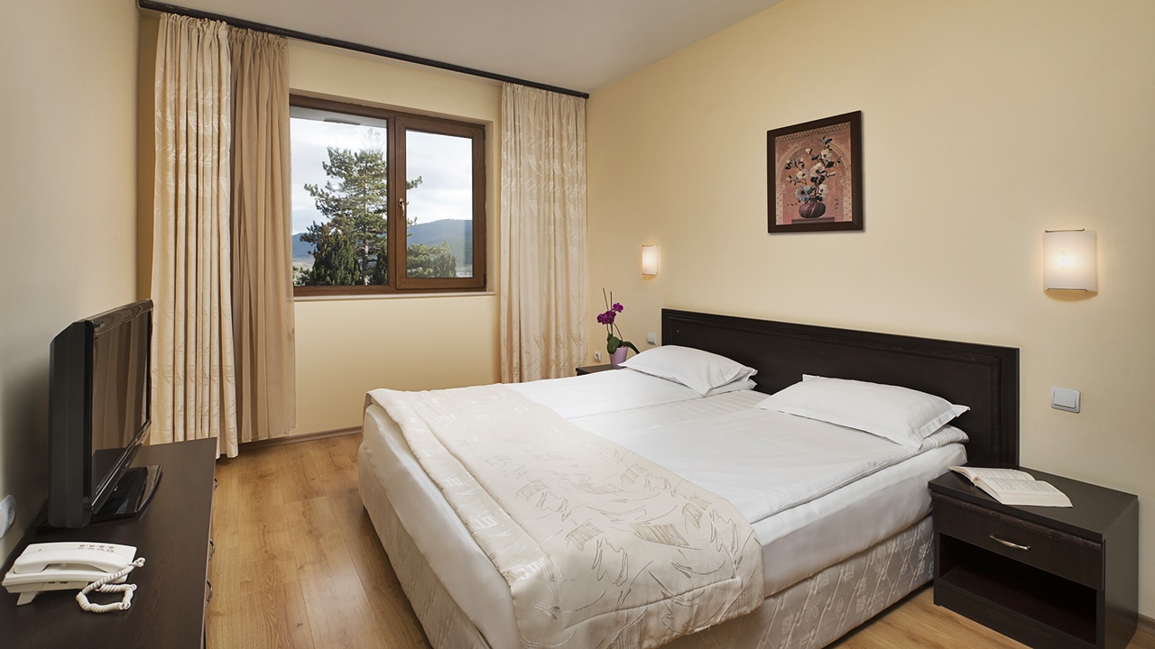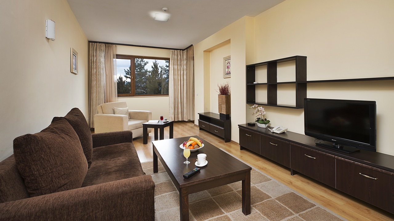 - апартамент - апартаментите са с площ около 68 кв.м. и разполагат със две помещения спалня с двойно легло и хол с разтегателен двоен диван с топ матрак с простор за допълнително легло при нужда, интернет, телевизор с плосък екран и сателитна телевизия, мини бар, уреди за кафе / чай, работно бюро, телефон в стаята, телефон в банята, вана в банята, сешоар в банята, балкон. Подарете си една незабравима почивка за цялото семейство в бутиков апартамент с тераса и изглед към гората или панорамна гледка към града.