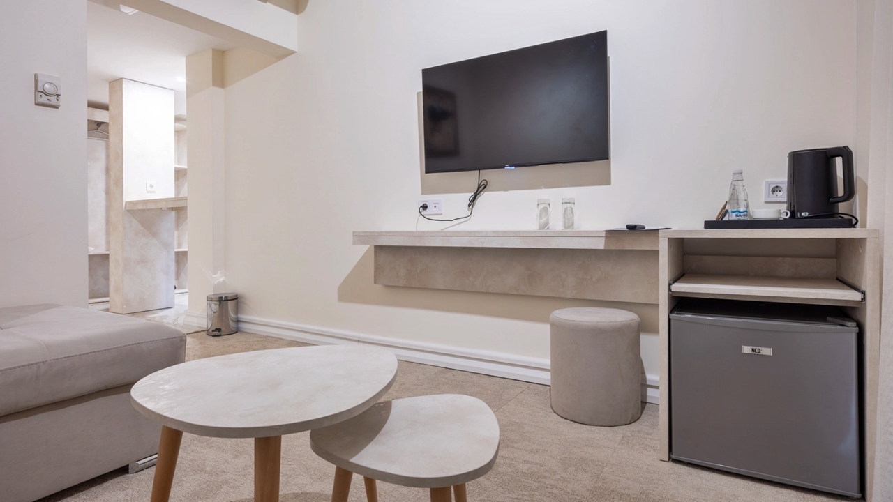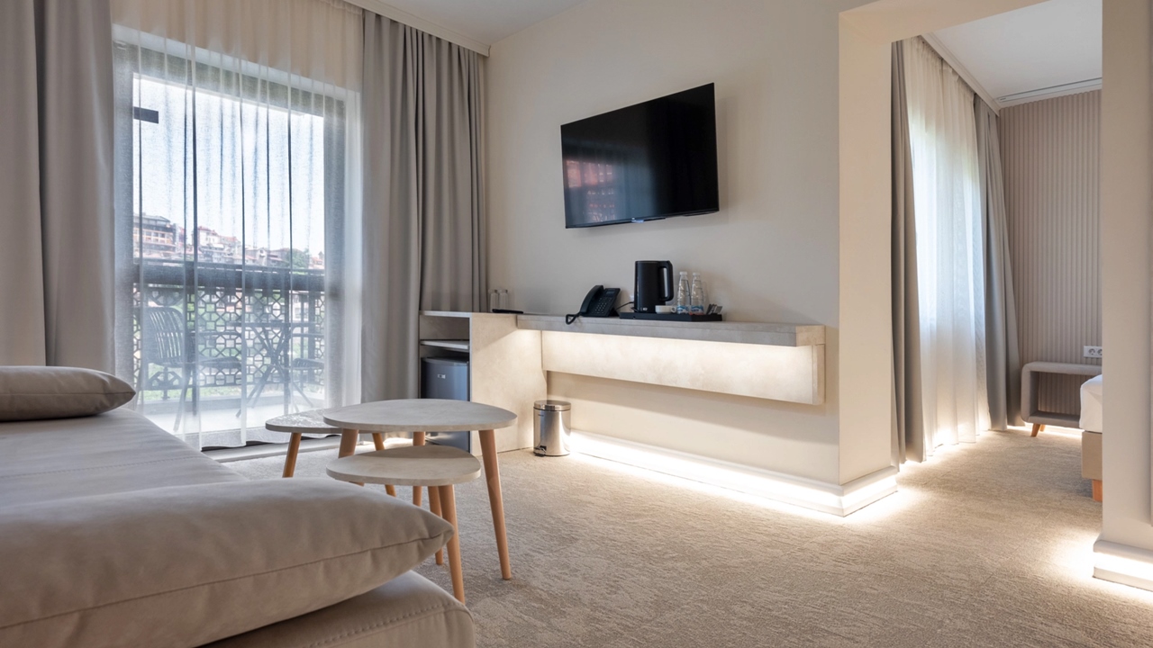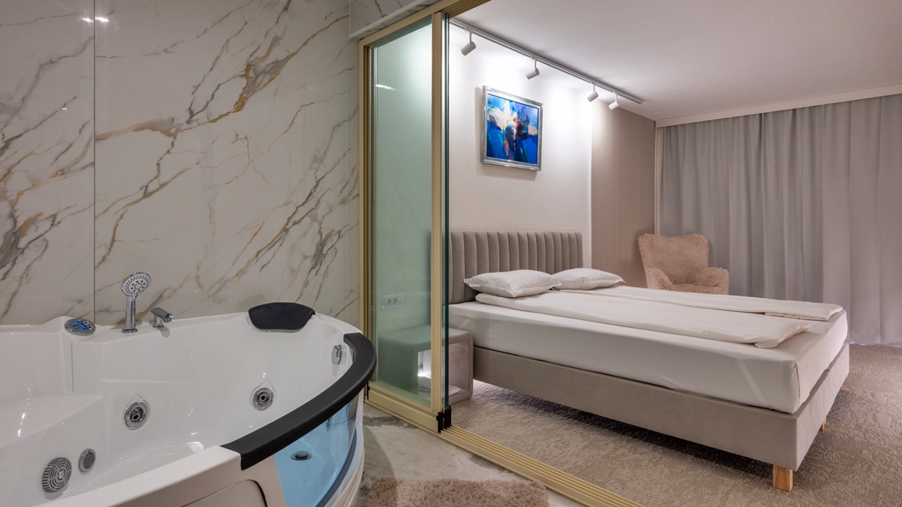 - апартамент - са с площ около 35 кв.м. и разполагат със спалня с двойно легло и дневнас разтегателен двоен диван, електрическа кана с комплимент кафе, чай и вода, хладилник, LED телевизор с интерактивна телевизия и wi-fi достъп, бюро, климатична система с контрол, телефон, халат за СПА, чехли за хотелската стая, баня с душ, сешоар, тоалетни принадлежности и хавлии. Помещенията са с балкон