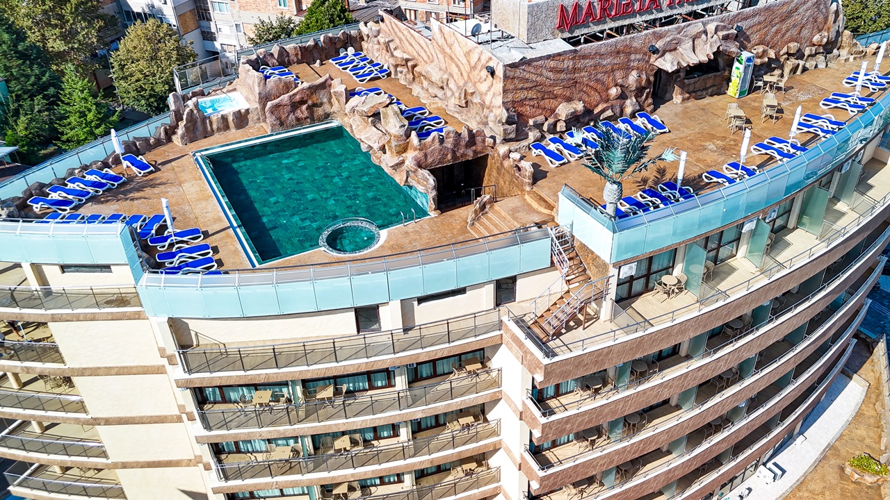 Хотел Мариета Палас, Несебър разполага с открит панорамен басейн с джакузи и слънчева тераса с шезлонги и чадъри, разположени на последния етаж на хотела - неотопляем, отворен в периода 01.06 - 30.09. В Релакс центъра има джакузи за 12 души, сауна, парна баня, хамам, солна стая и релакс зона. Разнообразните масажи и терапии ще ви помогнат да възстановите баланса на тялото и духа. Хотелът разполага още с отопляем вътрешен басейн (13х7 м) и детска водна зона, както и професионално оборудван фитнес център (500 м2), включващ зони за различни спортове и специализирана детска зона.