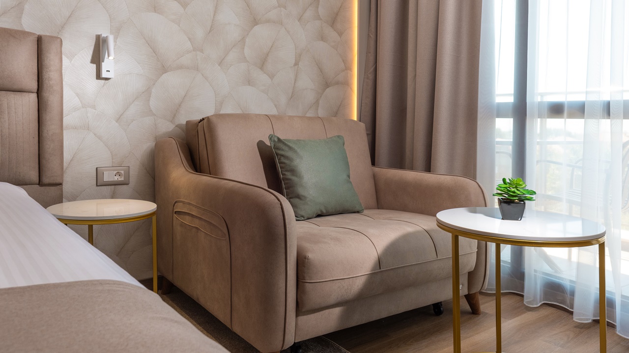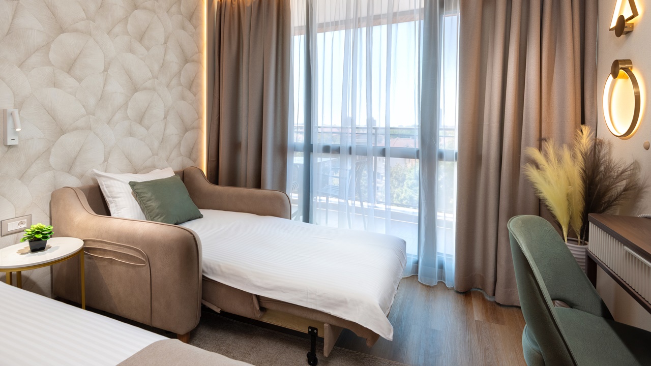 - Апартамент с 1 спалня - Приблизителна площ 36 м2. Апартаментите се състоят от две стаи - спалня и дневна, разделени с врата. В спалнята има едно двойно легло или две единични легла (позиционирани едно до друго), а в дневната - разтегателен диван (160см х 190см) или 2 разтегателни фотьойла. Обзаведени са с климатик, плоскоекранен телевизор, минибар, сейф, кафе машина, WiFi, баня с душ кабина, сешоар и тоалетни принадлежности, тераса.