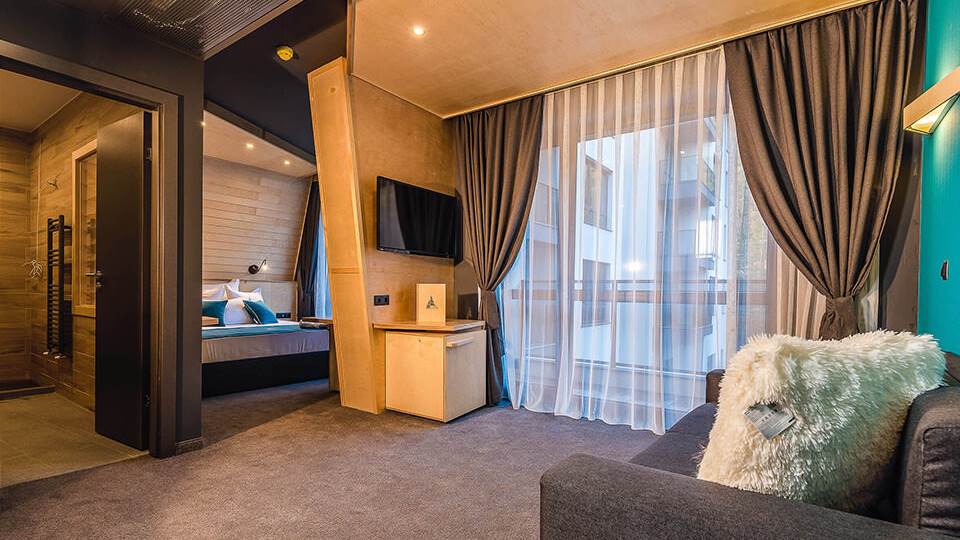 • ВИП апартамент - Апартаментът е мезонетен с квадратура 100 кв.м., изглед към басейн/планина, 2 бр. спални, разтегателен двоен диван, 2 бр. душ кабини и тоалетни, собствена сауна, балкон. VIP Паркинг: Осигурени парко-места непосредствено пред входа на хотела!