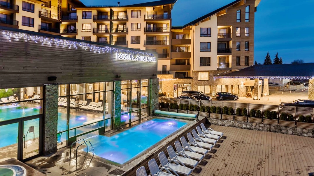 • апартамент с 2 спални делукс - Апартаментът е мезонетен с квадратура 95-100 кв.м., изглед към басейн/планина, 2 спални, разтегателен двоен диван, 2 бр. душ кабини, балкон. Състоящ се от две самостоятелни спални и просторен хол с огромна тераса. VIP Паркинг: Осигурени парко-места непосредствено пред входа на хотела!