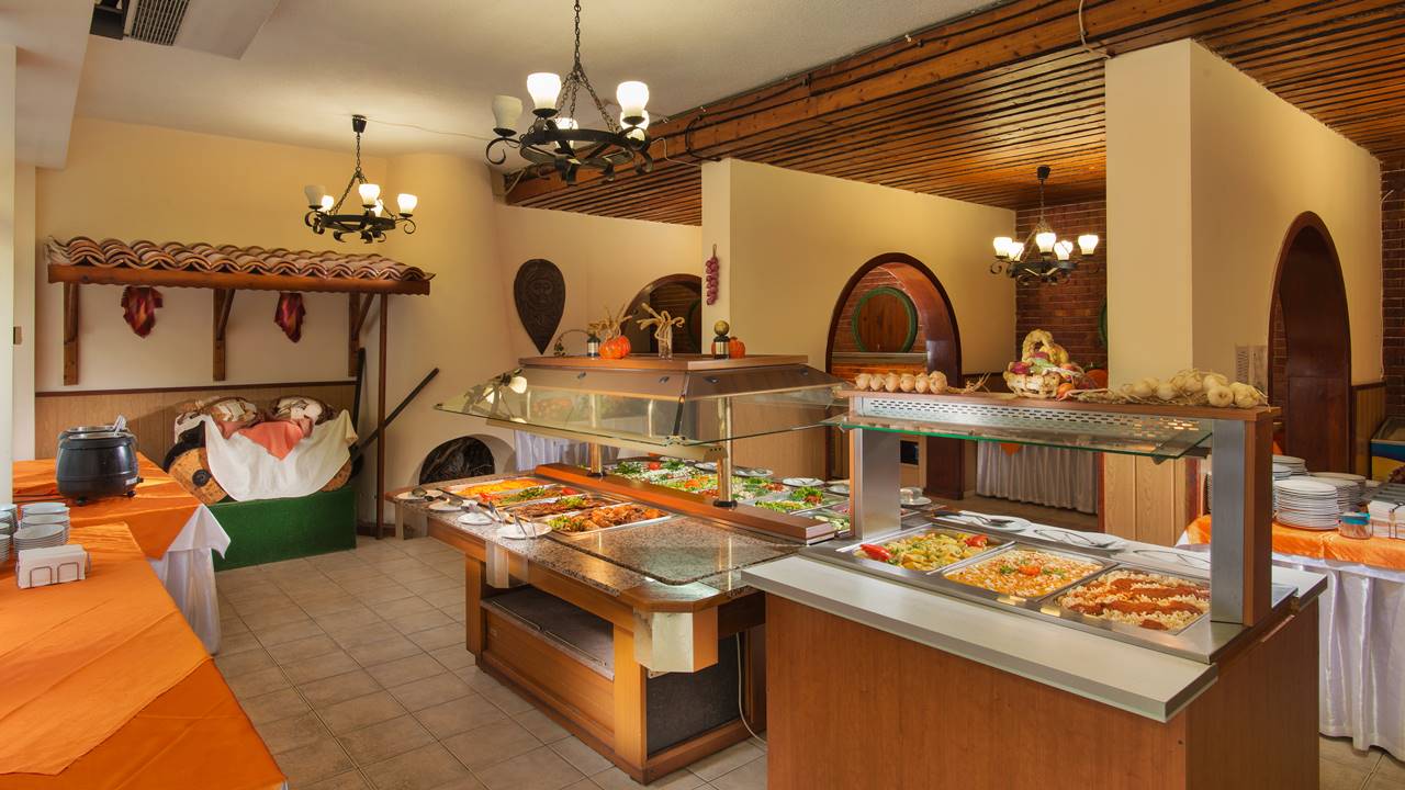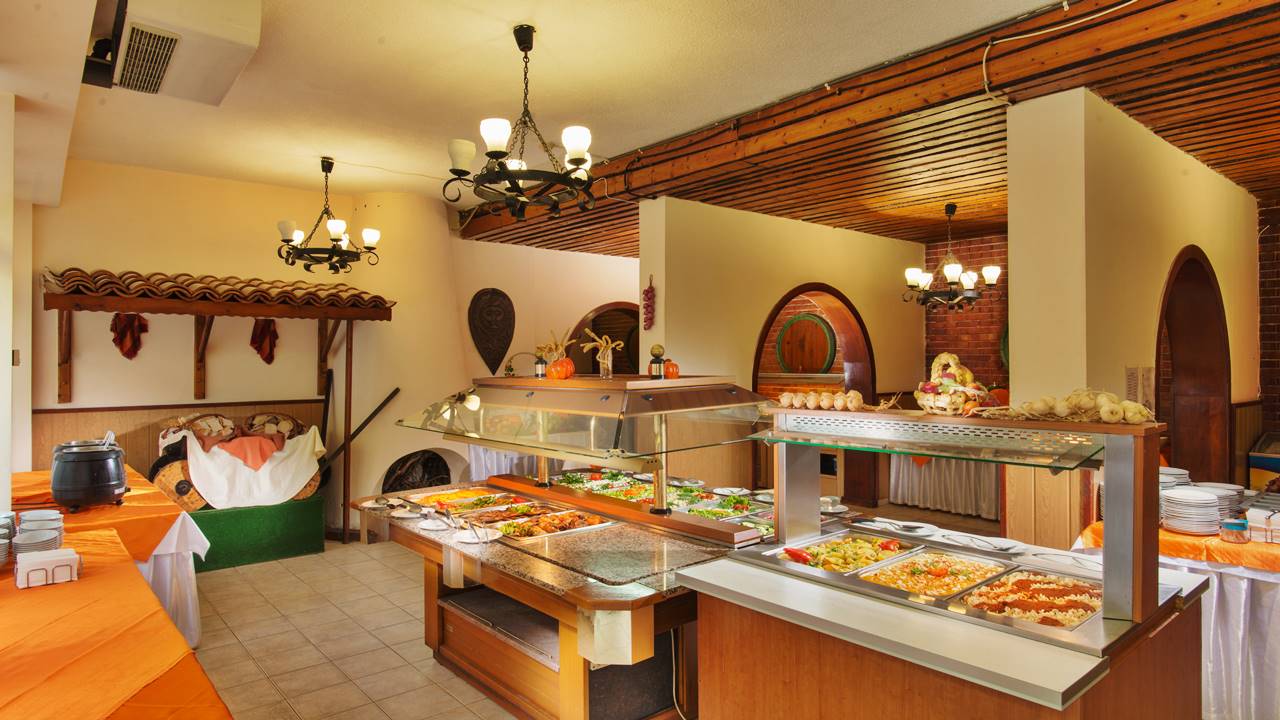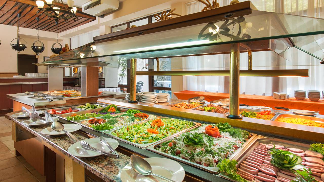• Вечеря (18:30 - 21:00) на блок маса: салатен бар, топла и студена супа, месни и безмесни основни ястия, топли и студени гарнитури, сезонни плодове и зеленчуци, дресинги, спагети или друг вид паста, тестени десерти и кремове, напитки