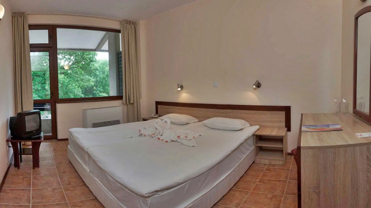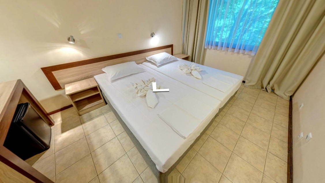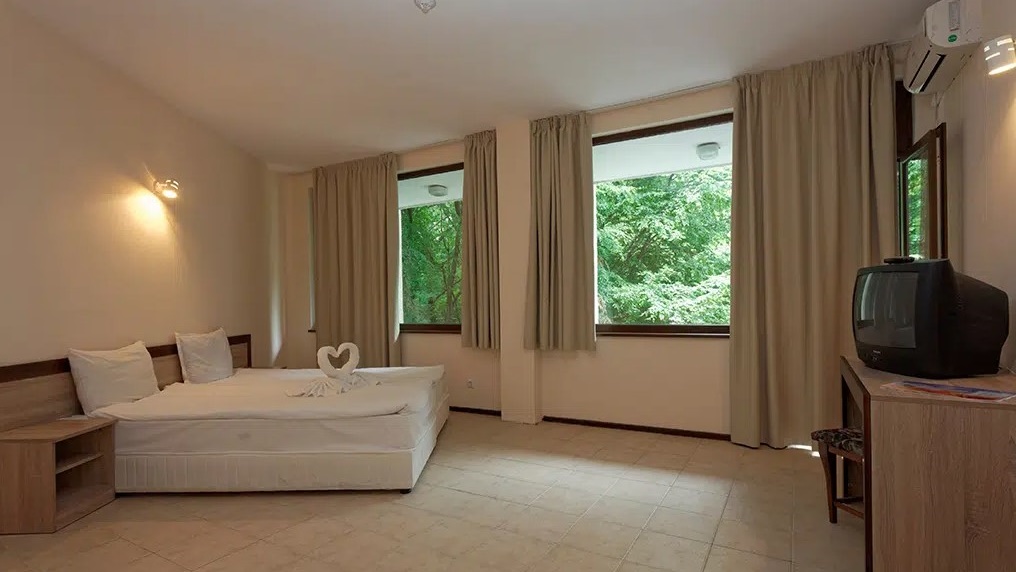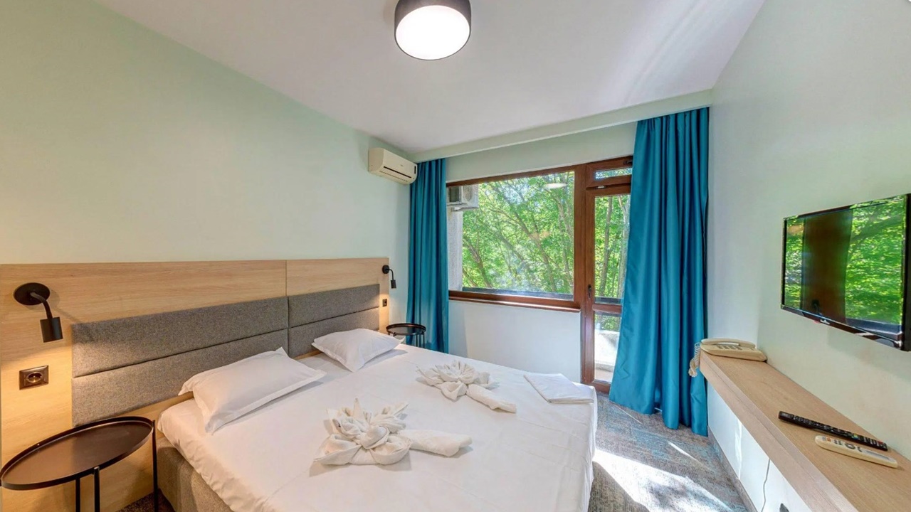 • Двойните стаи (19-24 кв.м.) са приятно обзаведени и разполагат със спалня (2м./2м.) или две единични легла (1м./2м.), 1 допълнително легло, душ, тоалетна, балкон с маса и 2 стола, кабелна телевизия, хладилник, климатик, гардероб, тоалетка/бюро и телефон