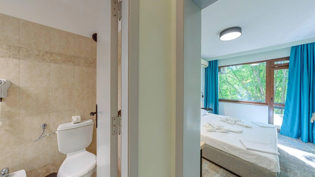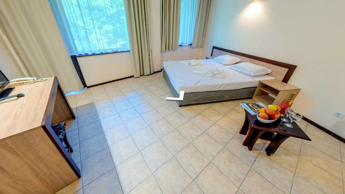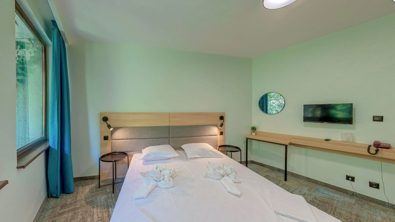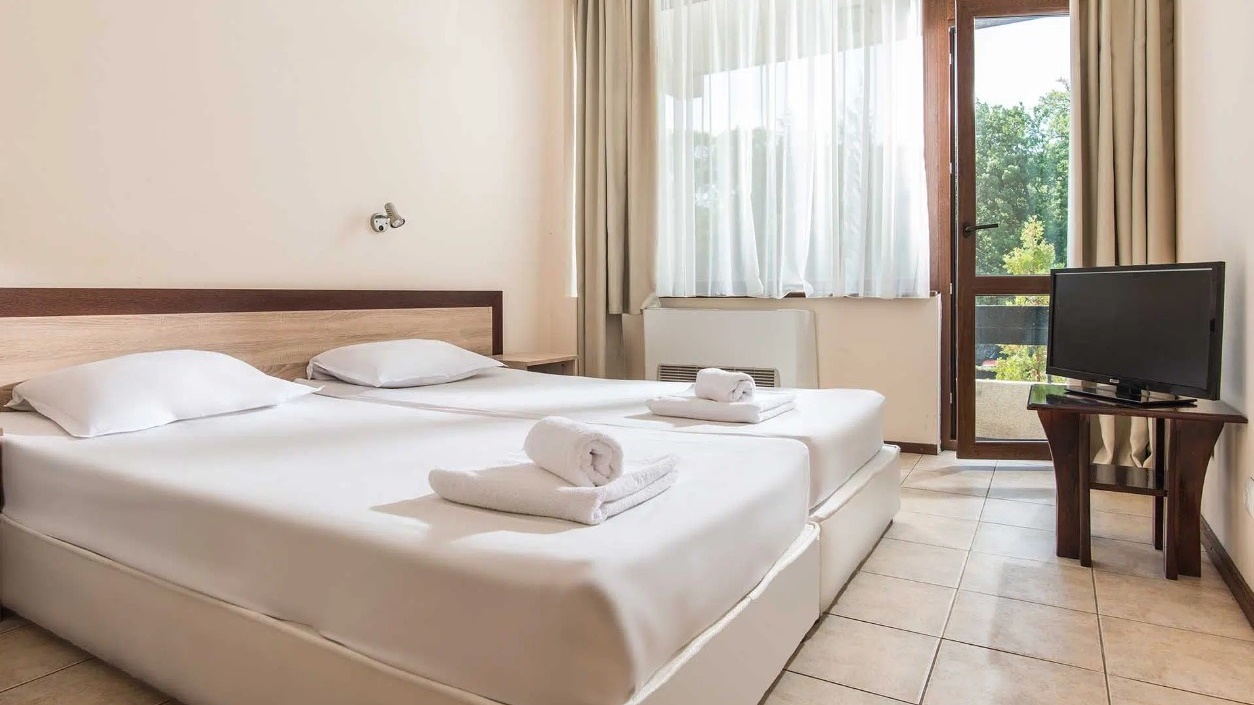 • Двойните стаи (19-24 кв.м.) са приятно обзаведени и разполагат със спалня (2м./2м.) или две единични легла (1м./2м.), 1 допълнително легло, душ, тоалетна, балкон с маса и 2 стола, кабелна телевизия, хладилник, климатик, гардероб, тоалетка/бюро и телефон