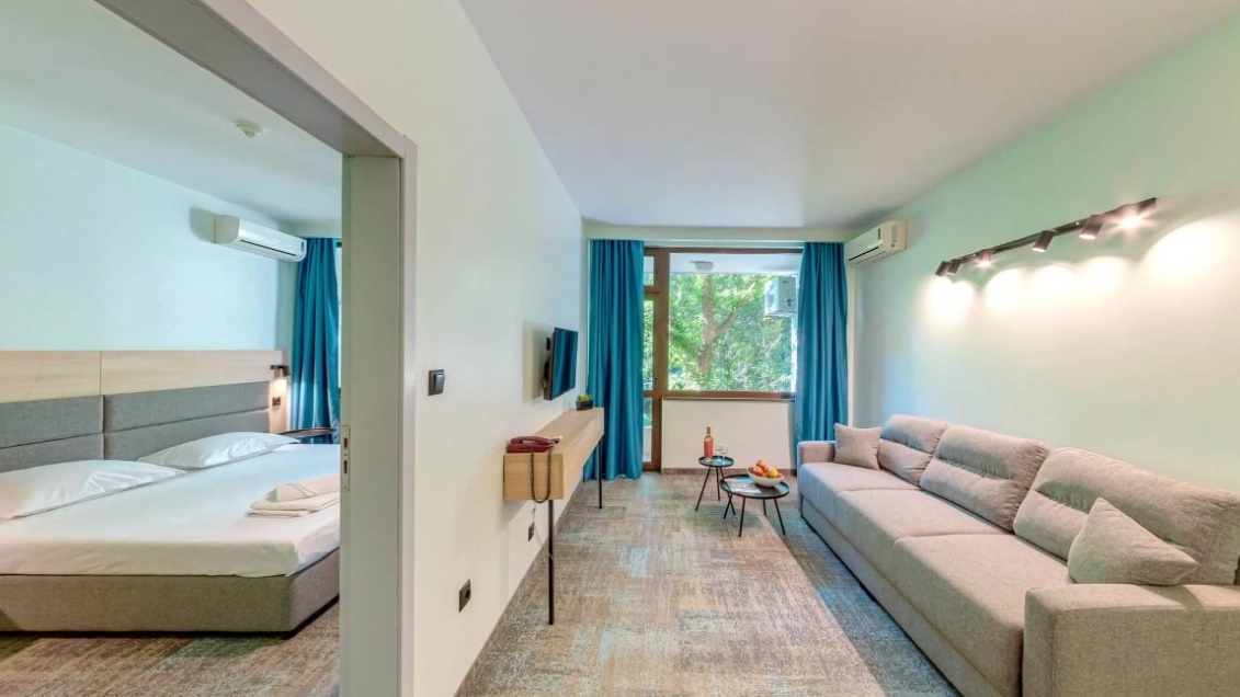 • Двойните стаи Делукс (19-24 кв.м.) са реновирани и луксозно обзаведени, разполагат със спалня (2м./2м.) или две единични легла (1м./2м.), 1 допълнително легло, душ кабина, сешоар, тоалетна, балкон с маса и 2 стола, HD телевизор, кабелна телевизия, хладилник, климатик, гардероб, тоалетка/бюро и телефон