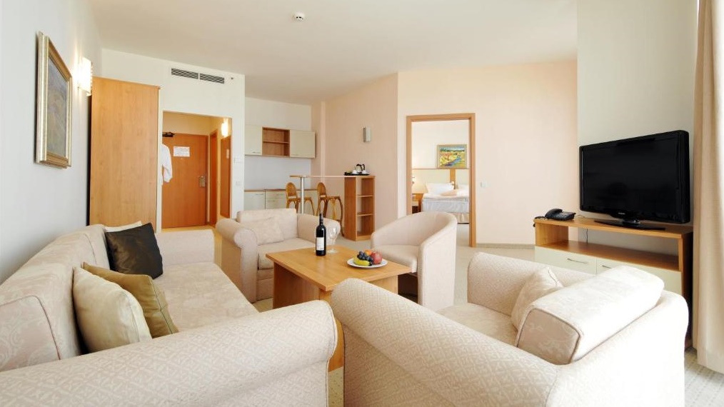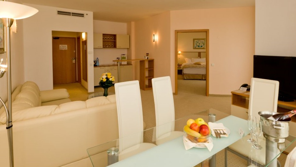 - апартамент с 1 спалня - Едноспалните апартаменти са с площ 65 кв. м., разполагат със спалня и дневна с разтегателен ъглов диван, възможност за добавяне на допълнително легло, матрак Sweet Dreams, удобен работен кът, 32-инчов HD LCD телевизор, сервиз за приготвяне на чай, ютия и дъска за гладене, баня с вана или душ, халати, тераса, тоалетни принадлежности, чехли