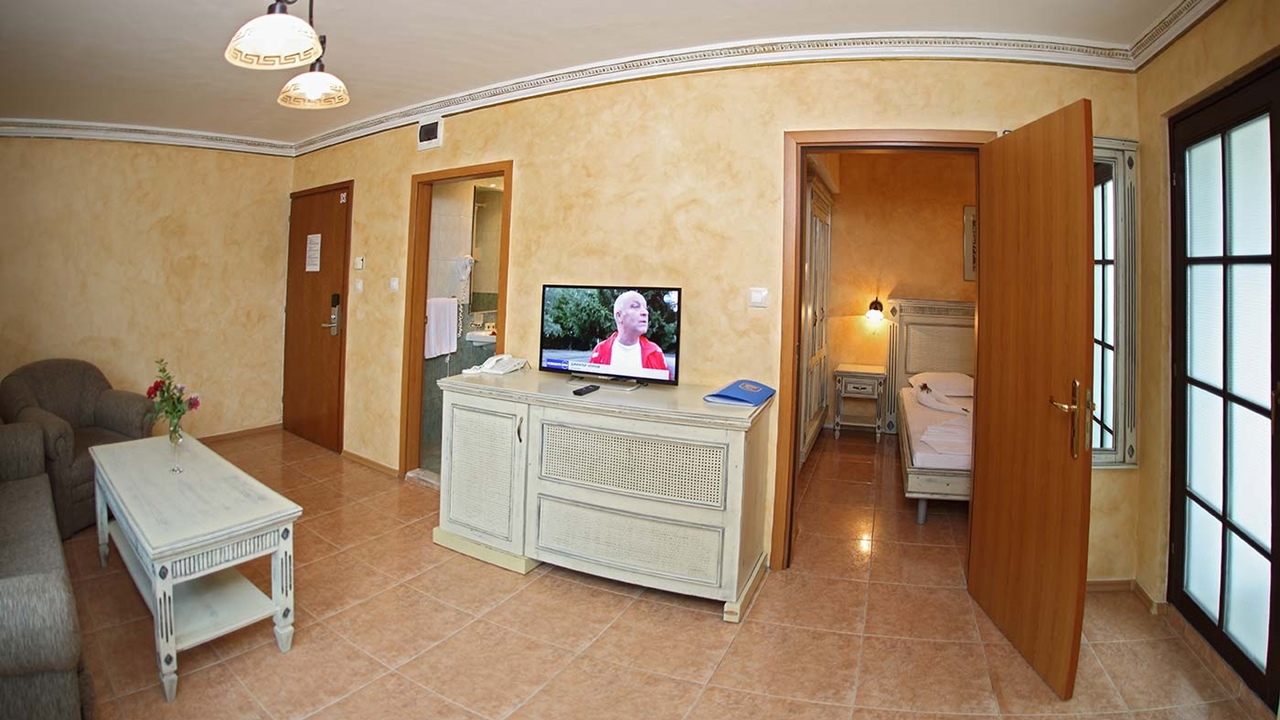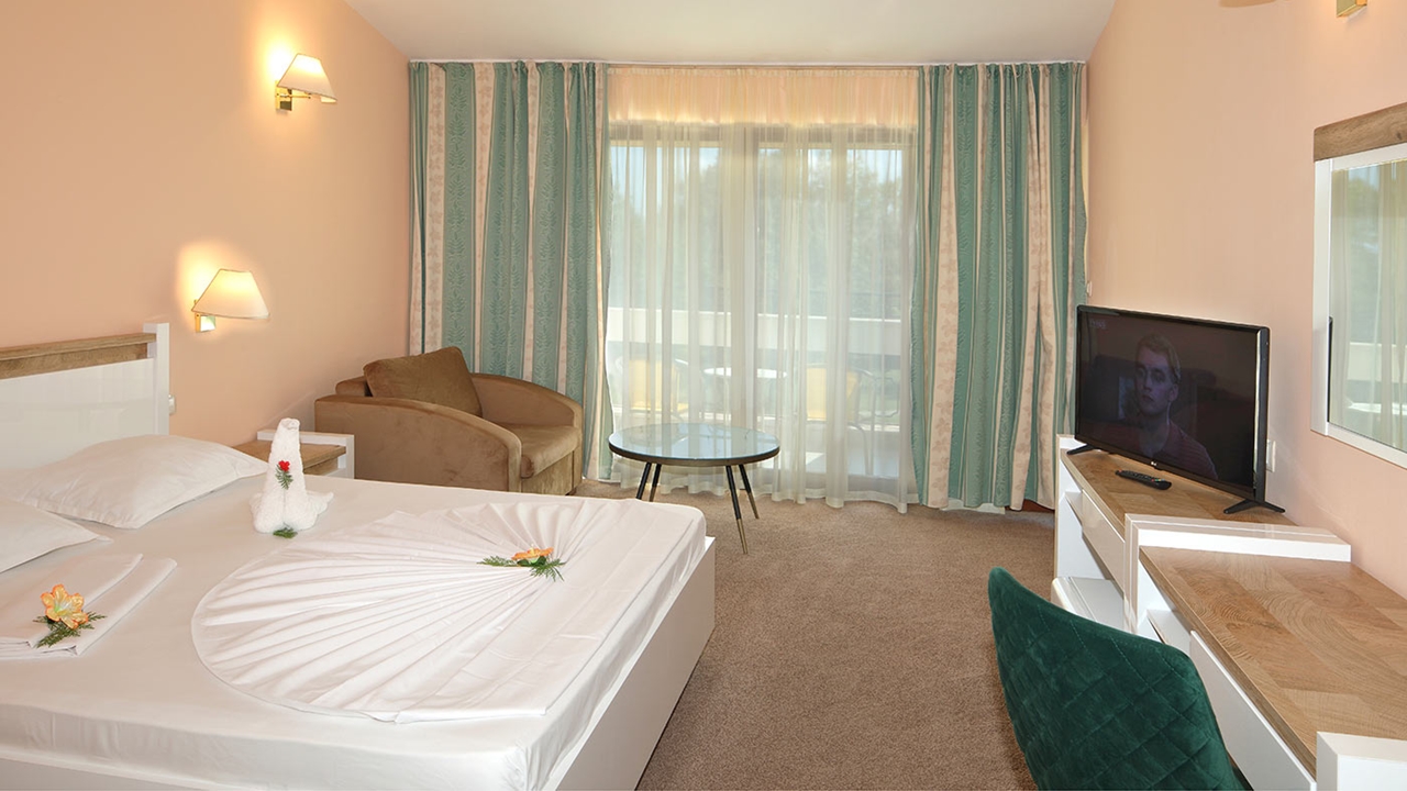 - двойна стая Супериор - 26 кв.м. Помещението разполага със спалня и едно допълнително легло под формата на разтегателен фотьойл. Стаите са напълно обновени. Може да бъде по избор с гледка към парка или частична гледка към морето