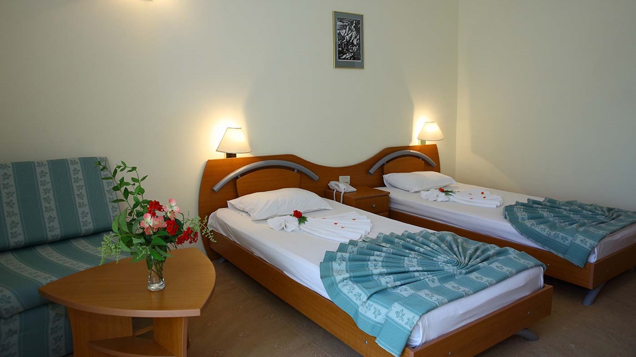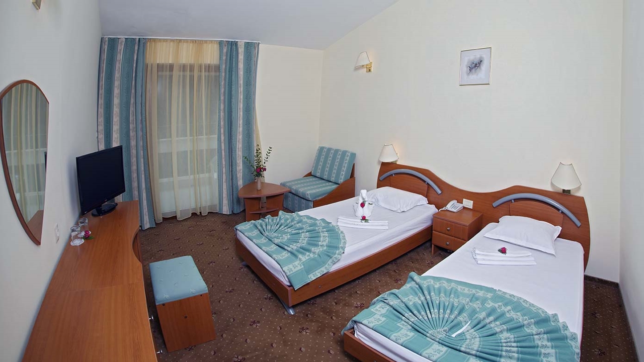 - двойна стая Стандарт - 26 кв.м. Помещението разполага с две единични легла, които при желание на гостите могат да бъдат събрани, и едно допълнително легло под формата на разтегателен фотьойл. Може да бъде по избор с гледка към парка или частична гледка към морето
