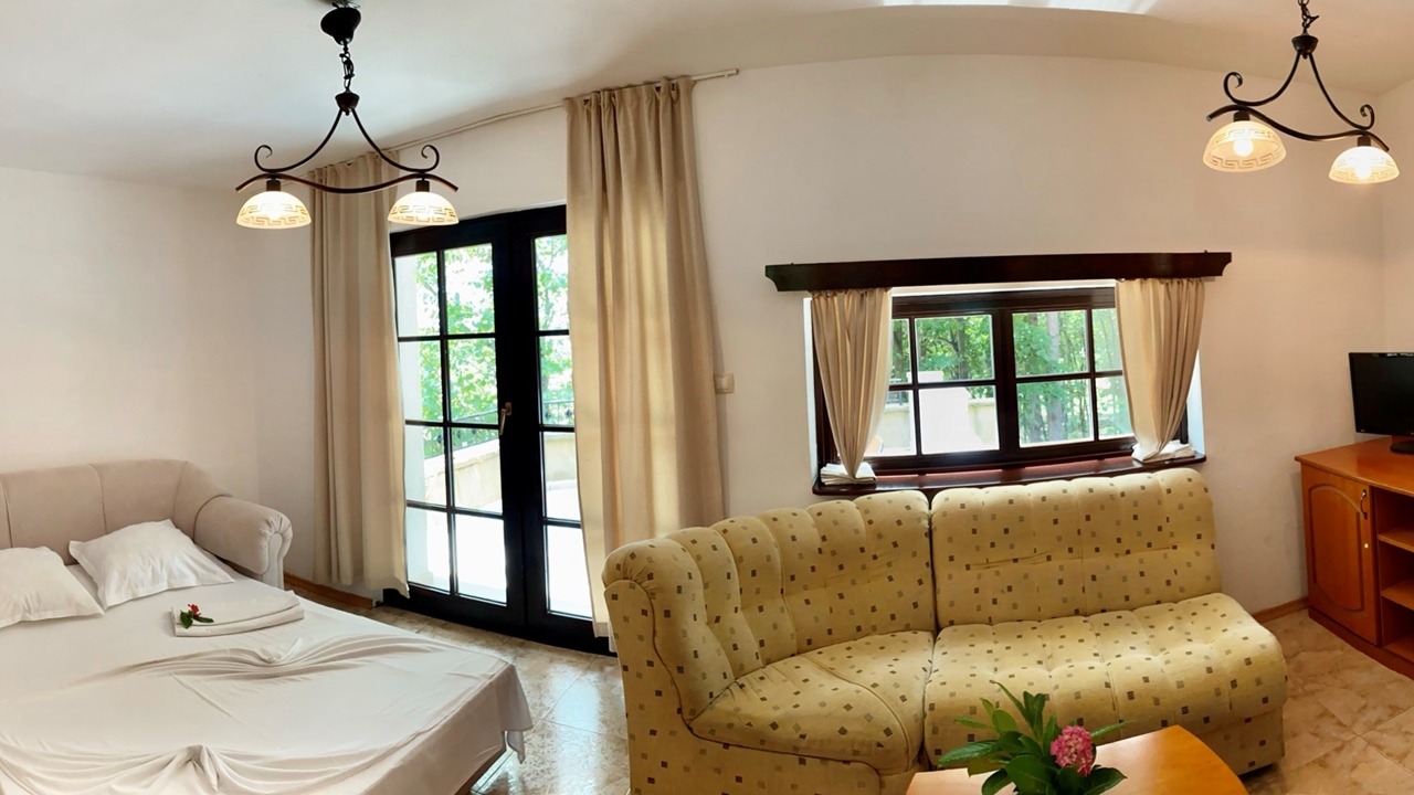 - Апартамент Парк - 38-40 кв.м. Състои се от две преходни помещения с междинна врата - хол с кът за сядане с двоен разтегателен диван и спалня с голямо легло. Апартаментите са с гледка към парка.