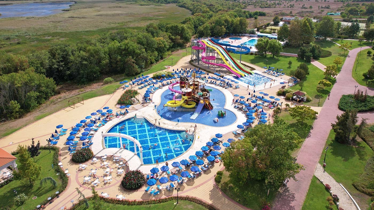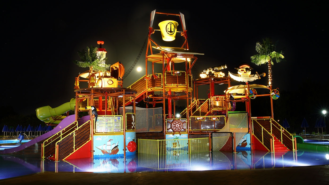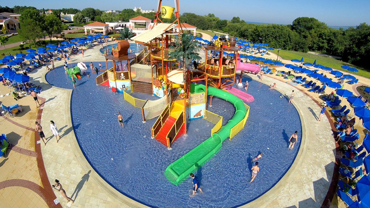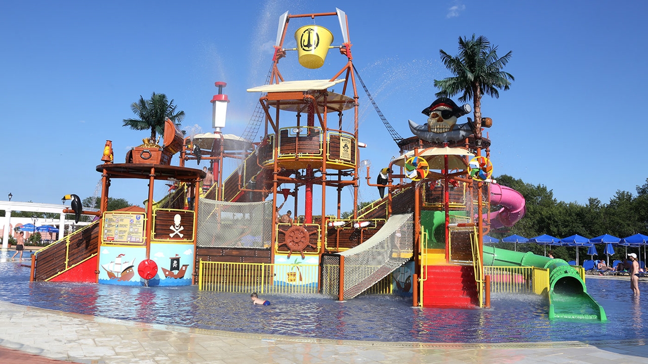 - 2 детски зони с плитки басейни за деца, пиратски кораб с малки пързалки