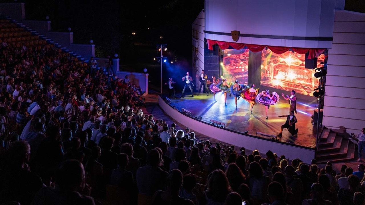 - за възрастни - Голям интернационален екип, Турнири, Забавни игри, Игри в басейна, Аква сплеш, Клубен танц, Уникални вариететни шоу програми с професионални декори и костюми, създадени от собствен хореограф и изпълнявани от професионални танцьори, Амфитеатър с капацитет 1600 души, с професионално звуково и осветително оборудване, Международно скеч-шоу, Шоу с гостите, Фолклорно шоу (фолклорна музика и танци), Всяка седмица парти на плажа или на Аква парка с много изненади, Тематични парти вечери, Открита дискотека - от понеделник до събота вкл. от 22:30 до 00:00 ч.
