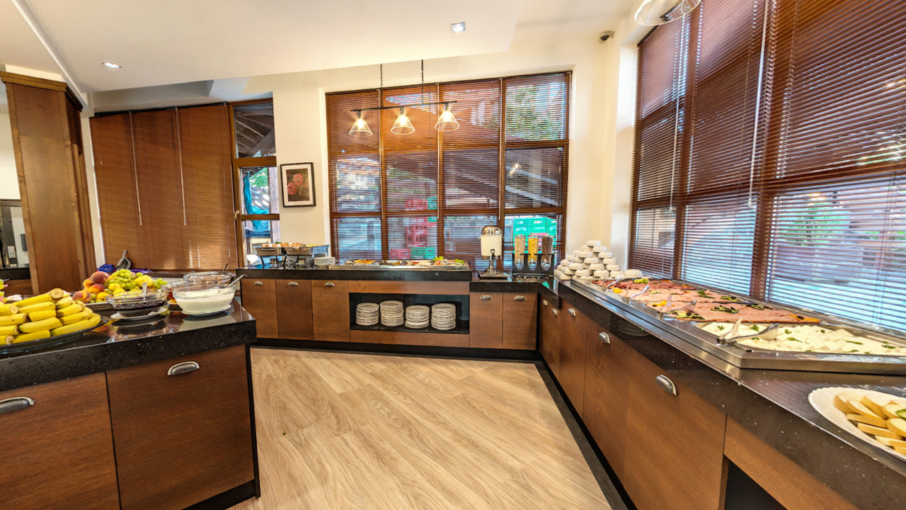 • 08.00 – 10.00 ч. – Закуска на блок-маса /прясно изпечен хляб и тестени закуски, масло, топъл блок - яйчни специалитети, английска закуска, бекон, мекички, палачинки, пържени филийки, домашна баница, макаронени изделия, студени колбаси и сирена, солени и сладки закуски, конфитюри, компоти, медена пита, зърнени закуски и корнфлейкс, кисело мляко, сушени плодове, пресни сезонни плодове и зеленчуци, плодово мляко, ниско-маслени храни/ Шоу-кукинг станция - специално предложение за деня, изготвено от нашия главен готвач